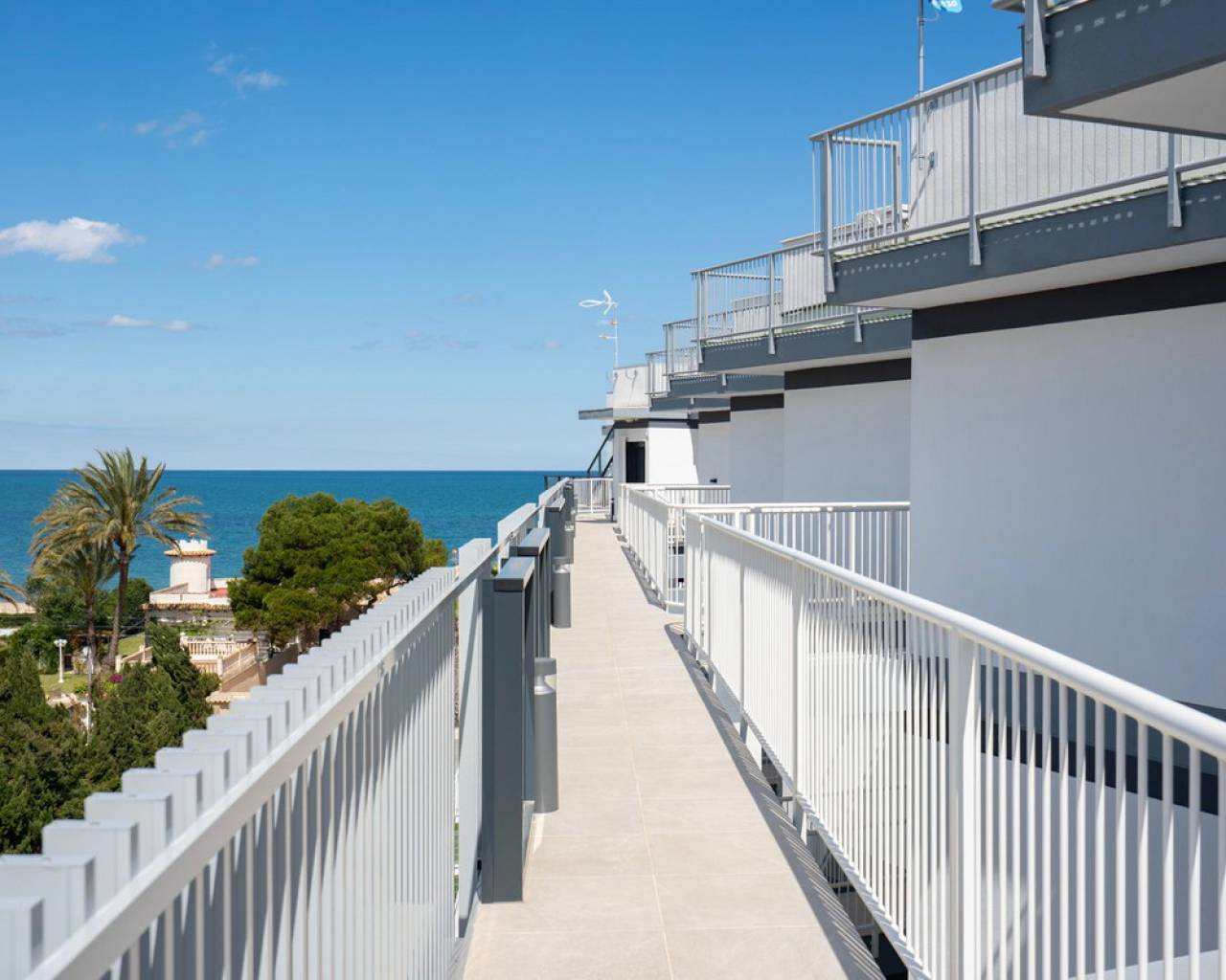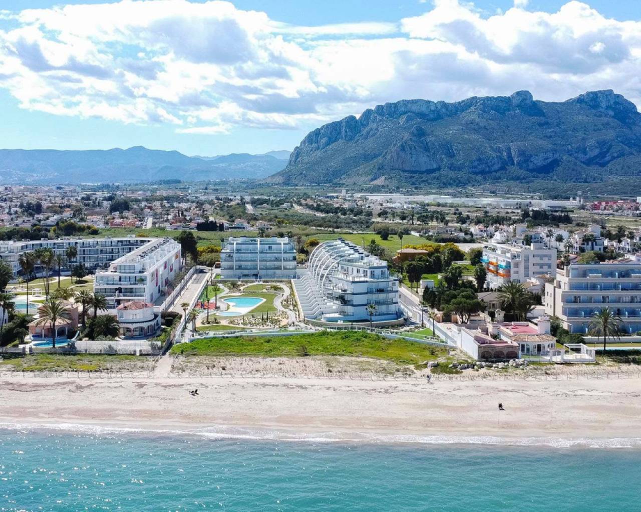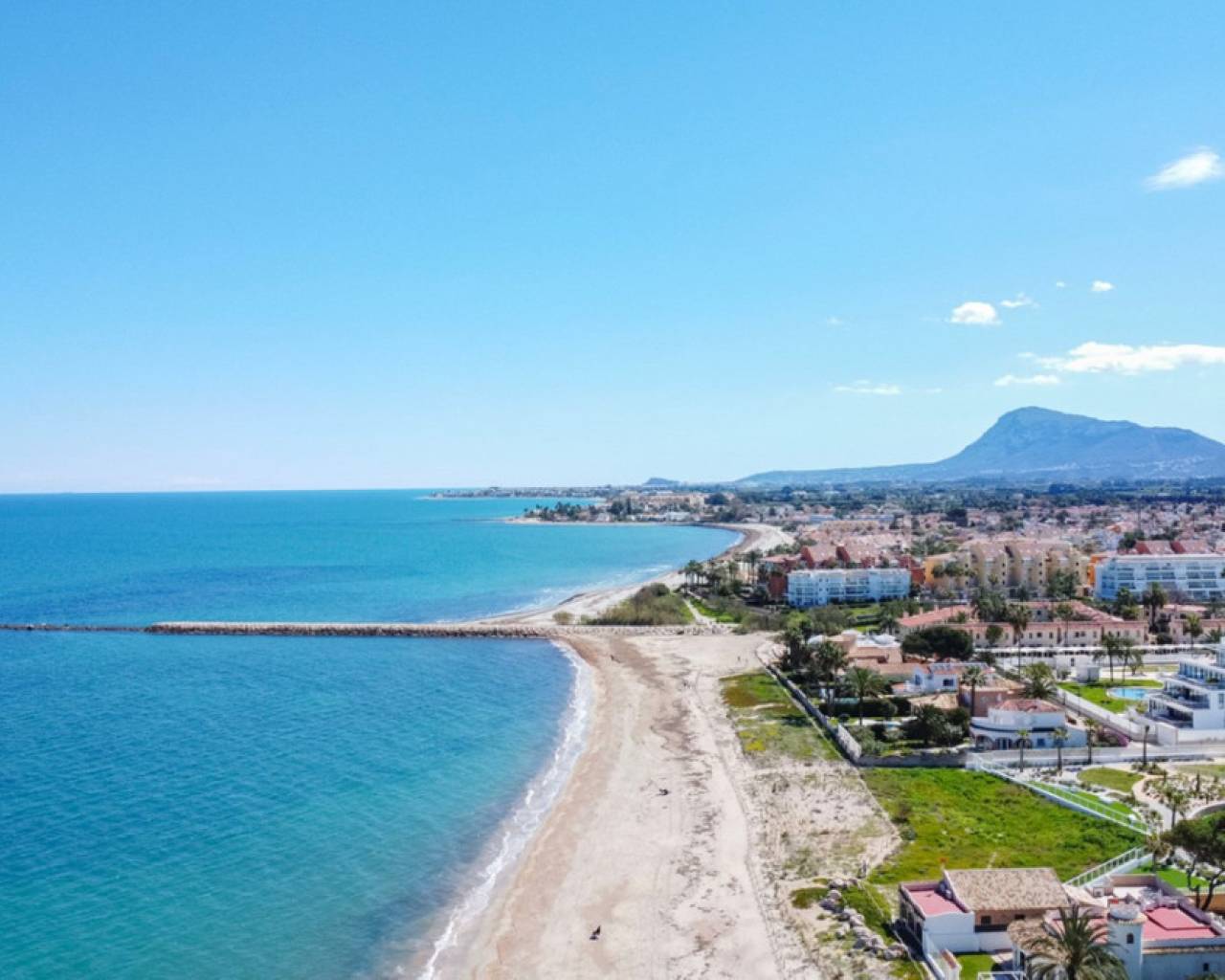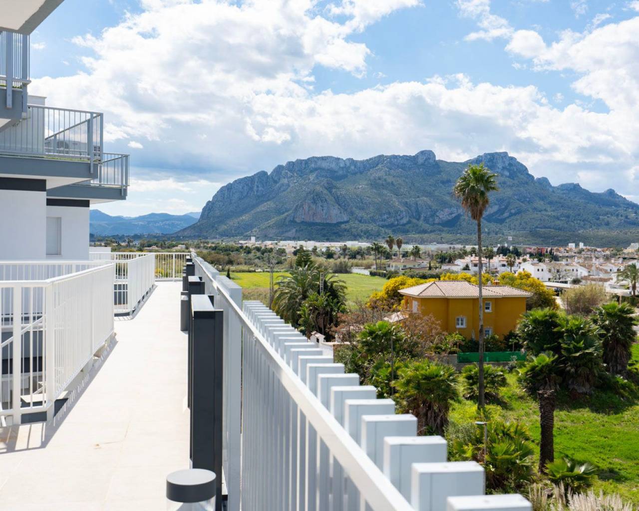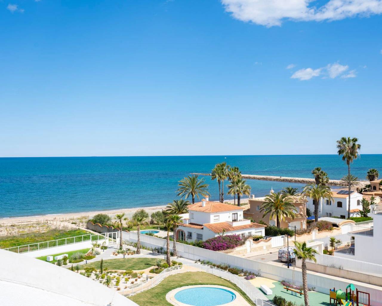 Fantastic luxury penthouse with panoramic sea views, located on the sandy beach of Playa de la Almadraba, in the modern Taylor Wimpey Bella Beach complex. This exclusive penthouse has stunning sea views from all rooms and also features a rooftop terrace of no less than 94.85 m2 where you can enjoy spectacular 360° views. To the east, the coastline stretches to Gandía, to the west the towers of the Montgó mountain, to the north you can see the sea directly, and to the south it overlooks the impressive Sierra de Segaria. With a usable area of 84.90 m2 and a terrace of 51.46 m2 on the same floor, this penthouse offers space and comfort. It features an elegant hallway with a spacious double bedroom to the left and a bathroom to the right. The hallway leads to a living room, where the spectacular sea view immediately captures attention and where sliding windows give access to the terrace. The modern, fully equipped kitchen is located next to the living room and also has direct access to the terrace. Further down the hallway is a second double bedroom with access to the terrace, and at the end of the hallway is the master bedroom with an en-suite bathroom, dressing room, and also direct access to the terrace. The penthouse is equipped with air conditioning for heating and cooling, and all windows are fitted with electric shutters. It is sold fully furnished, allowing you to move in immediately. On the terrace, there is also a handy storage room and a built-in closet with a washing machine. Additionally, you will have a private parking space and an independent storage room of 7.15 m² in the underground garage. The location is ideal: you will enjoy total tranquility and privacy, while the bustling Denia with its vibrant restaurants, shops, and marina is only a 15-minute drive away. This unique penthouse is part of a new complex completed in 2024, giving you the opportunity to have your hands on a dream home ready to move in, as good as new. Contact us today for a visit.