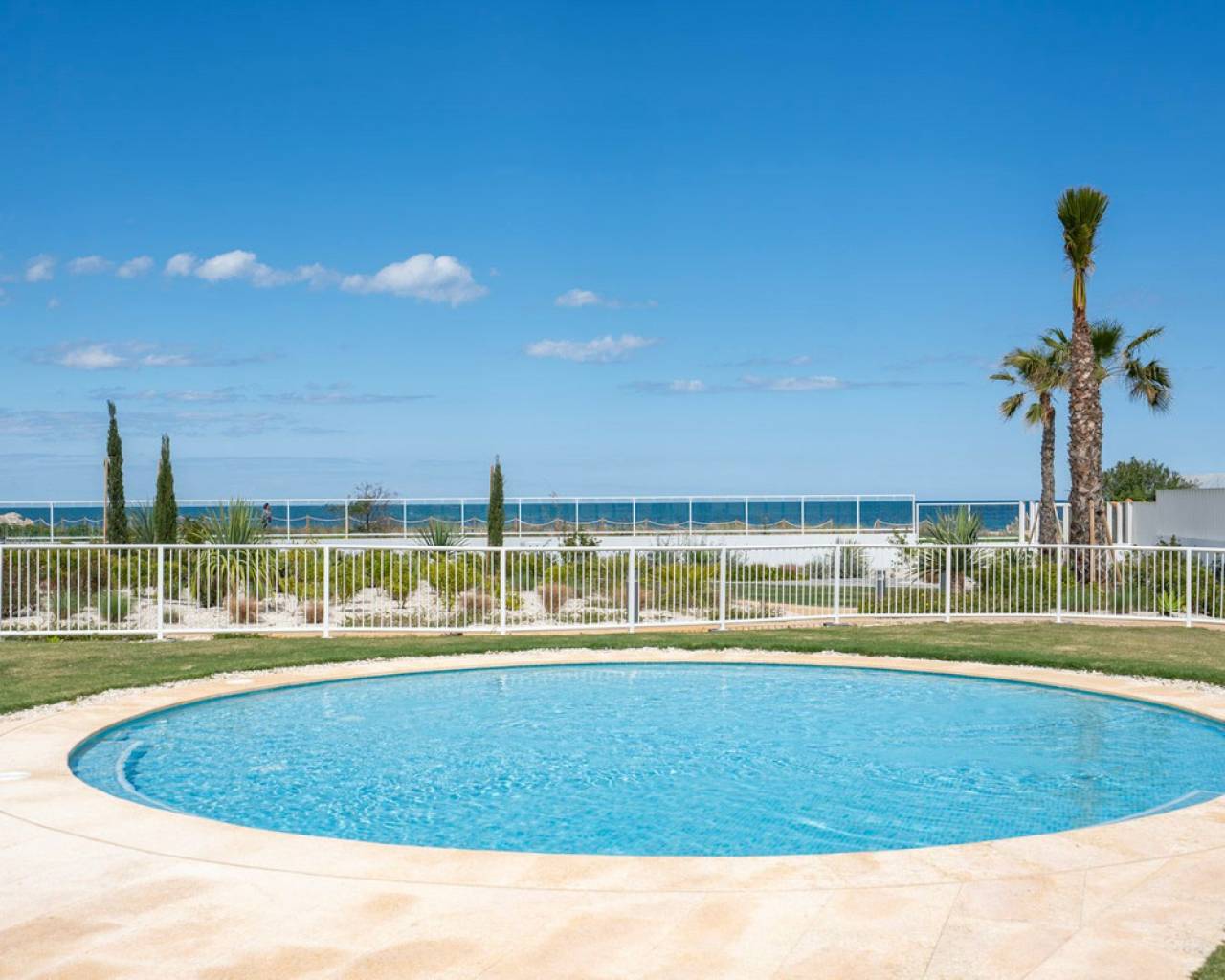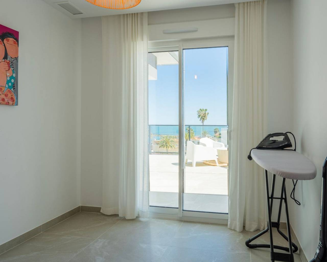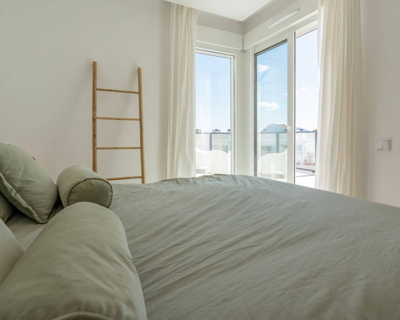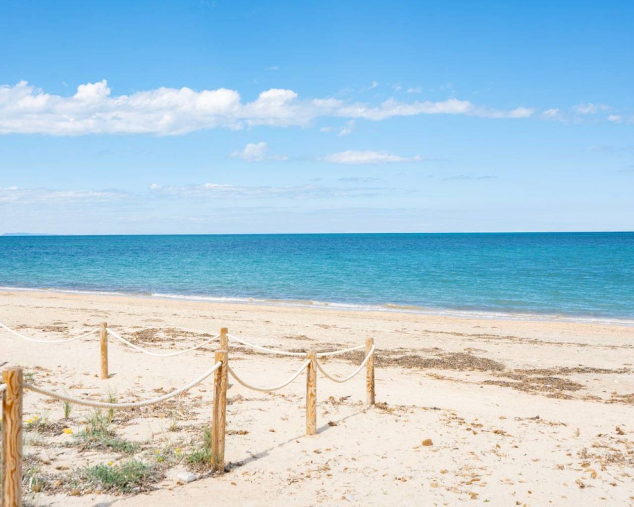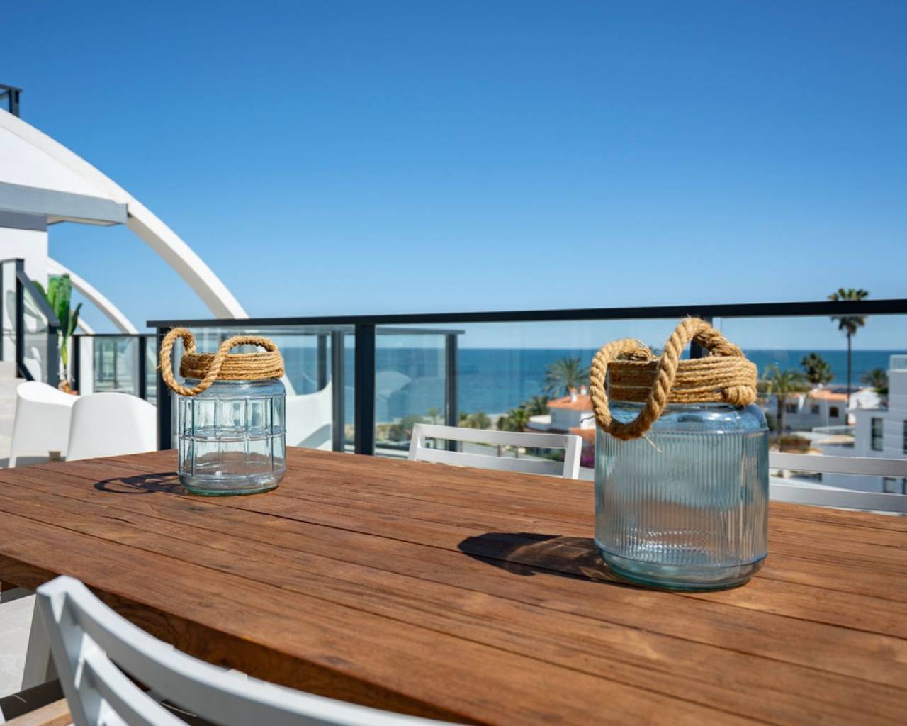 Fantastic luxury penthouse with panoramic sea views, located on the sandy beach of Playa de la Almadraba, in the modern Taylor Wimpey Bella Beach complex. This exclusive penthouse has stunning sea views from all rooms and also features a rooftop terrace of no less than 94.85 m2 where you can enjoy spectacular 360° views. To the east, the coastline stretches to Gandía, to the west the towers of the Montgó mountain, to the north you can see the sea directly, and to the south it overlooks the impressive Sierra de Segaria. With a usable area of 84.90 m2 and a terrace of 51.46 m2 on the same floor, this penthouse offers space and comfort. It features an elegant hallway with a spacious double bedroom to the left and a bathroom to the right. The hallway leads to a living room, where the spectacular sea view immediately captures attention and where sliding windows give access to the terrace. The modern, fully equipped kitchen is located next to the living room and also has direct access to the terrace. Further down the hallway is a second double bedroom with access to the terrace, and at the end of the hallway is the master bedroom with an en-suite bathroom, dressing room, and also direct access to the terrace. The penthouse is equipped with air conditioning for heating and cooling, and all windows are fitted with electric shutters. It is sold fully furnished, allowing you to move in immediately. On the terrace, there is also a handy storage room and a built-in closet with a washing machine. Additionally, you will have a private parking space and an independent storage room of 7.15 m² in the underground garage. The location is ideal: you will enjoy total tranquility and privacy, while the bustling Denia with its vibrant restaurants, shops, and marina is only a 15-minute drive away. This unique penthouse is part of a new complex completed in 2024, giving you the opportunity to have your hands on a dream home ready to move in, as good as new. Contact us today for a visit.