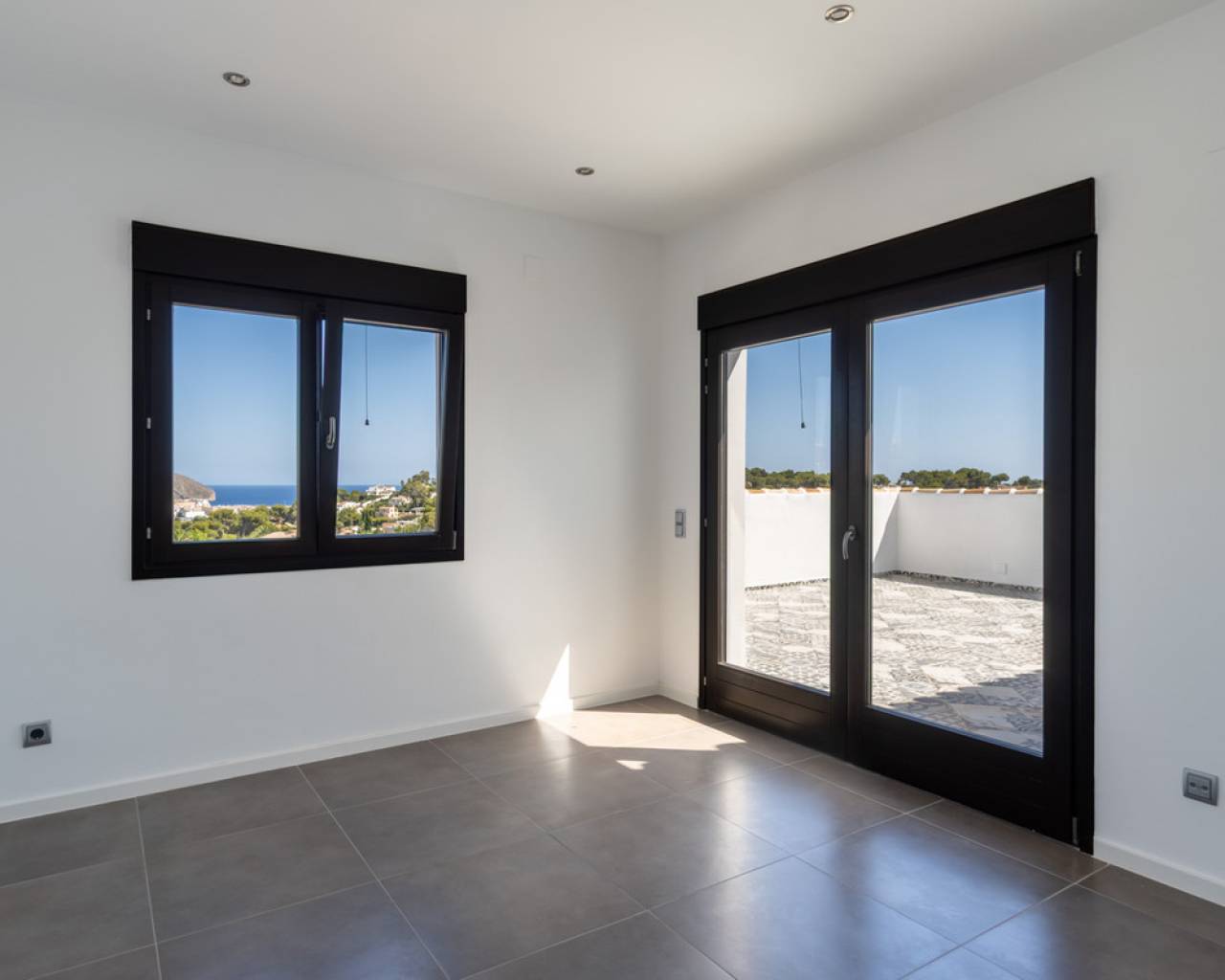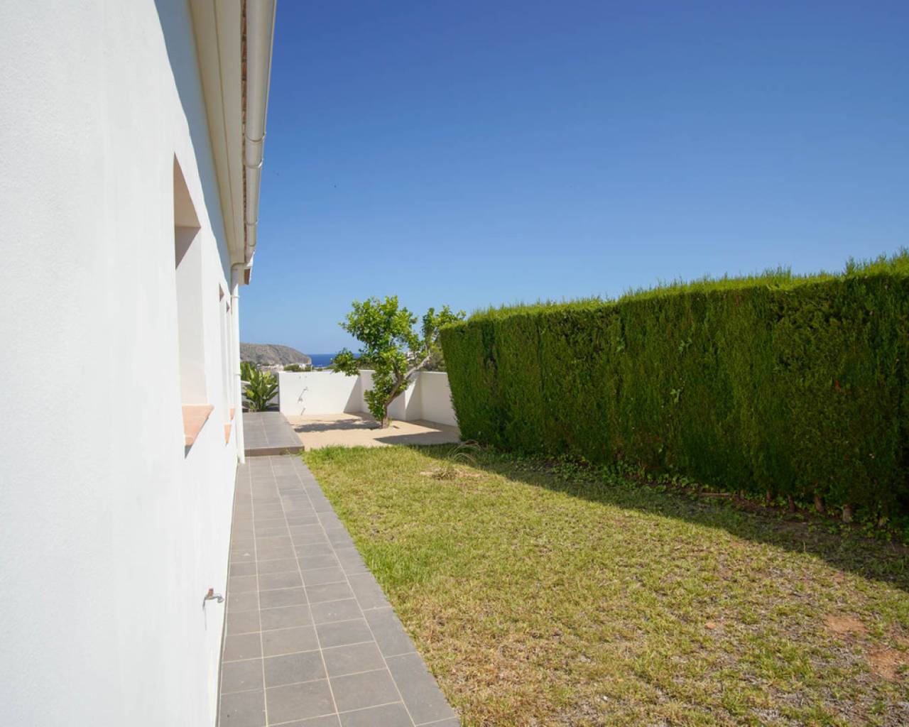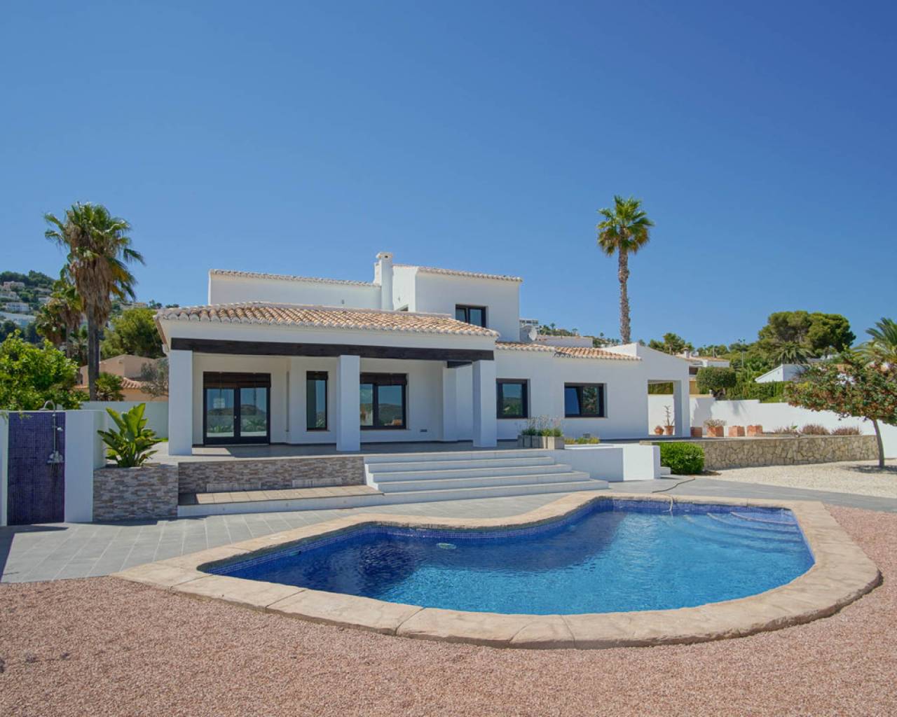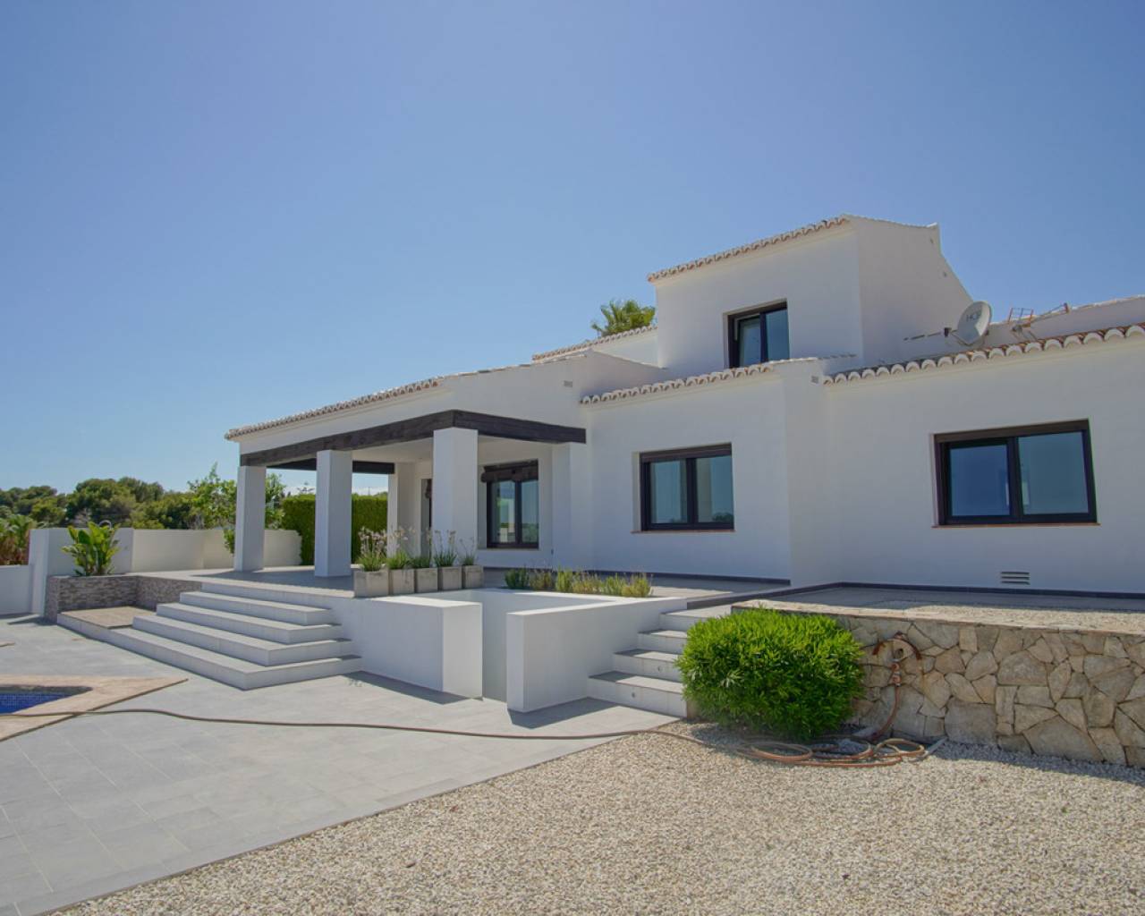 Located in one of the most exclusive areas of Moraira, this captivating Mediterranean-style villa offers stunning open views of Cabo de Moraira, the sea, and the entire coastline. Nestled atop a hill, the property enjoys absolute privacy in its outdoor spaces: a spacious sunny terrace, a low-maintenance garden, and a uniquely designed pool, all perfectly integrated into the natural surroundings. The home stands out for its unique character and a design crafted with attention to the smallest details. Spread over two floors connected by an interior staircase, both levels also have independent access, which adds great versatility and functionality. On the main floor, there is a large and bright living-dining room with a fireplace, an open area prepared for kitchen installation, and a laundry room with pre-installation already done, as well as a full bathroom with a shower. On this same floor, there is a charming annex apartment, with independent access and interior connection, ideal for guests or as a master suite. This space features a comfortable living-dining area convertible into a bedroom, a second bedroom, a full bathroom, and an additional area designated for a kitchen or dressing room, also with the necessary pre-installations. The entrance to this annex features a beautiful restored antique wooden door that adds an authentic and distinctive touch. The upper floor houses two bedrooms, a full bathroom, and a spectacular solarium-style terrace with sea views, perfect for relaxing or enjoying the sunsets. All the main rooms of the villa enjoy views of the sea, the garden, and the pool, reinforcing the feeling of being in a private oasis. The garden has been designed to require minimal maintenance and includes an automatic irrigation system. The property also has a parking area within the premises, with a motorized sliding door for vehicles and a separate pedestrian entrance. Among the finishes and amenities, notable features include aluminum windows with a wood-effect finish and double security glazing, shutters and mosquito nets (motorized on the upper floor), built-in wardrobes with sliding doors, radiator heating, and warm, adjustable lighting in both floors and ceilings. A property with soul, perfect for those seeking tranquility, breathtaking sea views, and the unmistakable charm of Mediterranean style.