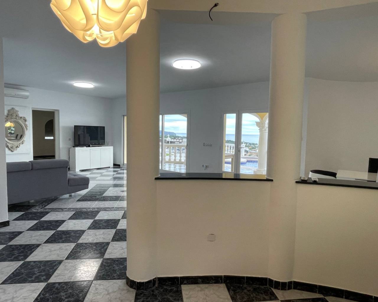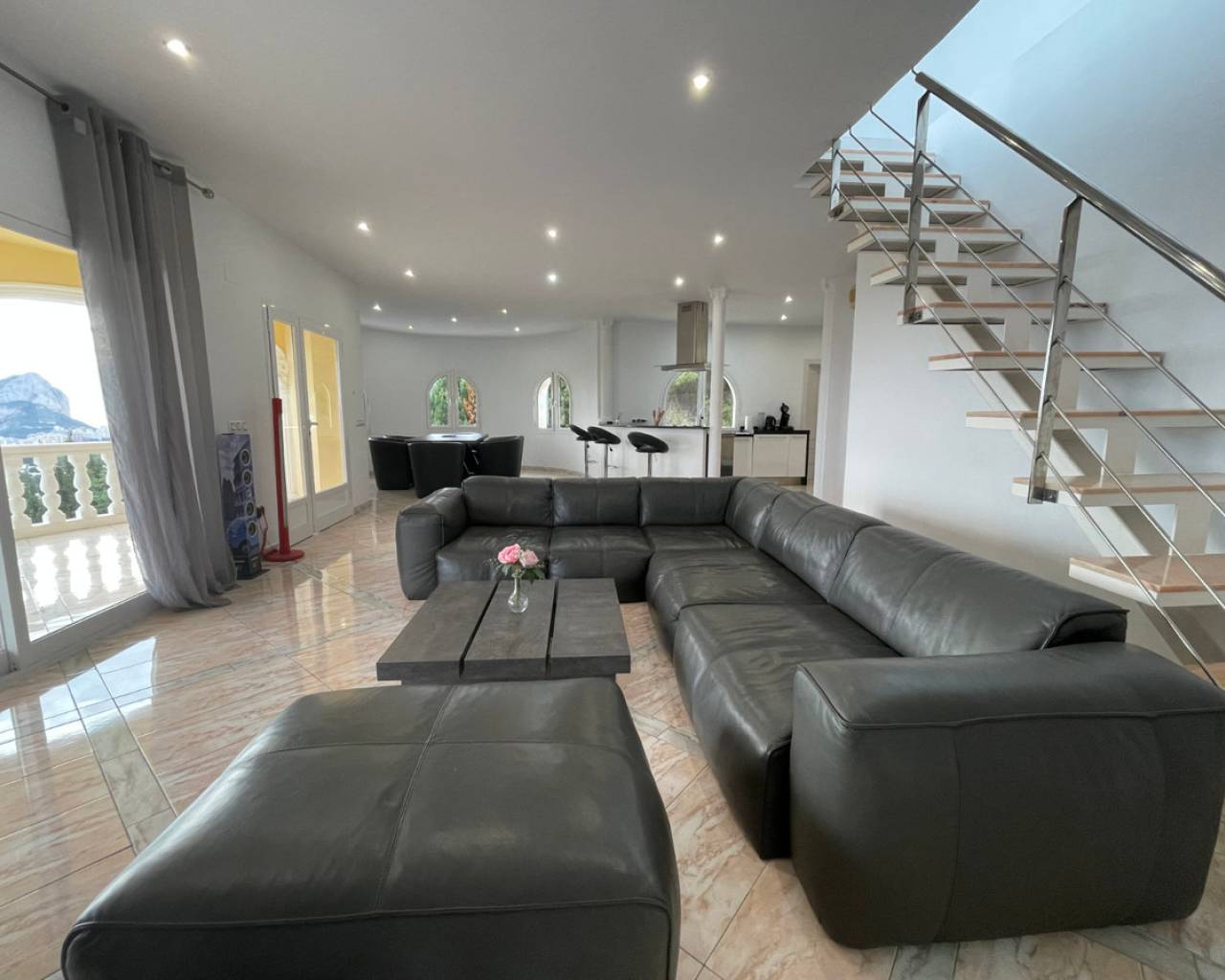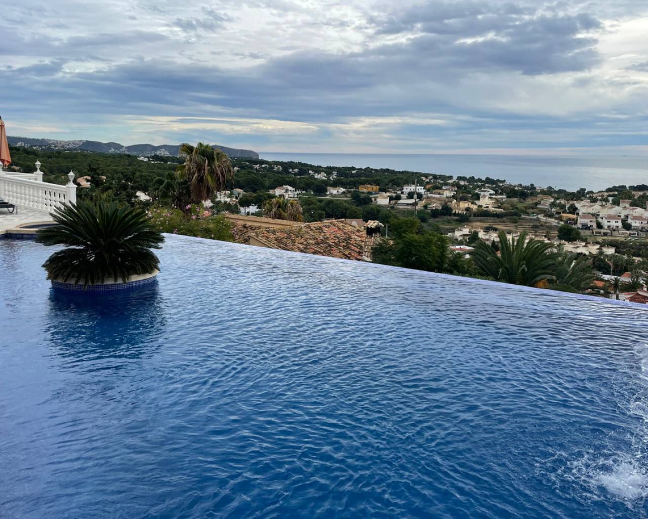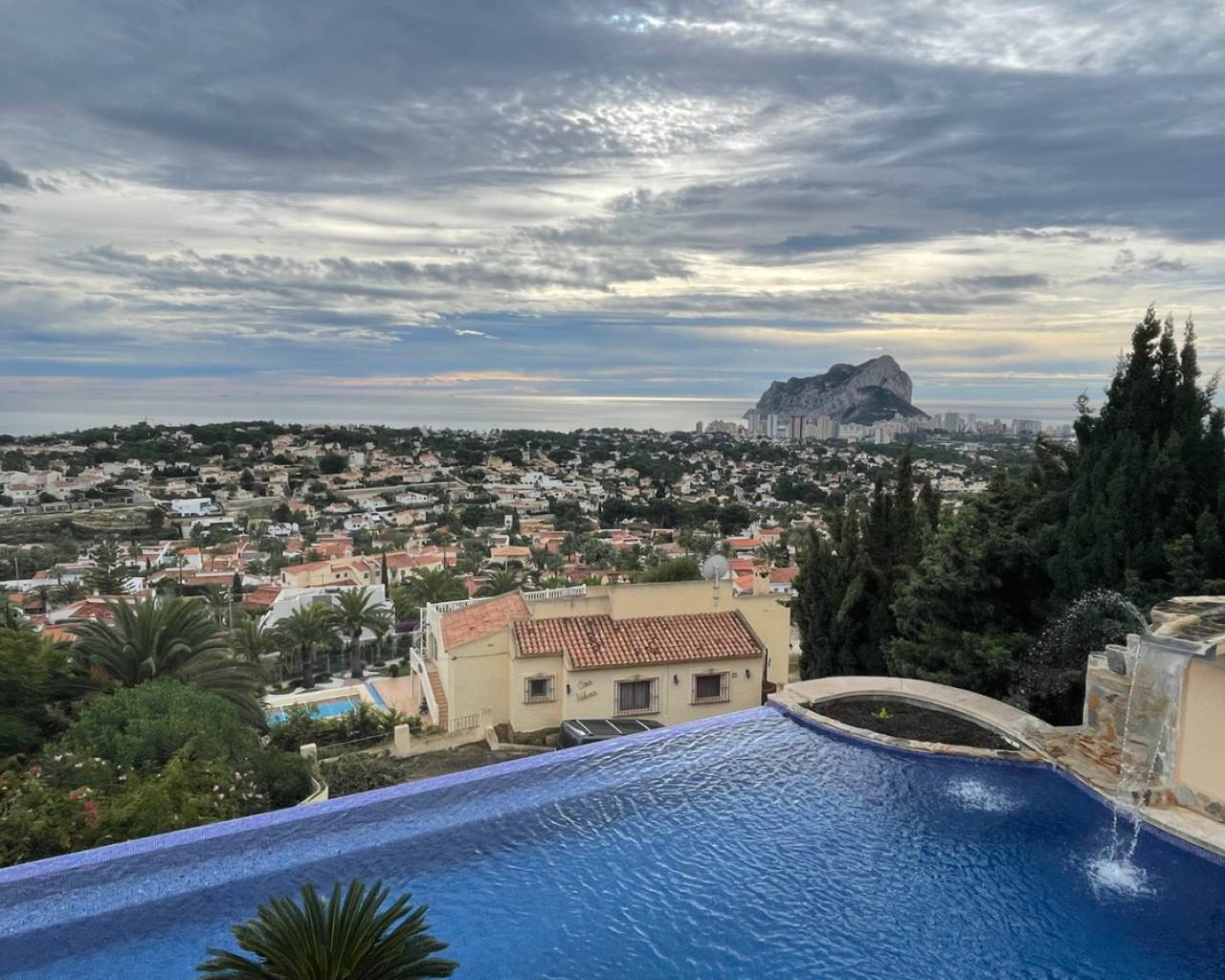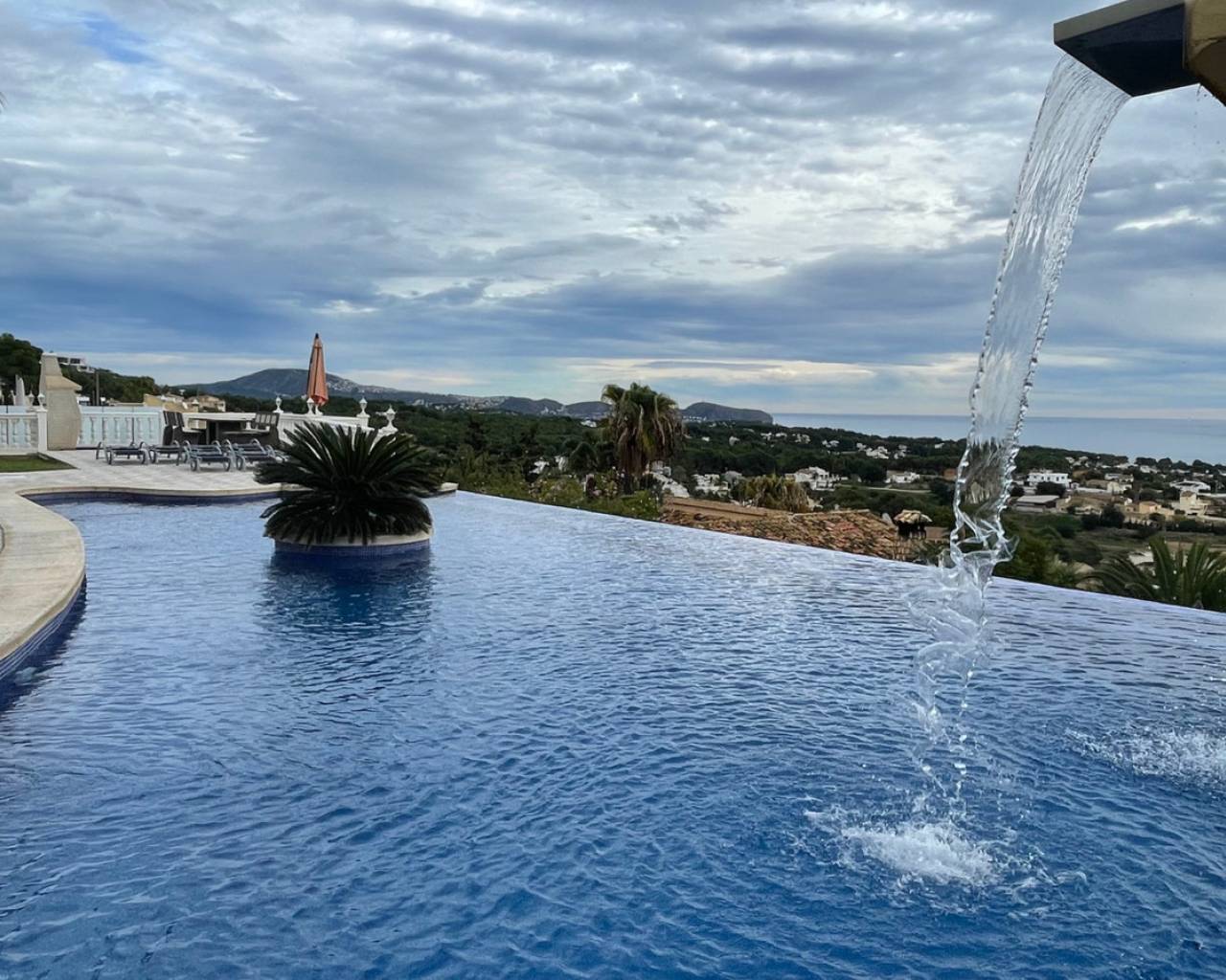 Detached villa with sea view and dual living layout for sale in Calpe This detached villa, built in 2013, is located in Calpe on a plot offering complete privacy and sea views. The property was built to German construction standards, with insulation in the exterior walls and ceilings to ensure a comfortable indoor climate in both summer and winter. Description The villa is currently divided into two identical apartments. Each apartment has a living and dining room, open kitchen, two bedrooms, and two bathrooms. The apartments can be connected internally via an internal staircase. Both floors have direct access to spacious terraces. There is also a roof terrace (solarium) with unobstructed sea views. The plot is southeast-facing and borders a green area. The garden requires little maintenance. The windows are made of raw aluminum with bronzed safety glass, fitted with insect screens and shutters. There is a garage with space for three cars. Access is secured with electric gates. The swimming pool is a striking feature of this villa: a 23x12-meter infinity pool with a unique shape, equipped with an integrated jacuzzi, children's pool, waterfall, and a centrally located palm tree. The pool and the living level are at the same height thanks to a 4.5-meter natural stone wall. The house is located on a dead-end street. Special features Built to German standardsTwo independent apartments, internally connectableAir conditioningRoof terrace with sea viewWindows with safety glass, insect screens, and shuttersGarage for 3 carsLarge infinity pool (23x12 m) with jacuzzi, children's pool, and waterfallQuiet location, complete privacyWhy view this villa Suitable for double occupancy or rentalLarge outdoor area and swimming pool on the same level as the houseSolid constructionSea viewA villa with a well-thought-out layout, lots of space, and sea view for sale in Calpe. Please contact us for a viewing or additional information.