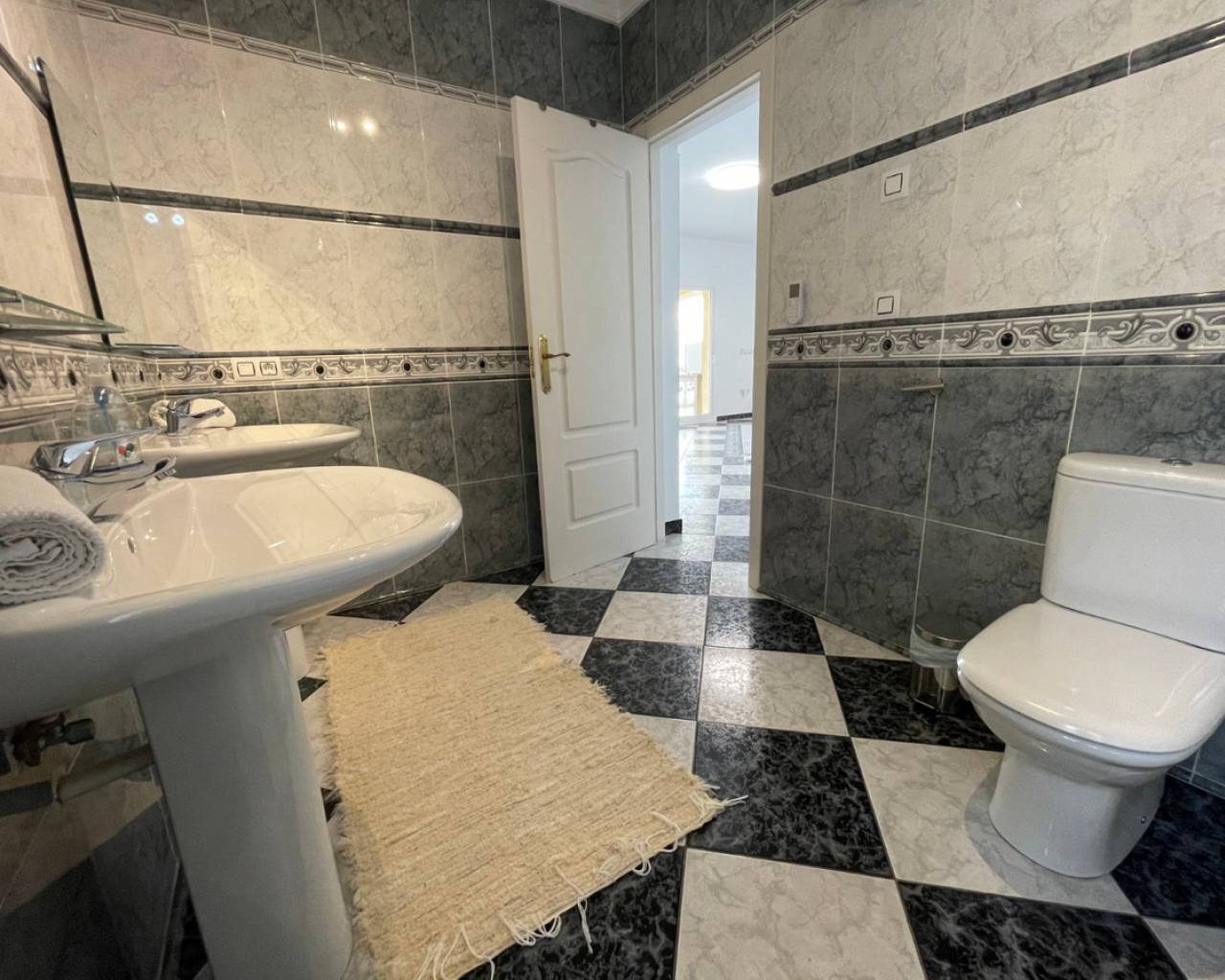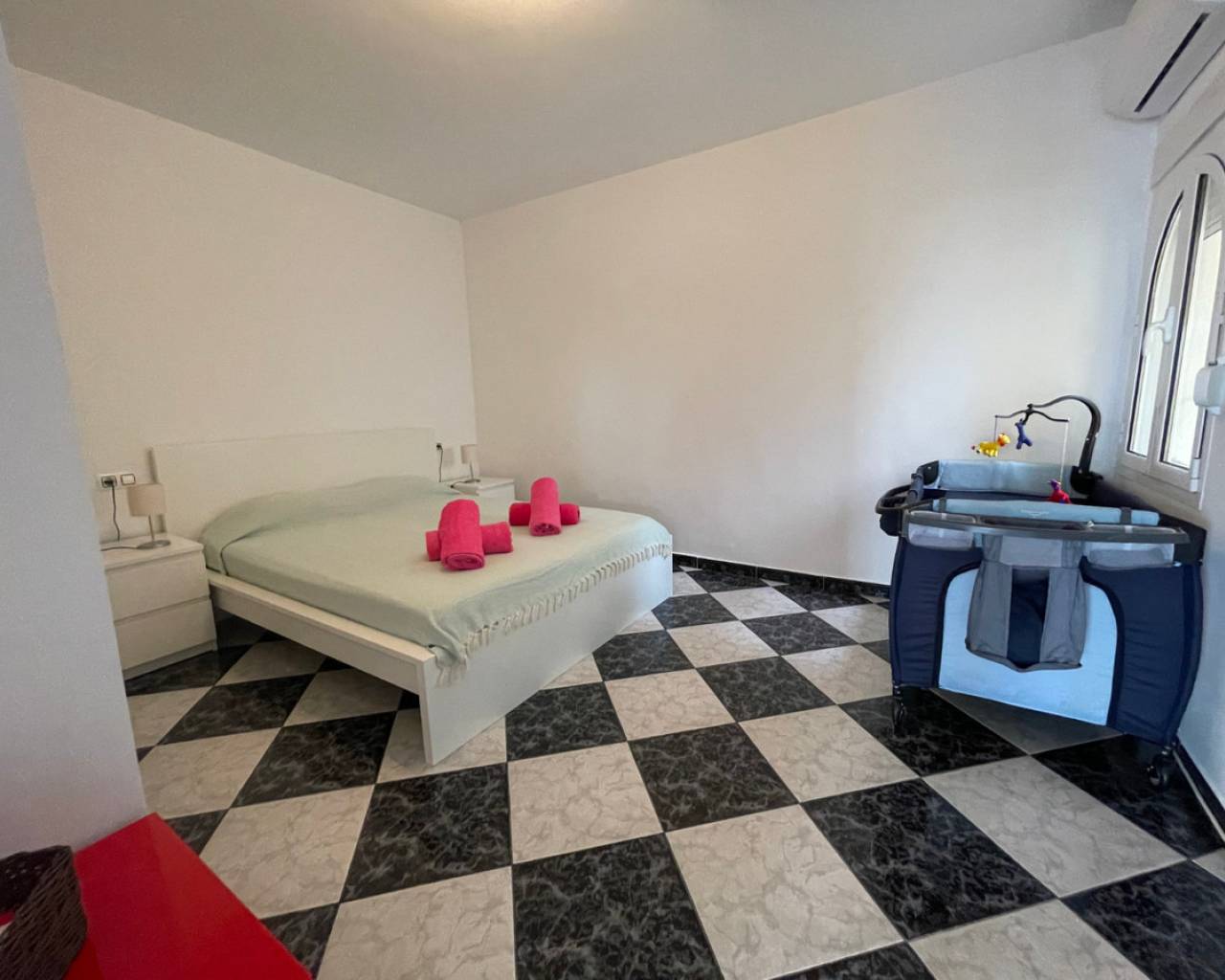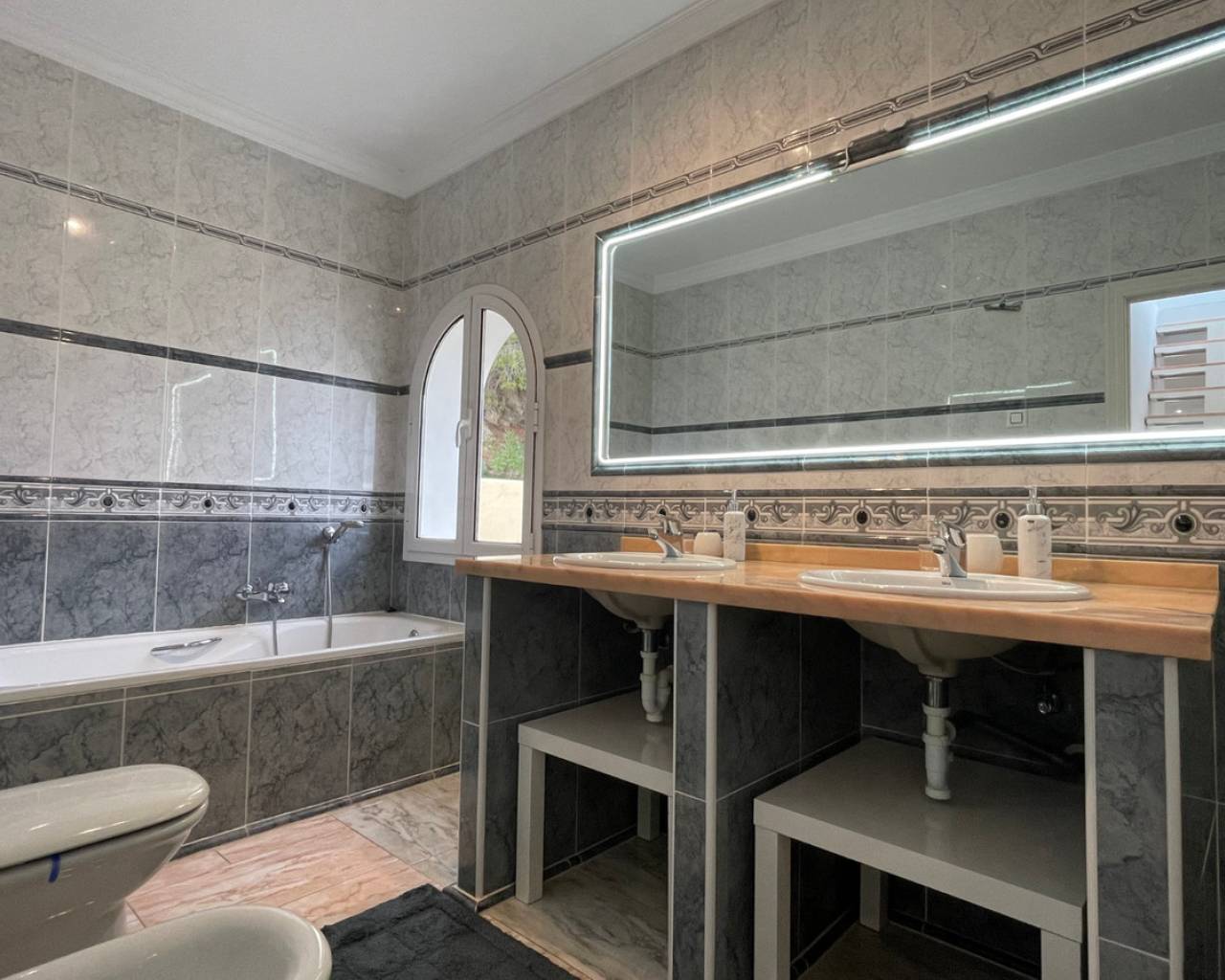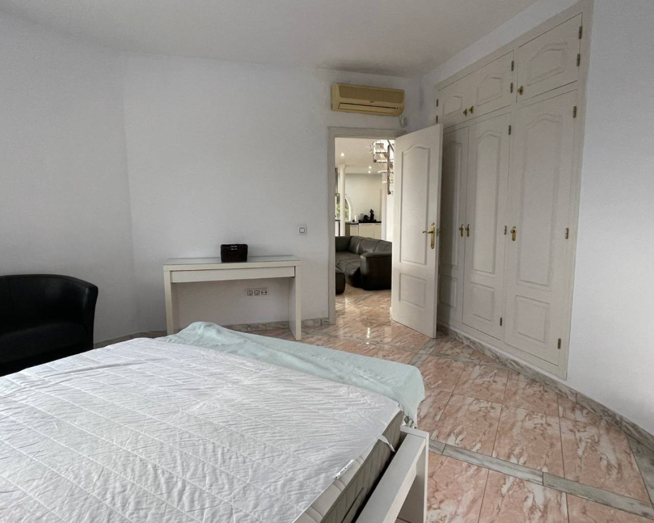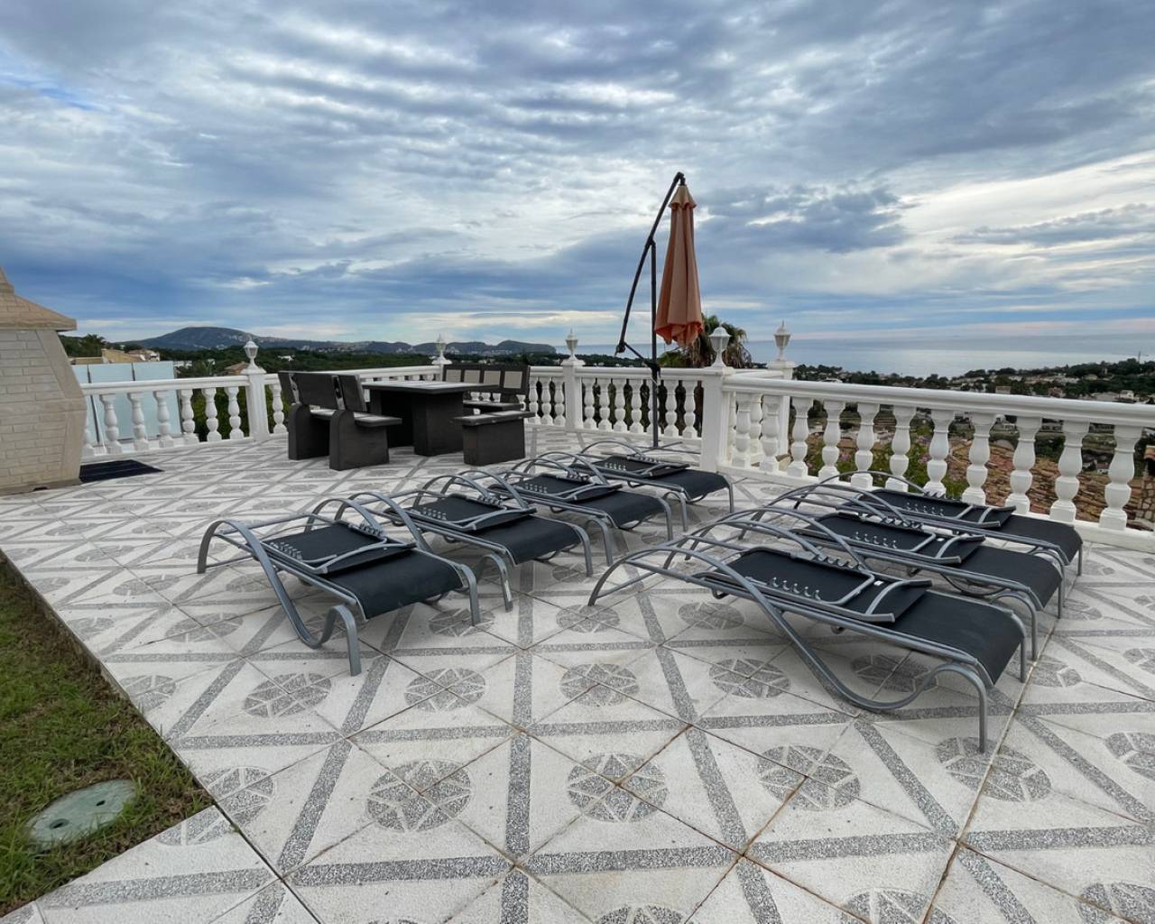 Detached villa with sea view and dual living layout for sale in Calpe This detached villa, built in 2013, is located in Calpe on a plot offering complete privacy and sea views. The property was built to German construction standards, with insulation in the exterior walls and ceilings to ensure a comfortable indoor climate in both summer and winter. Description The villa is currently divided into two identical apartments. Each apartment has a living and dining room, open kitchen, two bedrooms, and two bathrooms. The apartments can be connected internally via an internal staircase. Both floors have direct access to spacious terraces. There is also a roof terrace (solarium) with unobstructed sea views. The plot is southeast-facing and borders a green area. The garden requires little maintenance. The windows are made of raw aluminum with bronzed safety glass, fitted with insect screens and shutters. There is a garage with space for three cars. Access is secured with electric gates. The swimming pool is a striking feature of this villa: a 23x12-meter infinity pool with a unique shape, equipped with an integrated jacuzzi, children's pool, waterfall, and a centrally located palm tree. The pool and the living level are at the same height thanks to a 4.5-meter natural stone wall. The house is located on a dead-end street. Special features Built to German standardsTwo independent apartments, internally connectableAir conditioningRoof terrace with sea viewWindows with safety glass, insect screens, and shuttersGarage for 3 carsLarge infinity pool (23x12 m) with jacuzzi, children's pool, and waterfallQuiet location, complete privacyWhy view this villa Suitable for double occupancy or rentalLarge outdoor area and swimming pool on the same level as the houseSolid constructionSea viewA villa with a well-thought-out layout, lots of space, and sea view for sale in Calpe. Please contact us for a viewing or additional information.