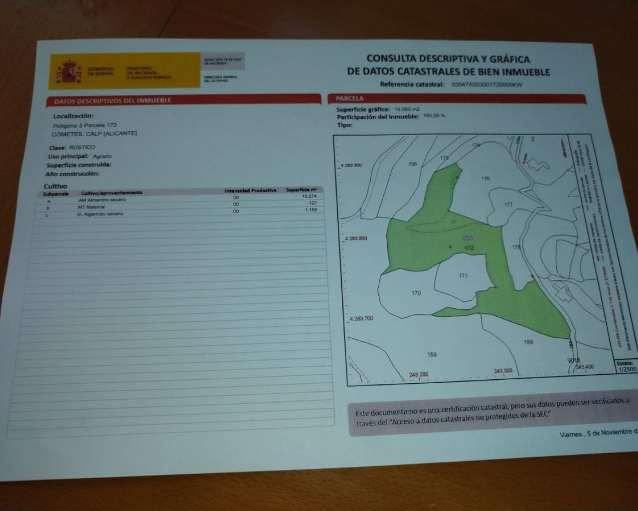 Rustic farm in Calpe of 16,570 m² with views of the Peñón de Ifach. Sunny all day and two kilometers from the beach and the city center. Suitable for the construction of a single-family home. Plot 172 A) AM Dry almond tree 15,274 m² B) MT Scrub 127 m² C) G- Dry carob tree 1,159 m²