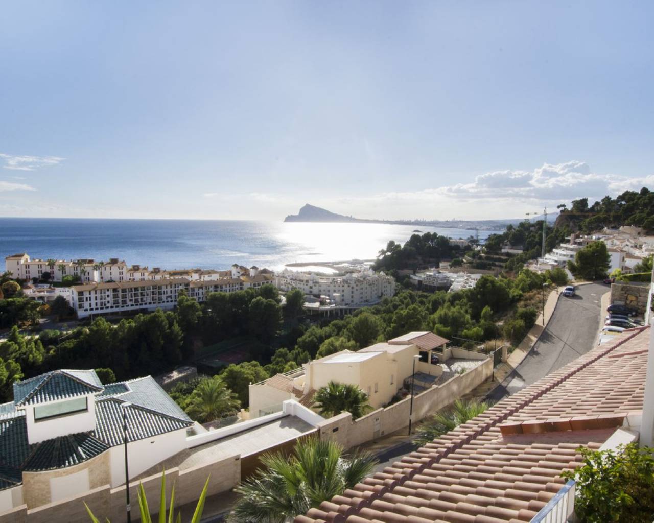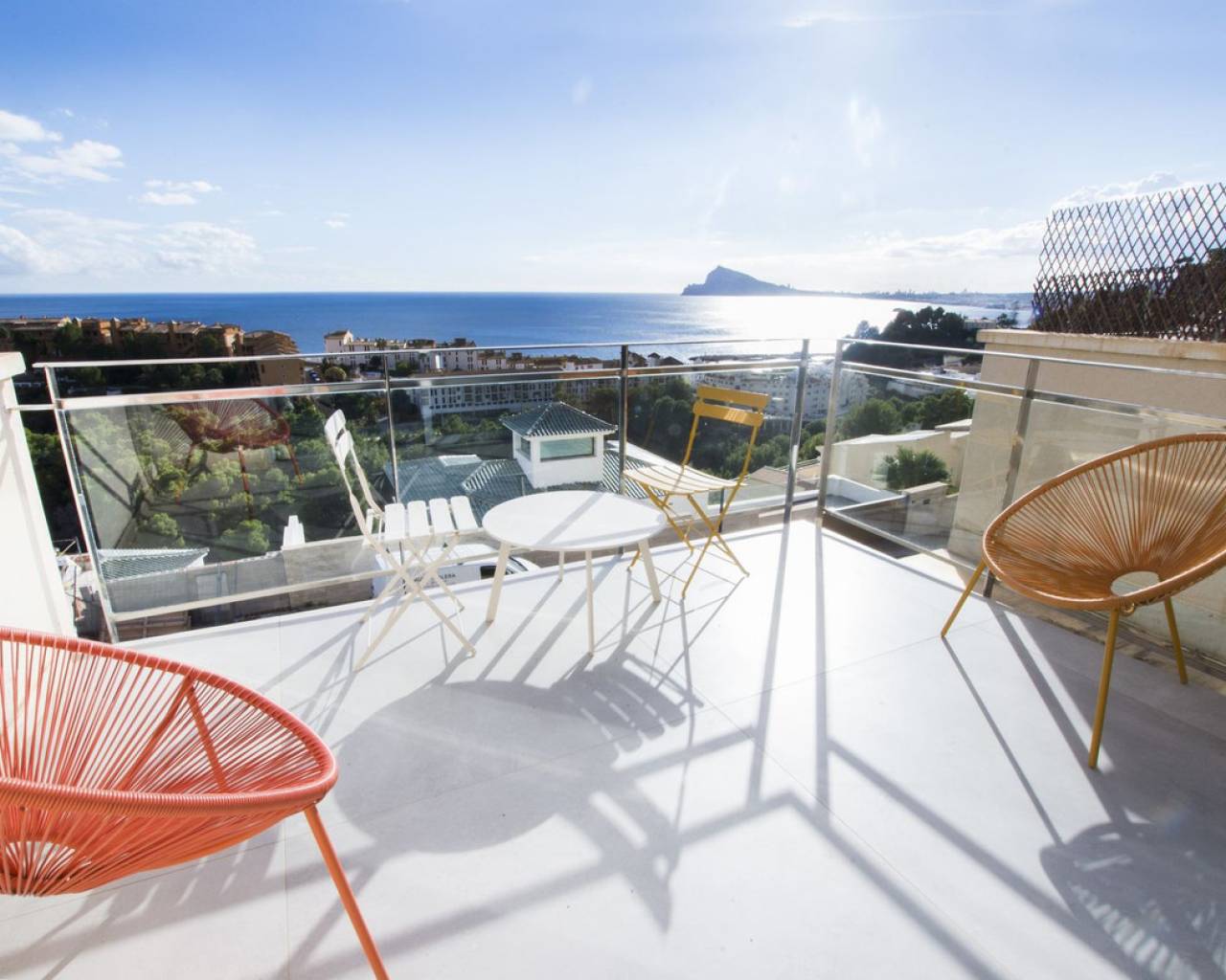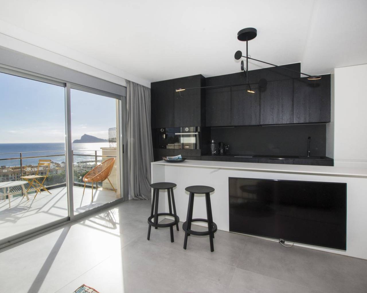 Modern duplex penthouse with panoramic view of the sea and the yacht harbor, located in a southwest-oriented building in a gated estate, in Altea, Mascarat district. The apartment has recently been completely renovated and is in excellent condition. The living area is distributed over two levels and includes: a spacious living room with dining area, an open, fully equipped kitchen with an island, 2 bedrooms (both with ensuite, one with access to a terrace), 2 bathrooms, a guest toilet and 3 sunny terraces. Features include: ducted air-conditioning (hot and cold), large-format tiles, aluminum sliding windows with room opening, high-quality exterior woodwork, fully equipped kitchen with appliances, fully equipped bathrooms, built-in closets, double glazing, broadband, LED lighting, finishing with top-quality materials. The price includes a large parking space in the garage hall. In the estate we can find plenty of green areas and a communal swimming pool both for children and adults. Within walking distance you can find many services and conveniences such as sandy beaches, Campomanes luxury yacht harbor, luxury restaurants and lounge bars, and in close distance: scenic parks, golf courses, a wide range of sports facilities with tennis courts, stores, international schools, banks, medical centers, walking trails and much more.