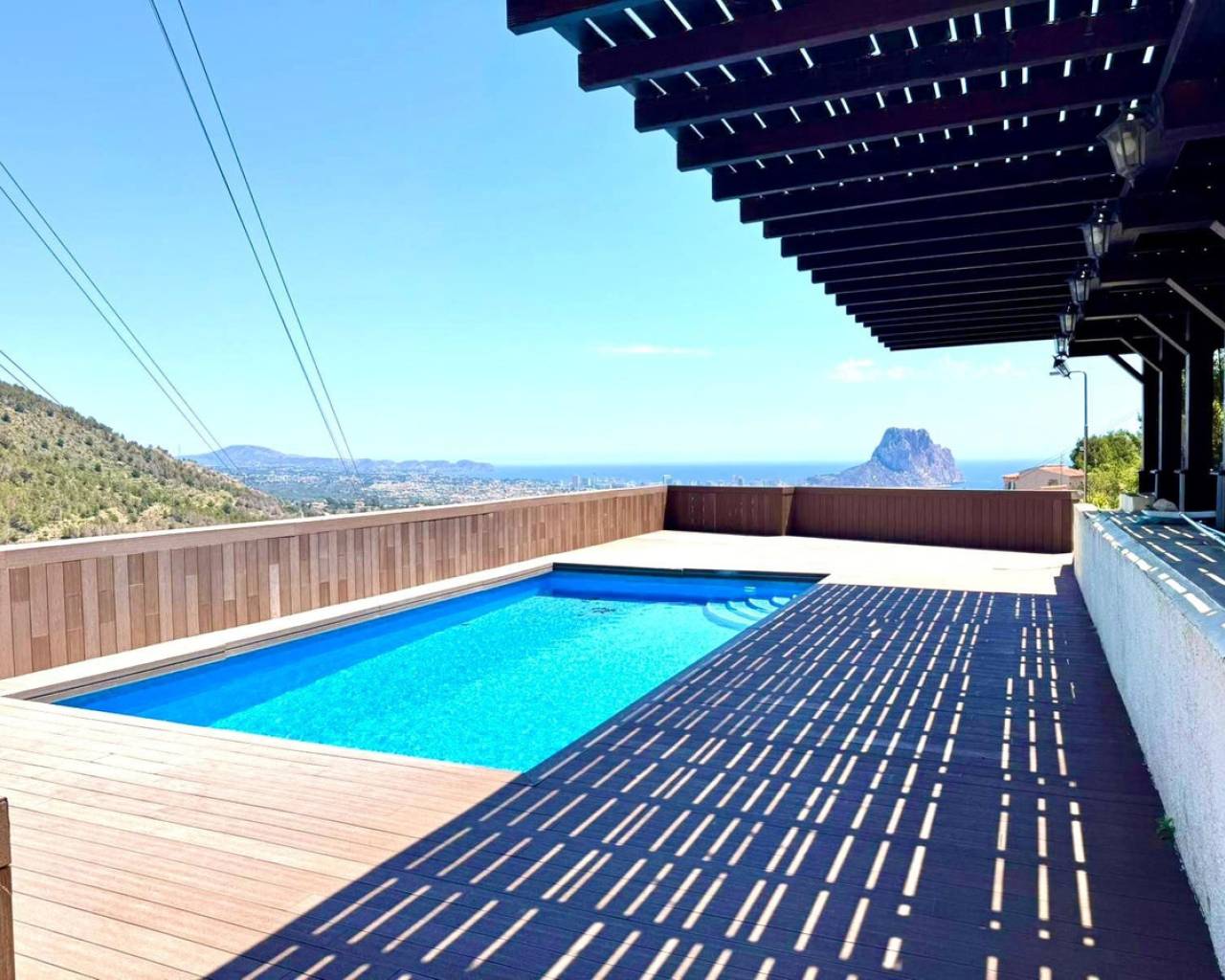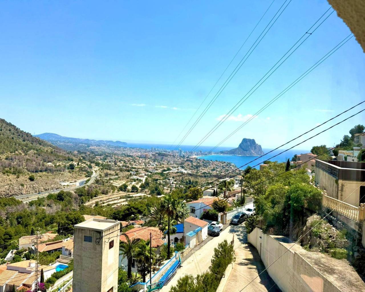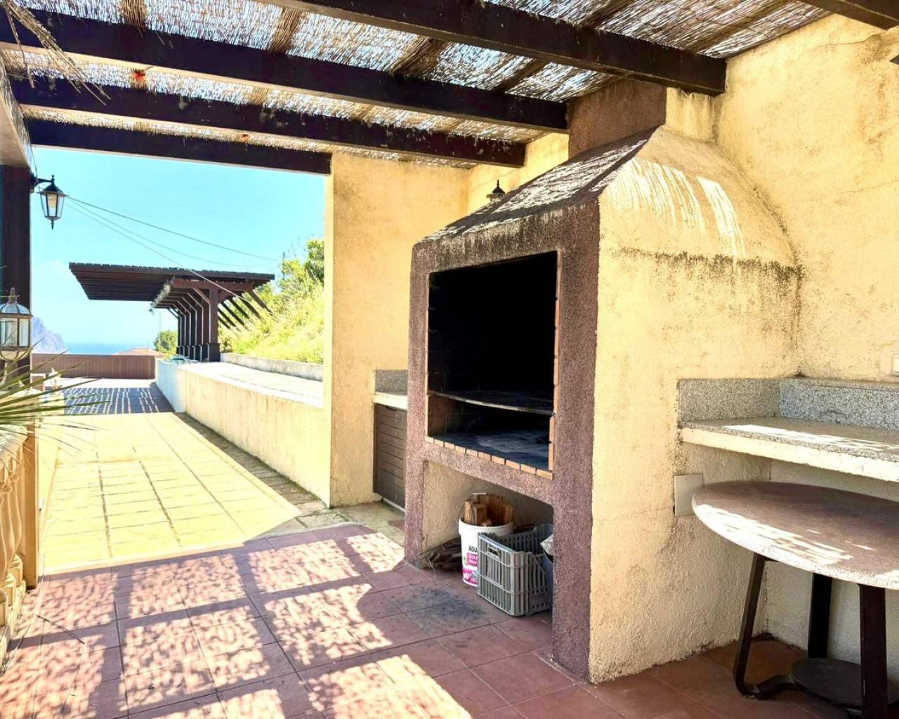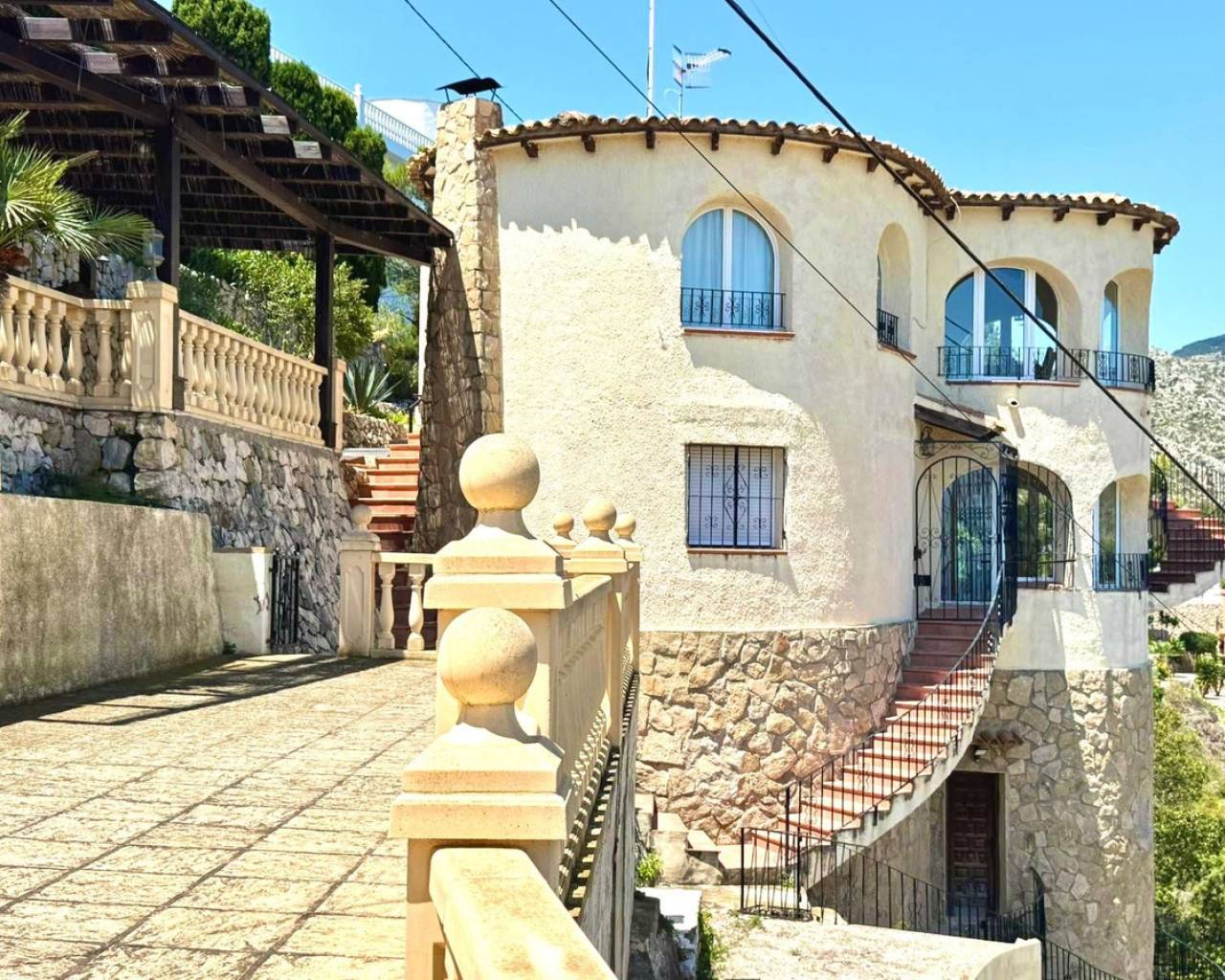 Located in the Maryvilla urbanization in Calpe, this property is situated on a large, double plot of 1,733 m², offering plenty of space and a wide range of layout options. The villa was renovated in 2012 and has a private driveway with an automatic gate, allowing for convenient parking for two vehicles. The layout includes two independent apartments – ideal for hosting guests or generating rental income. First apartment (upper level): Fully equipped kitchen Bright living room with access to a glazed dining terrace offering spectacular sea views 2 bedrooms 2 bathrooms, including one en-suite Second apartment (lower level, accessible via external stairs): Cozy living room with fireplace and beautiful view Semi-open kitchen 1 bedroom with en-suite bathroom Additional guest toilet Outdoor areas: Swimming pool surrounded by a wooden terrace, ideal for relaxing outdoors Covered barbecue area – a great place to meet family and friends Panoramic sea views from many parts of the property.