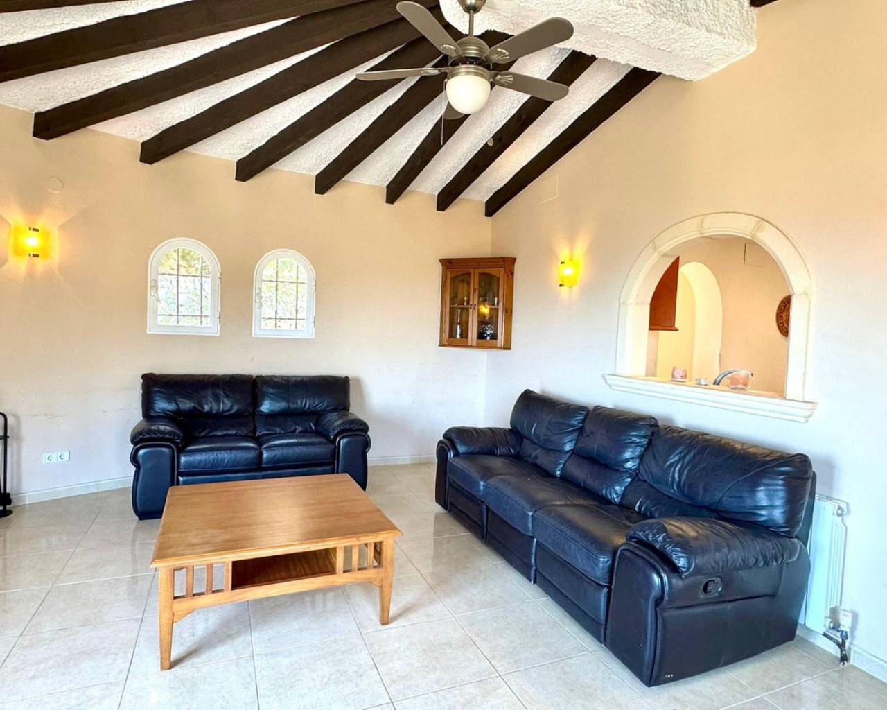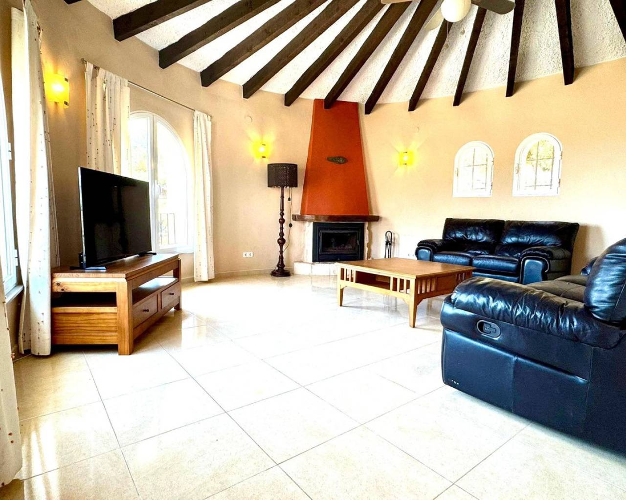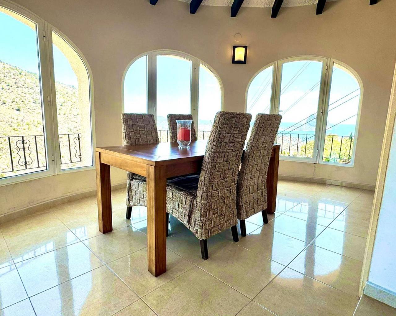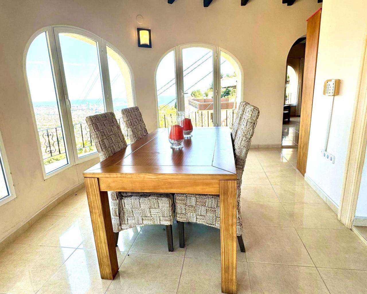 Located in the Maryvilla urbanization in Calpe, this property is situated on a large, double plot of 1,733 m², offering plenty of space and a wide range of layout options. The villa was renovated in 2012 and has a private driveway with an automatic gate, allowing for convenient parking for two vehicles. The layout includes two independent apartments – ideal for hosting guests or generating rental income. First apartment (upper level): Fully equipped kitchen Bright living room with access to a glazed dining terrace offering spectacular sea views 2 bedrooms 2 bathrooms, including one en-suite Second apartment (lower level, accessible via external stairs): Cozy living room with fireplace and beautiful view Semi-open kitchen 1 bedroom with en-suite bathroom Additional guest toilet Outdoor areas: Swimming pool surrounded by a wooden terrace, ideal for relaxing outdoors Covered barbecue area – a great place to meet family and friends Panoramic sea views from many parts of the property.