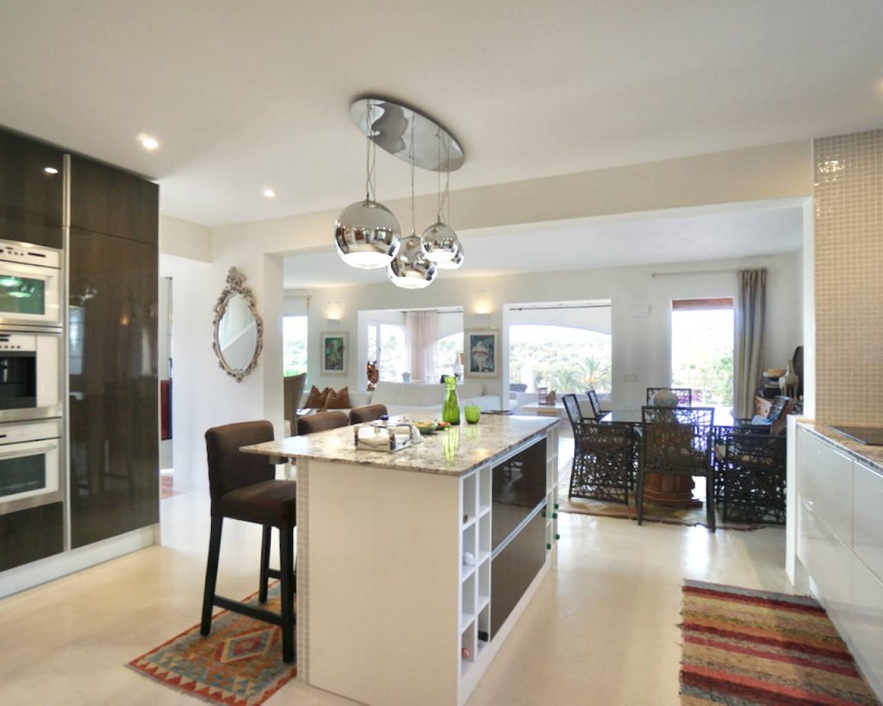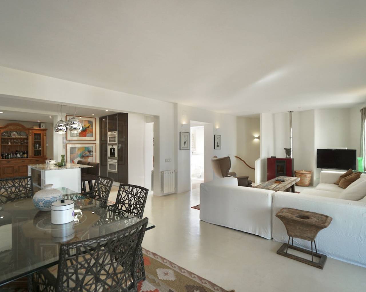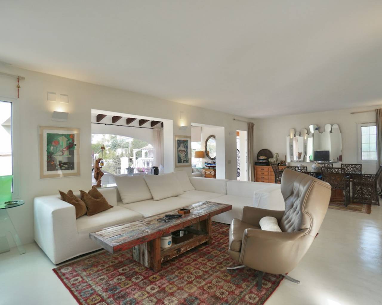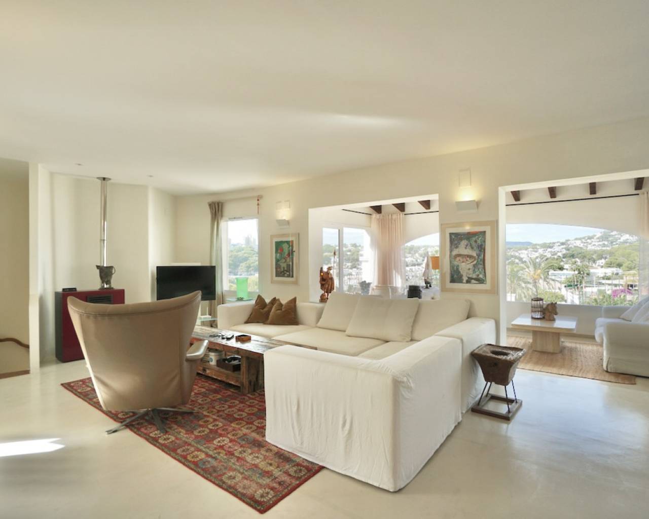 Villa for Sale in El Portet, Moraira – Open and Sea Views with Mediterranean Elegance Located in one of Moraira's most exclusive areas, El Portet, this beautifully refurbished villa combines elegance, comfort, and Mediterranean charm. Offering both open views and sea views from the pool level, it enjoys one of the best locations in town - within a short walk of the beach and all amenities. Completely renovated in 2022, the property sits on an 800 m² plot with a total built area of 265 m². Entering from the spacious driveway, which provides parking for up to three cars, you are welcomed into a home that feels both stylish and inviting. On the entrance level, there is a large bathroom with a generous laundry room, and additional storage space both inside and outside. A few steps up lead to a bright bedroom with a walk-in wardrobe. One level down, you'll find the heart of the home: an open-plan living area living room with a pellet fireplace, a dining space, and a large modern kitchen with extra storage. From here, a glazed in naya creates another cosy lounging area with stunning open and sea views across El Portet Bay. This level also includes a guest toilet and access to a sunny terrace – perfect for enjoying a morning coffee or an evening glass of wine while admiring the scenery. The lower level of the villa opens directly onto the pool terrace and features three bedrooms, one with an ensuite bathroom, all with built-in wardrobes. There is also a spacious shared bathroom on this floor. The outdoor area offers several terraces, including one with a charming bar - ideal for relaxing or entertaining friends and family. The villa is equipped with gas central heating, air conditioning, partial underfloor heating, double glazing, mosquito nets, manual shutters, an alarm system, and an electric gate. The low-maintenance Mediterranean garden and various storage areas ensure both practicality and ease of living. Key Features: Prime location in El Portet, Moraira Open views and sea views from the pool level Fully refurbished in 2022 Plot 800 m², built area 265 m² 4 bedrooms, 3 large bathrooms + guest toilet Open-plan living and dining area with fireplace Modern kitchen and several terraces, Please let us know if you would like to make a viewing appoin