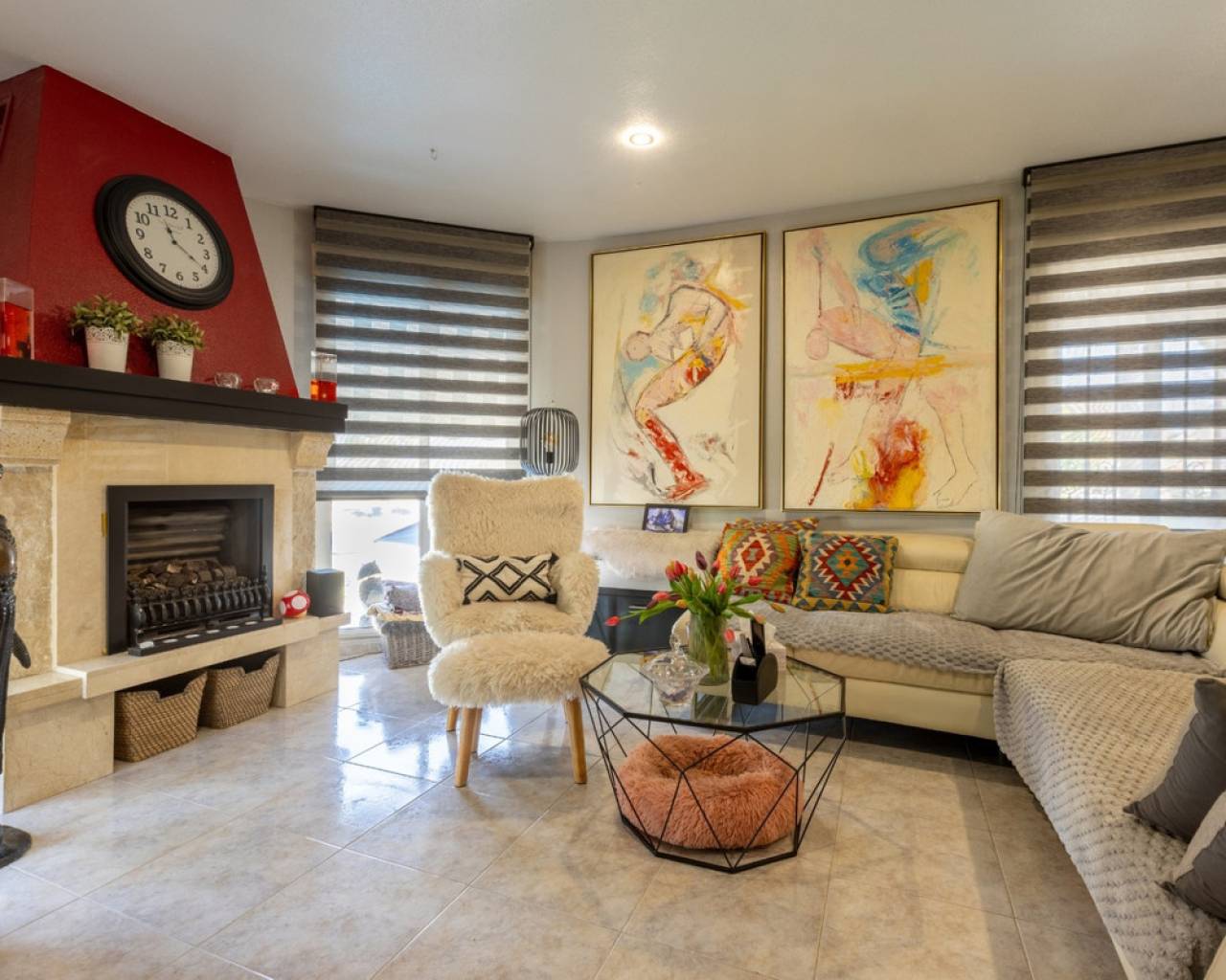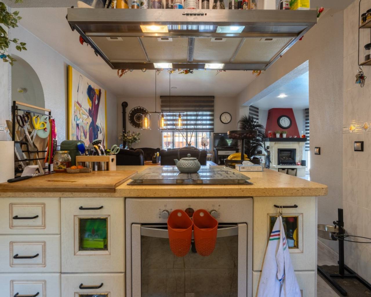 An outside staircase leads to the elevated terrace with unobstructed views. The front door opens into a spacious, bright living room with a fireplace and a pellet stove. Thanks to the large sliding doors and multiple windows, there is plenty of natural light coming in. The underfloor heating ensures comfortable living here all year round.