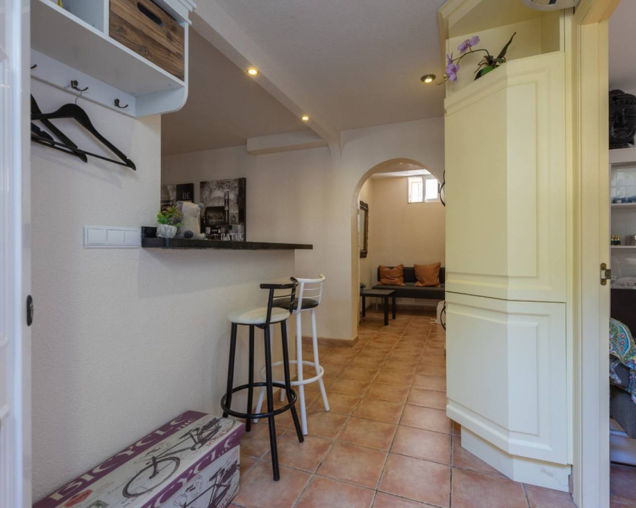 Upon arrival, you enter through the gateway into the beautifully landscaped garden, where a sense of tranquility and privacy immediately prevails. The garden is planted with palm trees, yuccas, strelitzias and various cacti, and offers several terraces and seating areas to enjoy the Mediterranean climate.