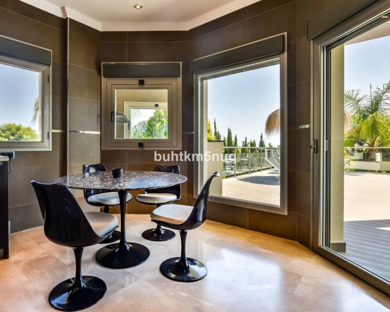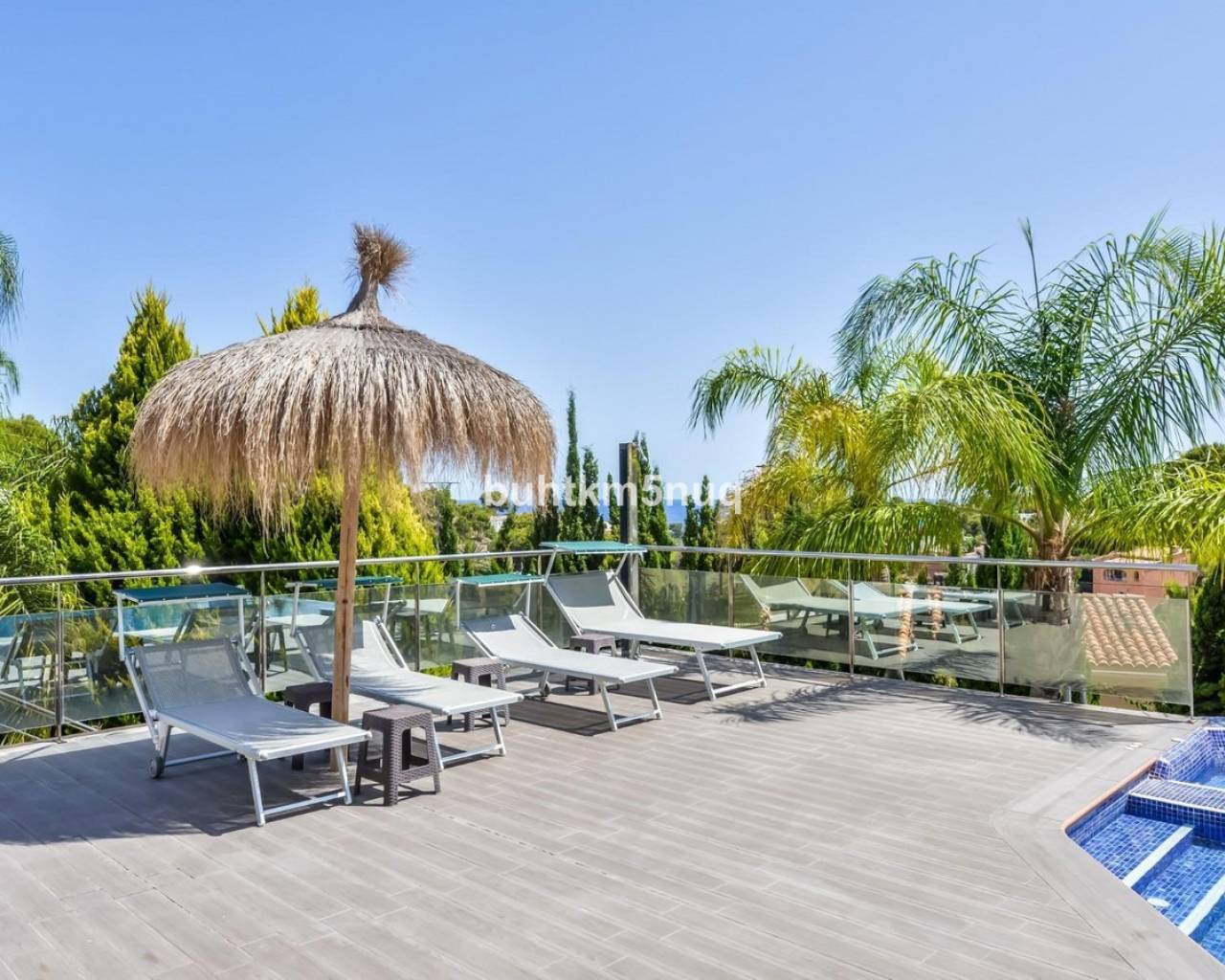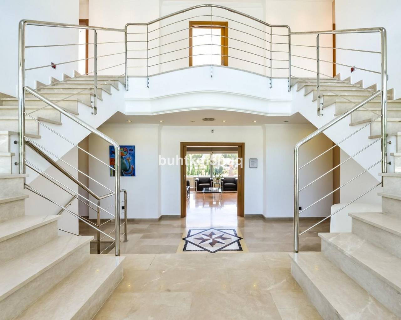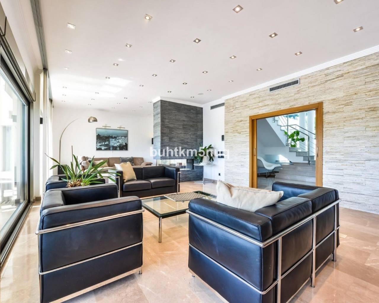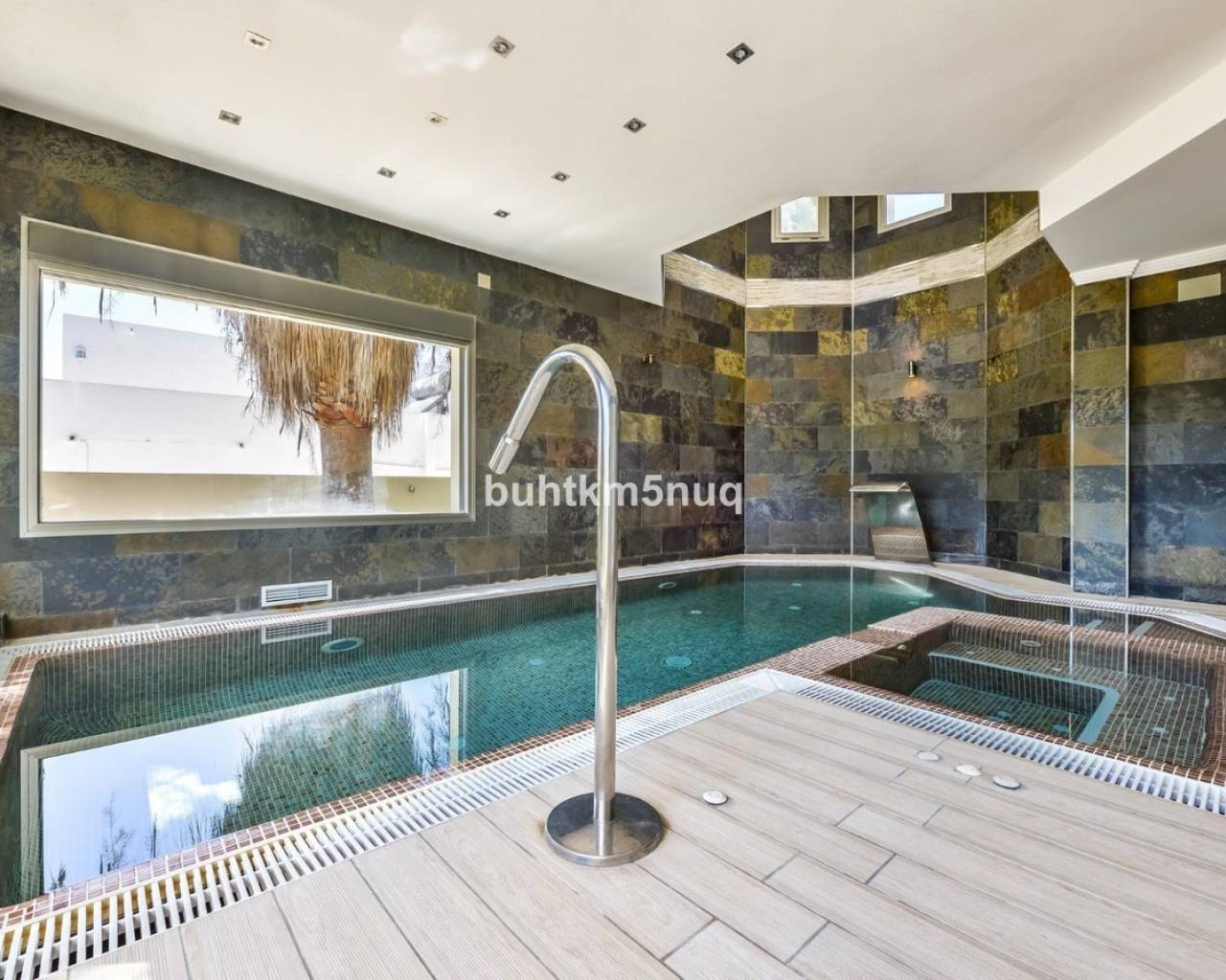 This amazing property of 585 sqm is divided over 3 floors, and built on a plot of 1843 sqm. The main living-area has a very impressive entrance, giving access to the livingroom, kitchen with storage-room, inside pool, fitness-room and guest-toilet. 2 staircases lead to the sleeping-area, having 4 big bedrooms each with its bathroom ensuite and an office. The guest-apartment at the groundfloor has a living-room with an inviting bar, a large kitchen, a bedroom and a bathroom. Electric shutters. Gas central floor-heating. AC room-units. Carport for 3 cars, and private parking for 3 more cars. Pool with overflow.