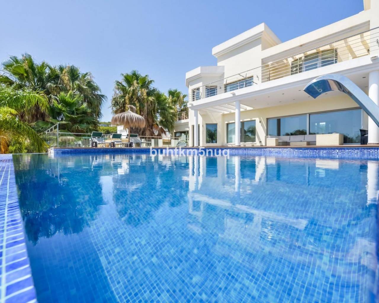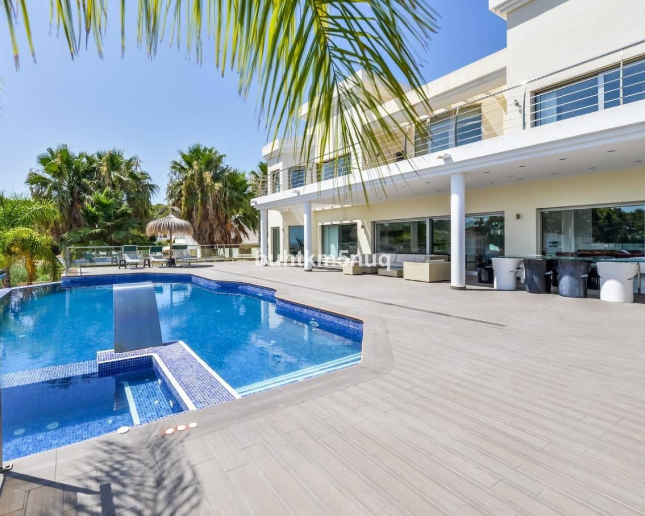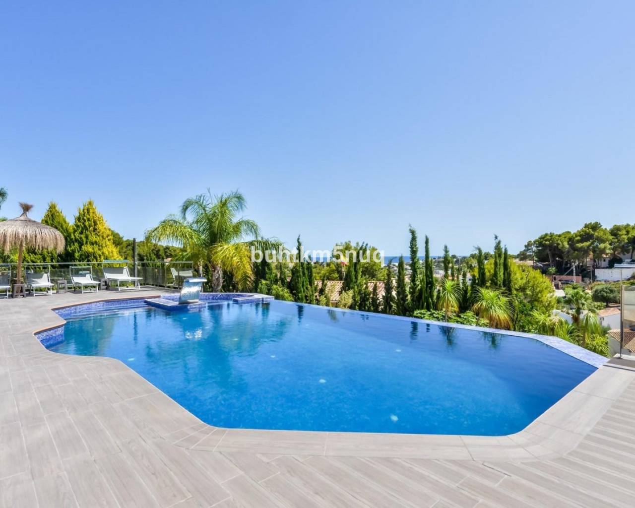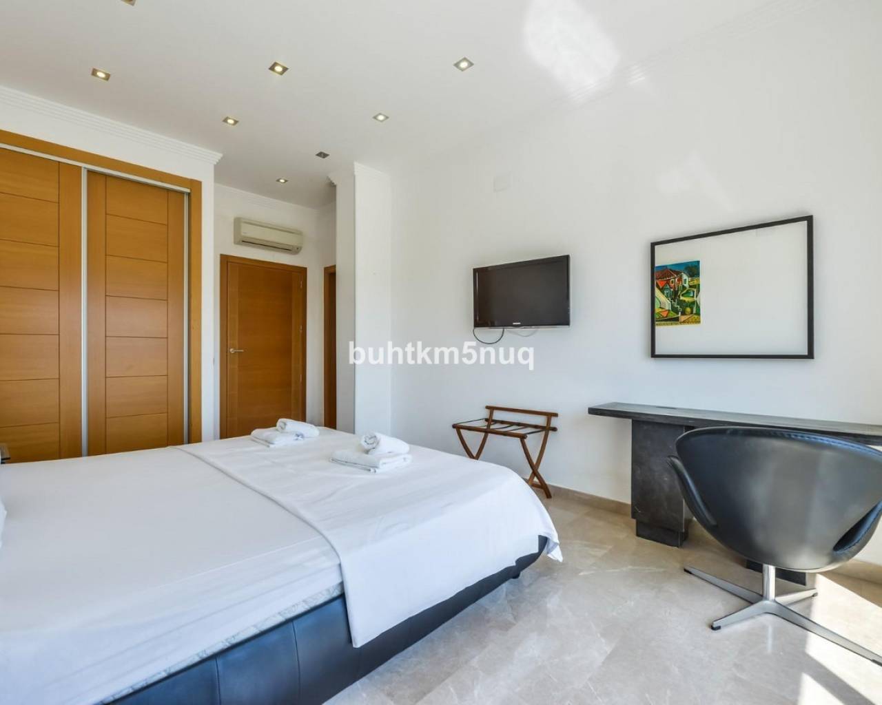 This amazing property of 585 sqm is divided over 3 floors, and built on a plot of 1843 sqm. The main living-area has a very impressive entrance, giving access to the livingroom, kitchen with storage-room, inside pool, fitness-room and guest-toilet. 2 staircases lead to the sleeping-area, having 4 big bedrooms each with its bathroom ensuite and an office. The guest-apartment at the groundfloor has a living-room with an inviting bar, a large kitchen, a bedroom and a bathroom. Electric shutters. Gas central floor-heating. AC room-units. Carport for 3 cars, and private parking for 3 more cars. Pool with overflow.