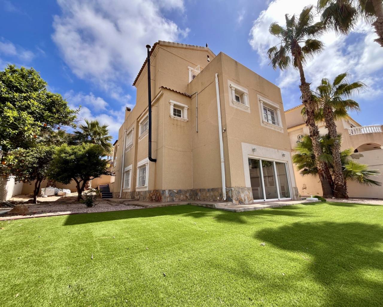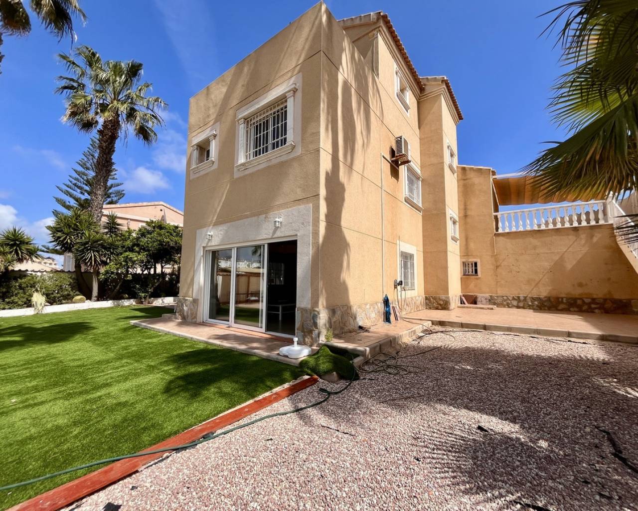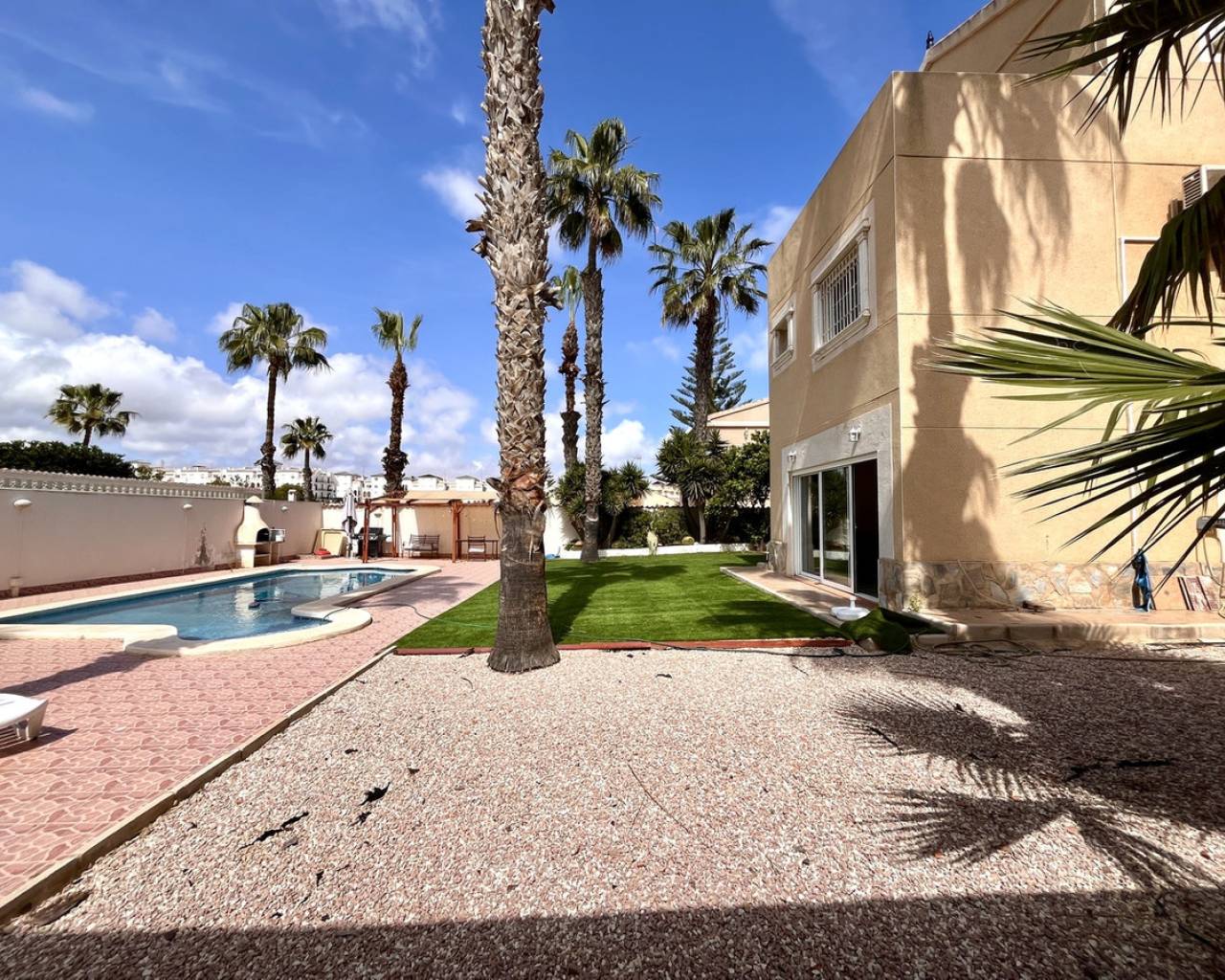 A exceptional detached villa, located in the highly sought-after and prestigious area of La Zenia, renowned for its proximity to local amenities, stunning beaches, and vibrant lifestyle. This impressive property is just a short stroll from the golden sands of La Zenia beach and the popular La Zenia Boulevard shopping centre, offering an unbeatable location for both convenience and leisure. The villa is accessed through secure electric gates, which open onto a large private driveway with ample space for parking. Once inside, the property reveals an expansive and contemporary design, featuring 5 spacious bedrooms and 3 beautifully appointed bathrooms, offering plenty of room for both family living and entertaining. The ground floor is dedicated to an open-plan living area that exudes a sense of space and light. The lounge, dining, and kitchen areas flow seamlessly, creating the perfect environment for modern living. Large patio doors open directly onto the covered terrace, providing an effortless connection between the indoor and outdoor living areas. The private pool, surrounded by well-maintained gardens, offers a peaceful oasis for relaxation, outdoor dining, and entertaining in style. The villa is set on a generous plot of approximately 700m², providing an abundance of outdoor space, perfect for enjoying the Mediterranean climate. The beautifully landscaped gardens surround the property, creating a private and tranquil atmosphere. There is plenty of room for further outdoor enhancements, such as a barbecue area or additional seating areas. This stunning home is presented in immaculate, "key-ready" condition, making it move-in ready without the need for any additional work. With modern fixtures and fittings throughout, this villa offers a blend of luxury, comfort, and convenience, providing everything you need for a perfect family home or a luxurious holiday retreat. Whether you're looking for a permanent residence or a holiday home, this villa offers exceptional value in one of the most desirable locations on the Costa Blanca. The combination of a prime location, spacious living areas, and high-end features makes this property a true gem.