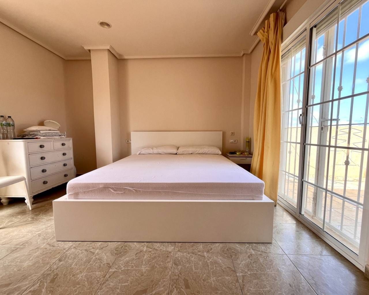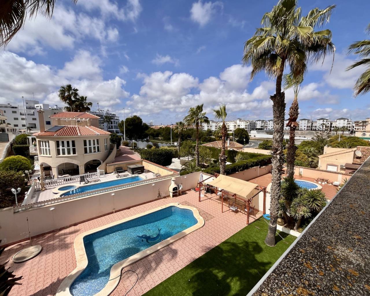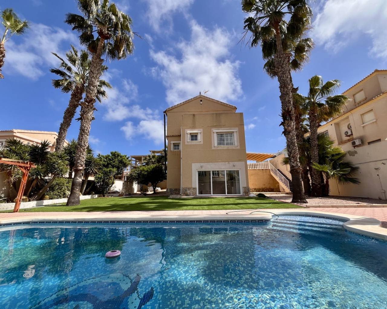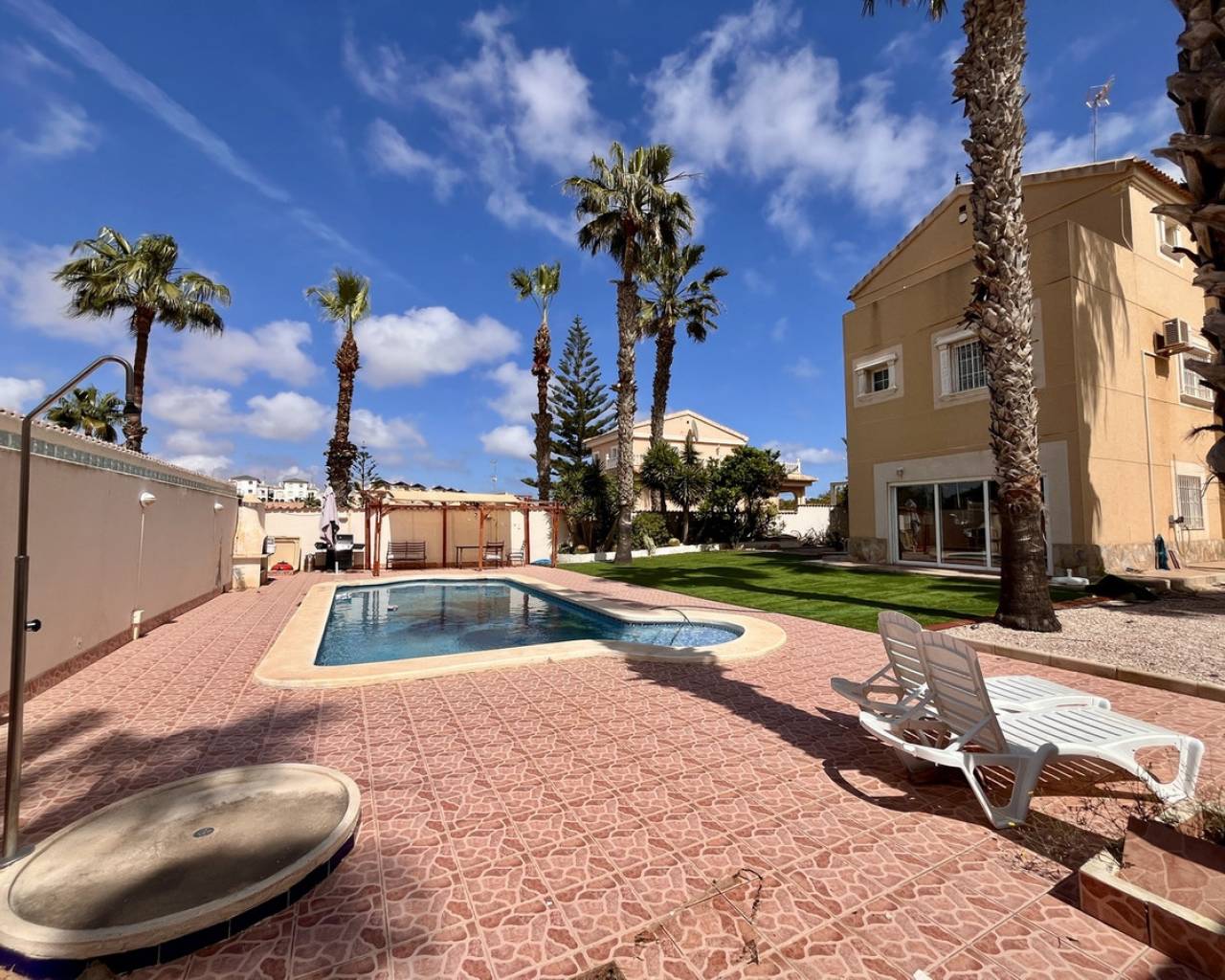 A exceptional detached villa, located in the highly sought-after and prestigious area of La Zenia, renowned for its proximity to local amenities, stunning beaches, and vibrant lifestyle. This impressive property is just a short stroll from the golden sands of La Zenia beach and the popular La Zenia Boulevard shopping centre, offering an unbeatable location for both convenience and leisure. The villa is accessed through secure electric gates, which open onto a large private driveway with ample space for parking. Once inside, the property reveals an expansive and contemporary design, featuring 5 spacious bedrooms and 3 beautifully appointed bathrooms, offering plenty of room for both family living and entertaining. The ground floor is dedicated to an open-plan living area that exudes a sense of space and light. The lounge, dining, and kitchen areas flow seamlessly, creating the perfect environment for modern living. Large patio doors open directly onto the covered terrace, providing an effortless connection between the indoor and outdoor living areas. The private pool, surrounded by well-maintained gardens, offers a peaceful oasis for relaxation, outdoor dining, and entertaining in style. The villa is set on a generous plot of approximately 700m², providing an abundance of outdoor space, perfect for enjoying the Mediterranean climate. The beautifully landscaped gardens surround the property, creating a private and tranquil atmosphere. There is plenty of room for further outdoor enhancements, such as a barbecue area or additional seating areas. This stunning home is presented in immaculate, "key-ready" condition, making it move-in ready without the need for any additional work. With modern fixtures and fittings throughout, this villa offers a blend of luxury, comfort, and convenience, providing everything you need for a perfect family home or a luxurious holiday retreat. Whether you're looking for a permanent residence or a holiday home, this villa offers exceptional value in one of the most desirable locations on the Costa Blanca. The combination of a prime location, spacious living areas, and high-end features makes this property a true gem.