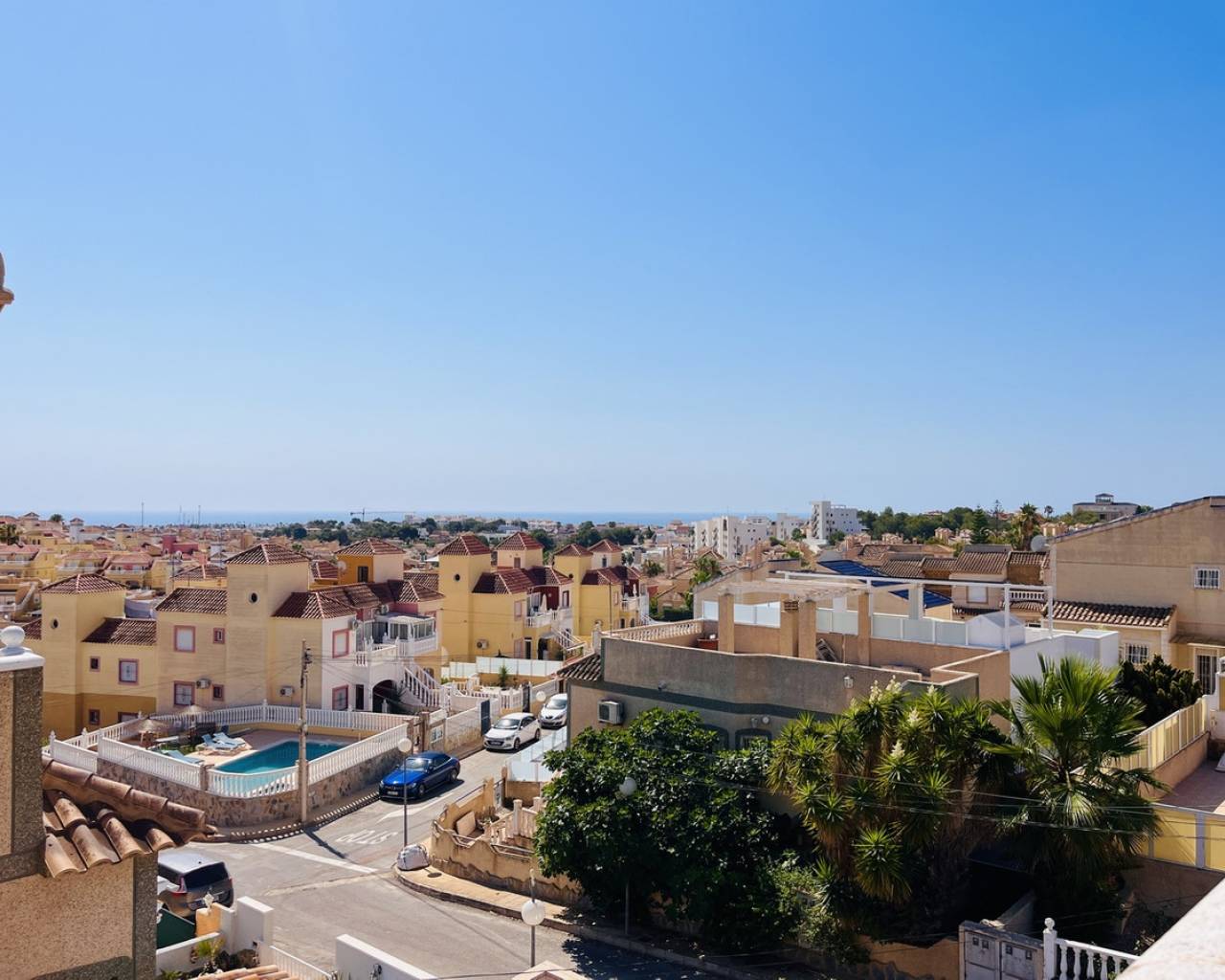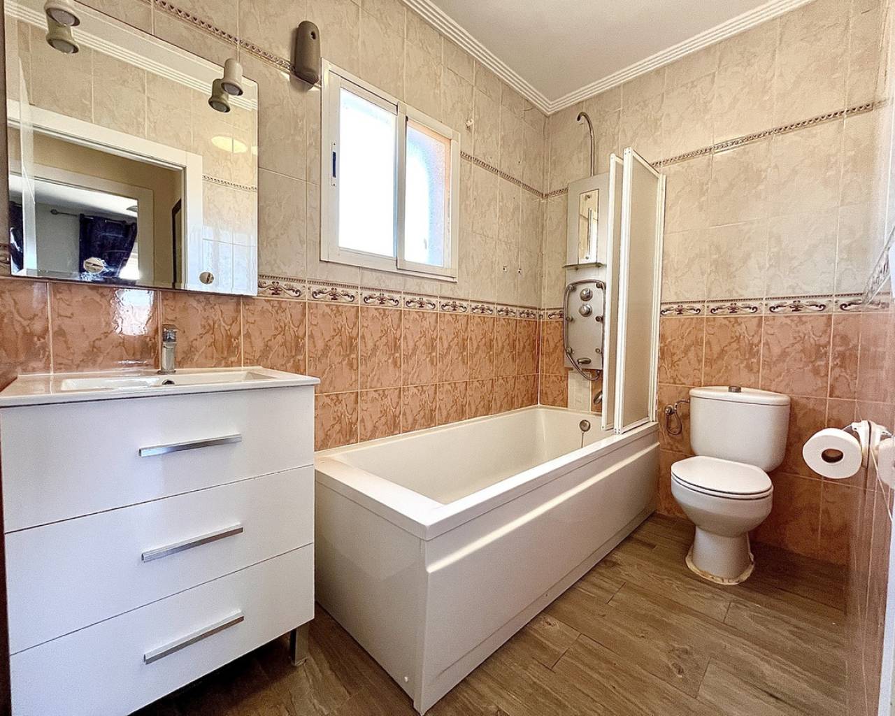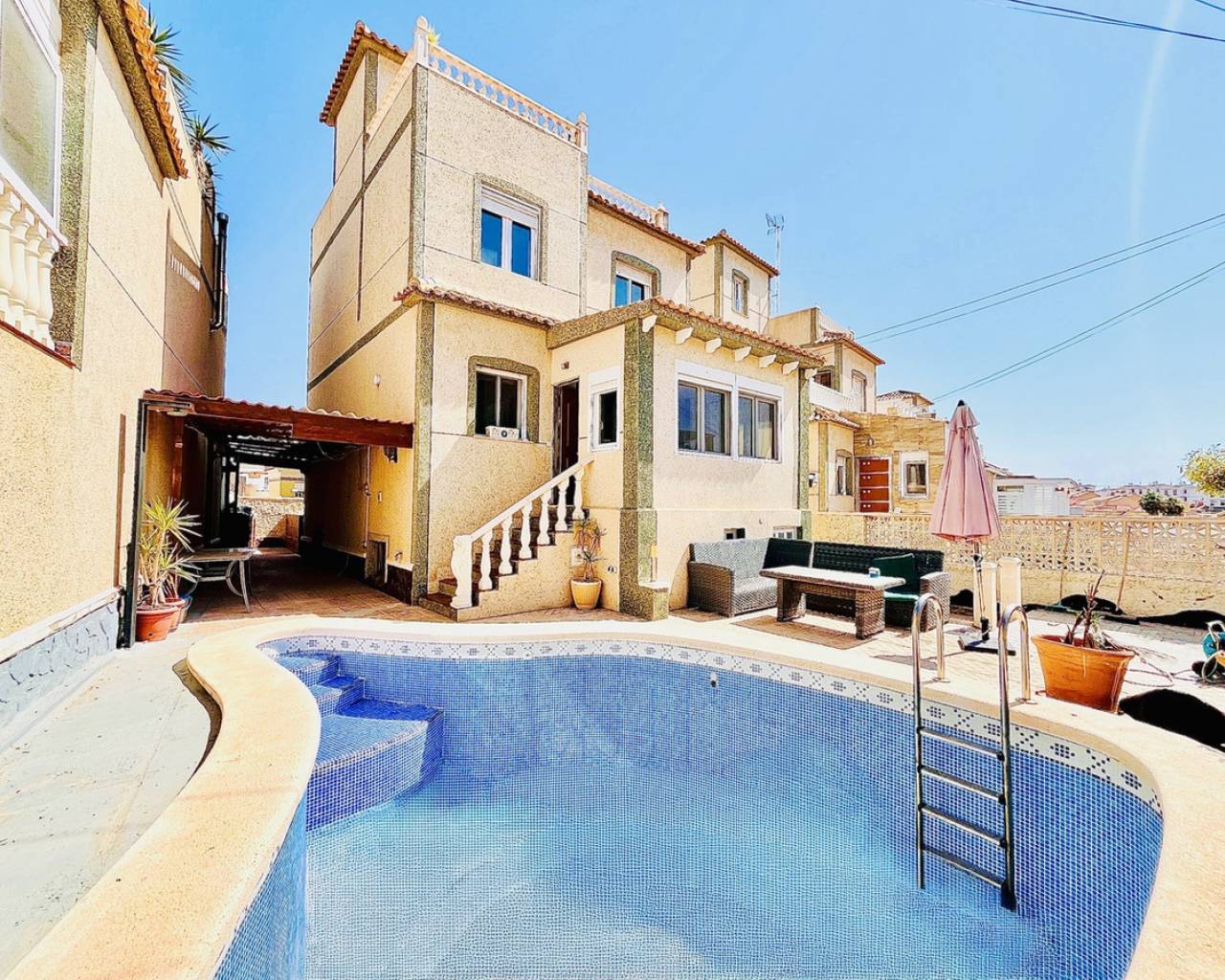 A fantastic opportunity to purchase this spacious and versatile 4-bedroom, 3-bathroom detached villa, perfectly located in the popular residential area of San Miguel de Salinas. Spread across four levels, the property boasts a bright and generous living room, a separate kitchen, and multiple outdoor spaces to enjoy the Mediterranean lifestyle. One of the standout features is the fully self-contained 1-bedroom apartment in the underbuild, complete with its own private access from the front garden, ideal for visiting family, guests, or a potential rental income. The villa also benefits from a large private solarium offering beautiful panoramic sea views — the perfect space for sunbathing, relaxing, or entertaining with friends. Set within easy walking distance to a great selection of local bars, restaurants, and services, and just a short stroll to the famous Villamartin Plaza, golf course, and a 10-minute drive to several blue Flag beaches. An ideal property for anyone looking for a holiday retreat, a spacious family home, or an investment with excellent rental potential in a sought-after and tranquil setting.