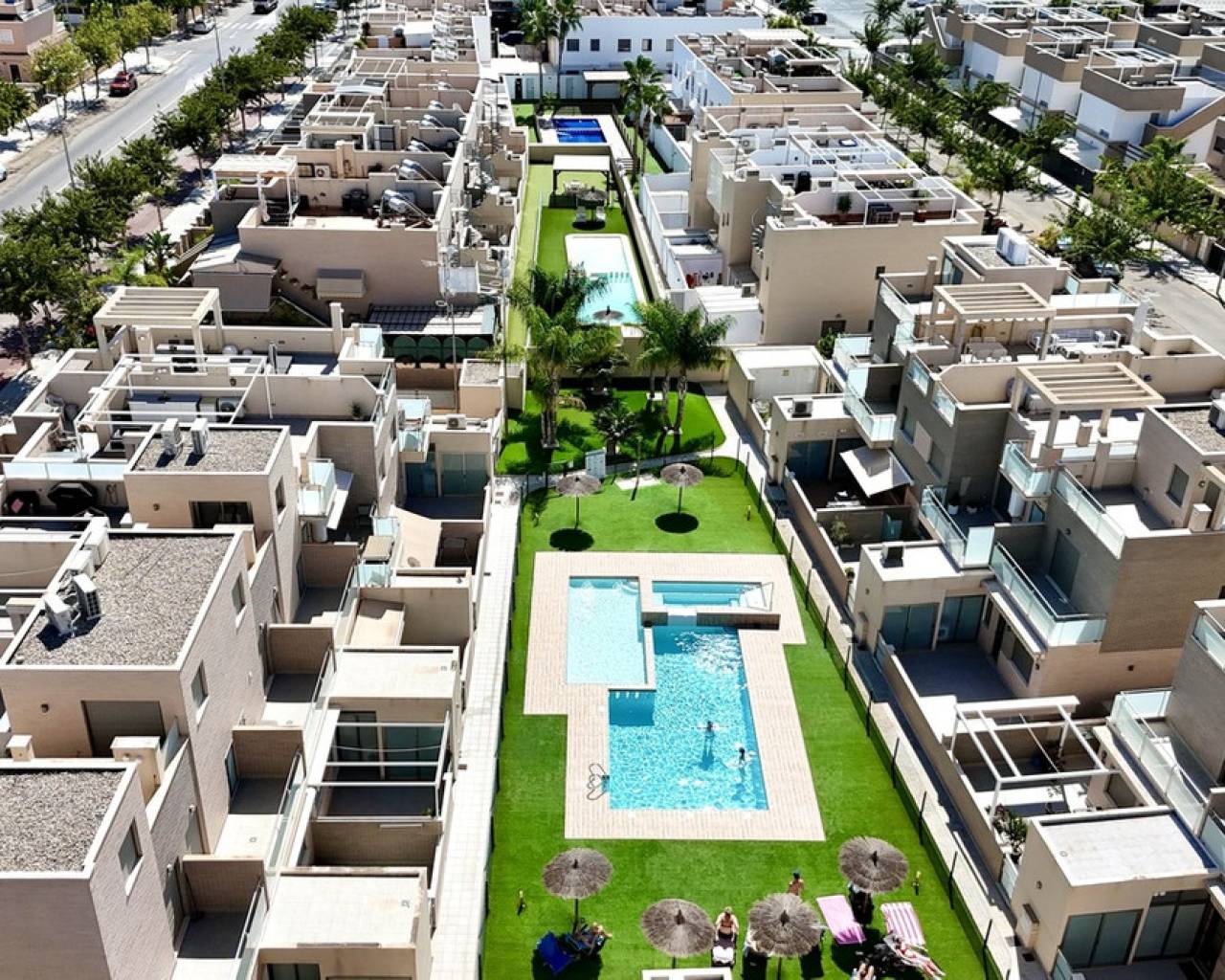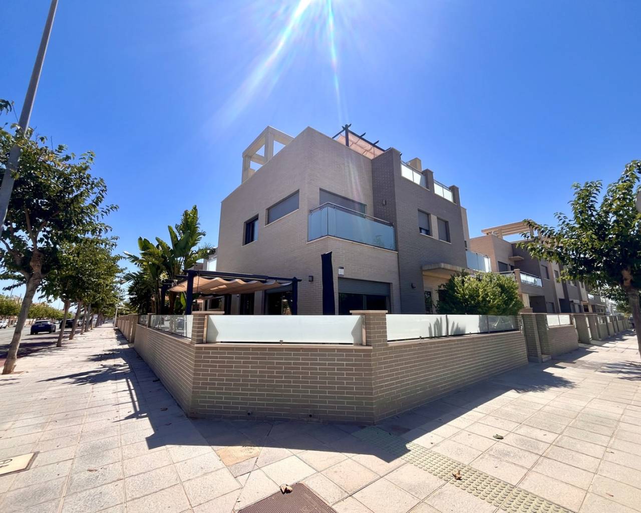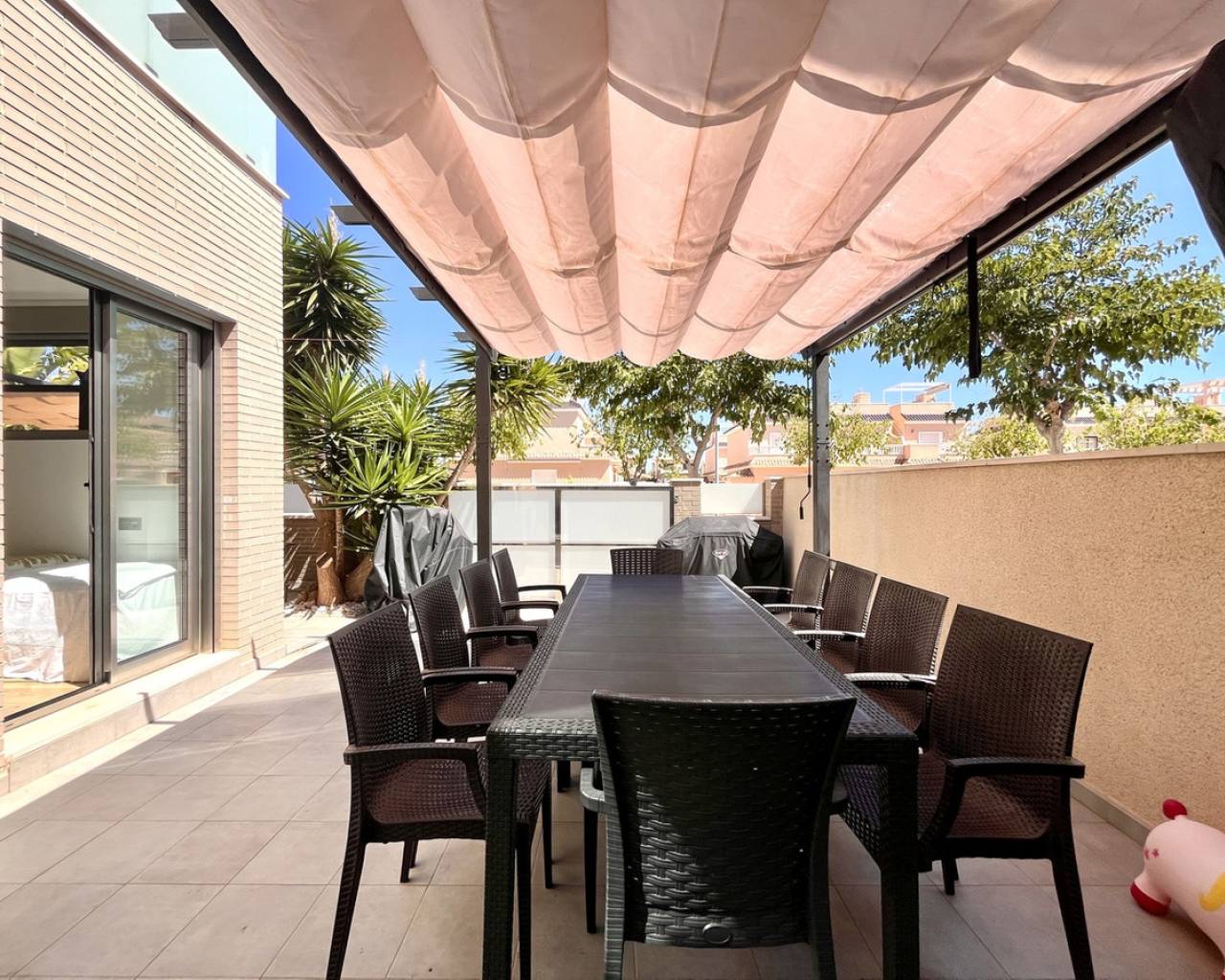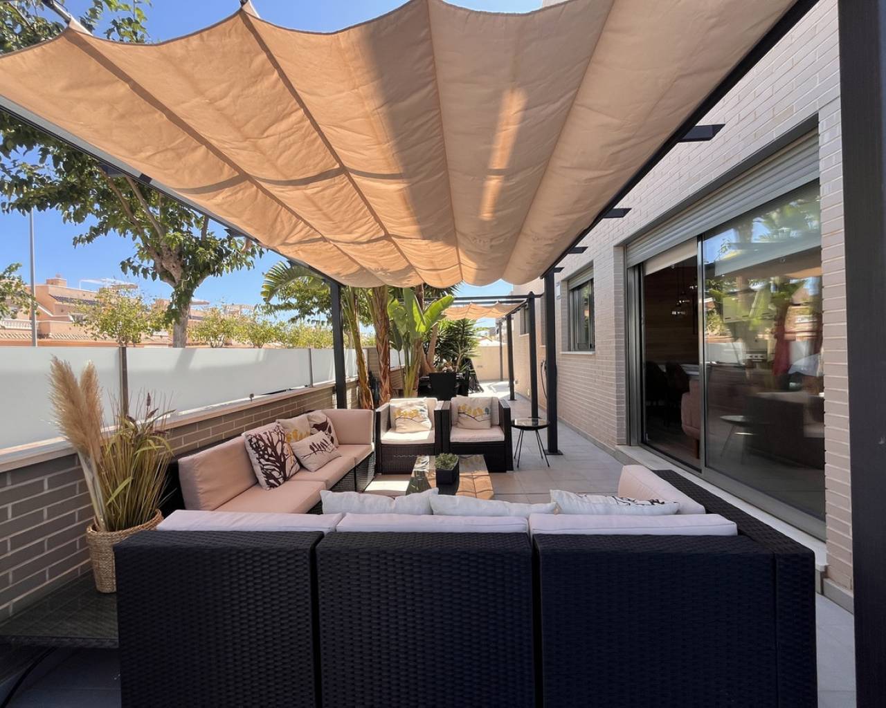 Step into modern coastal living with this exceptional 4 bedroom, 4 bathroom semi-detached home in the sought-after Torre de la Horadada. Located just 800 metres from pristine beaches, this property offers a rare combination of style, convenience, and Mediterranean charm. A short stroll takes you to the vibrant Nueva Plaza, filled with bars, restaurants, and local services, while the well-known main plaza is just two minutes away. For golf lovers, Lo Romero Golf Course is only a 15-minute drive. Sold fully furnished and ready to move into, this home is designed for effortless living. The open, light-filled spaces lead onto a large wraparound terrace with all-day sun, a private solarium with stunning sea views, pristine communal pool that can be accessed directly from the street — perfect for coming back from the beach and enjoying a swim without entering the house.. Every detail has been considered, from electric blinds with an automated security system in every room, to air conditioning throughout, built-in wardrobes, and two beautifully appointed en-suite bedrooms. The bathrooms feature underfloor heating for a touch of luxury all year round. With its unbeatable location just metres from the beach, top-quality finishes, and thoughtful design, this property is everything you need to enjoy your dream life on the Costa Blanca.