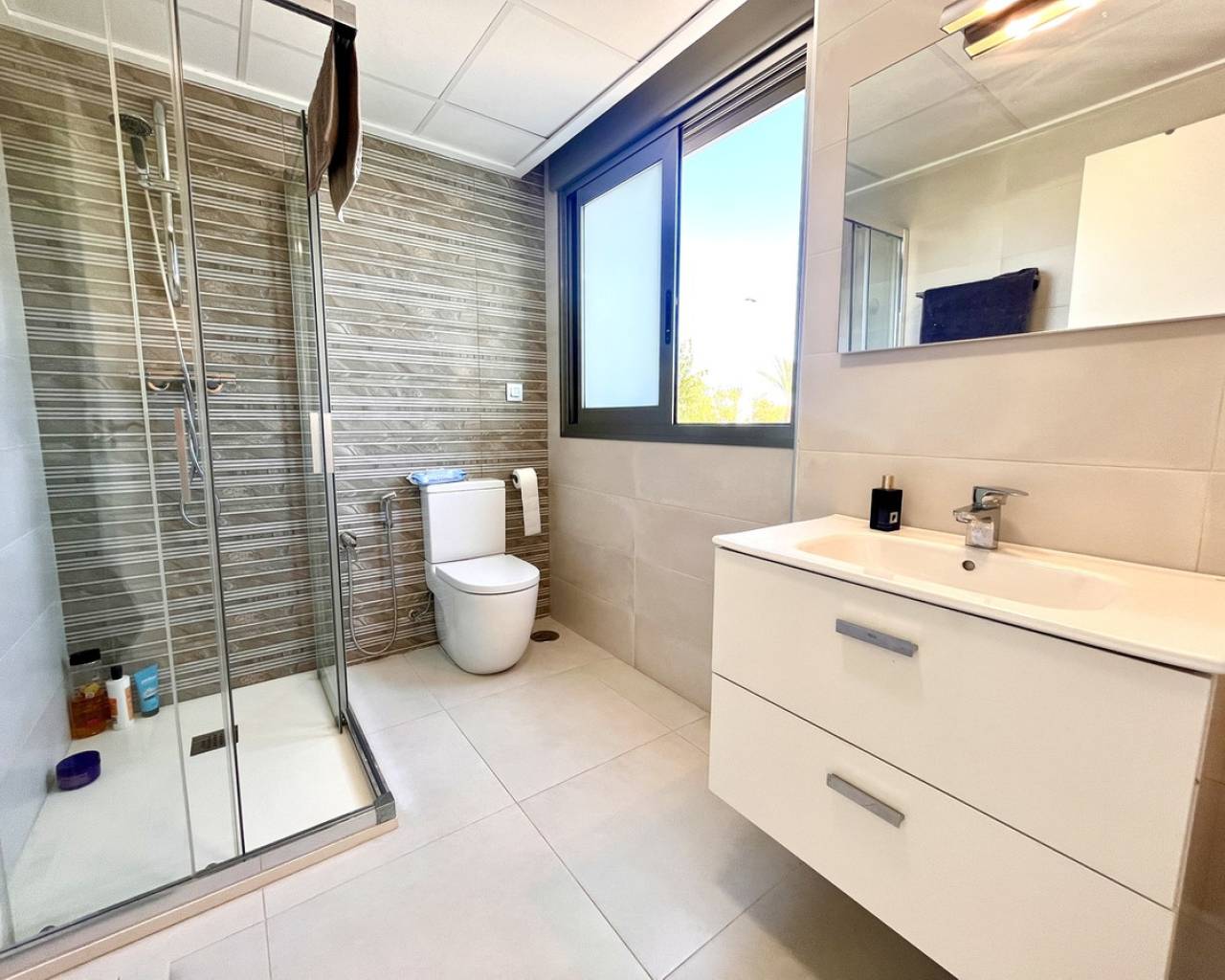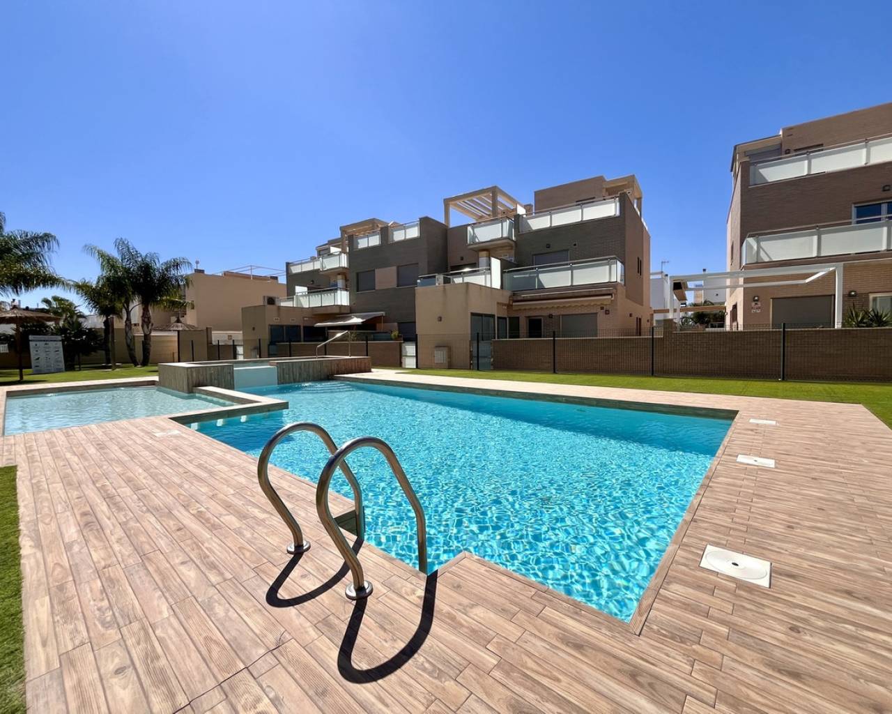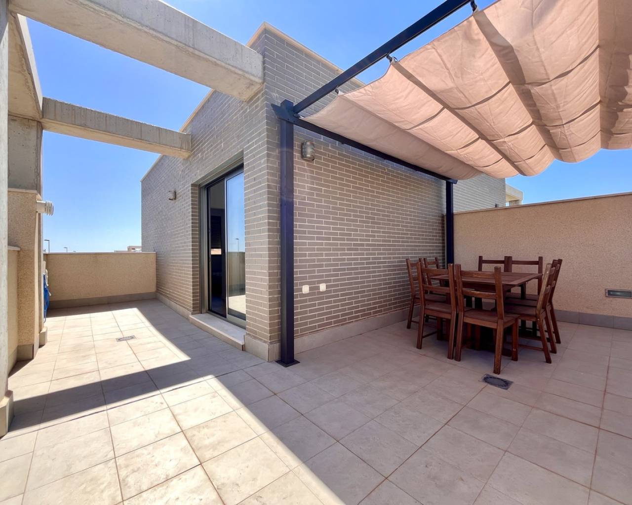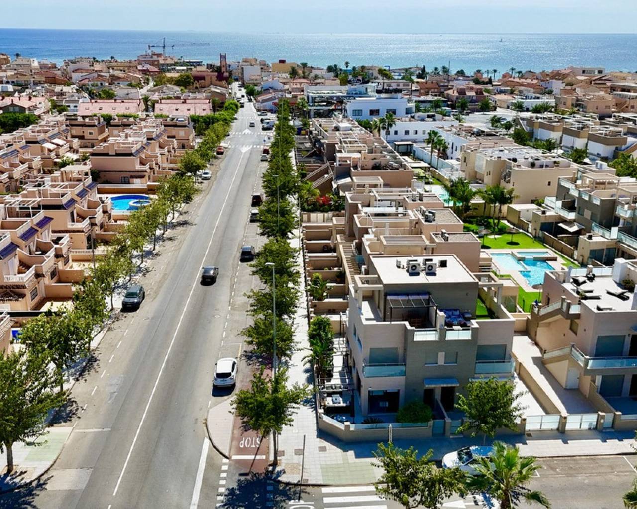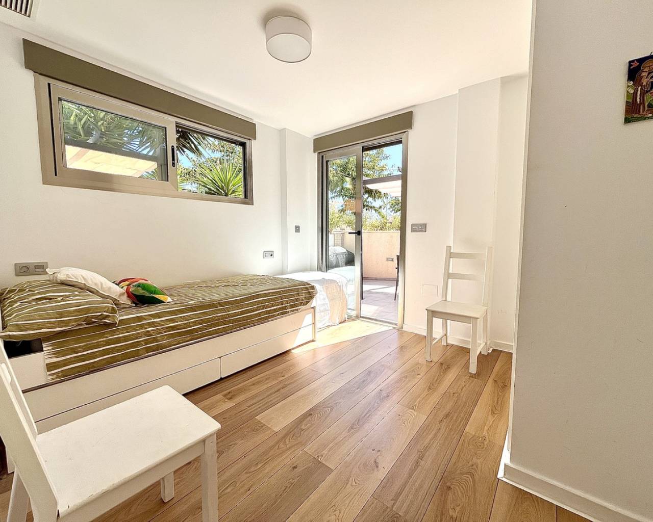 Step into modern coastal living with this exceptional 4 bedroom, 4 bathroom semi-detached home in the sought-after Torre de la Horadada. Located just 800 metres from pristine beaches, this property offers a rare combination of style, convenience, and Mediterranean charm. A short stroll takes you to the vibrant Nueva Plaza, filled with bars, restaurants, and local services, while the well-known main plaza is just two minutes away. For golf lovers, Lo Romero Golf Course is only a 15-minute drive. Sold fully furnished and ready to move into, this home is designed for effortless living. The open, light-filled spaces lead onto a large wraparound terrace with all-day sun, a private solarium with stunning sea views, pristine communal pool that can be accessed directly from the street — perfect for coming back from the beach and enjoying a swim without entering the house.. Every detail has been considered, from electric blinds with an automated security system in every room, to air conditioning throughout, built-in wardrobes, and two beautifully appointed en-suite bedrooms. The bathrooms feature underfloor heating for a touch of luxury all year round. With its unbeatable location just metres from the beach, top-quality finishes, and thoughtful design, this property is everything you need to enjoy your dream life on the Costa Blanca.