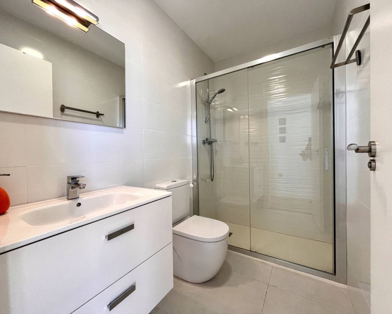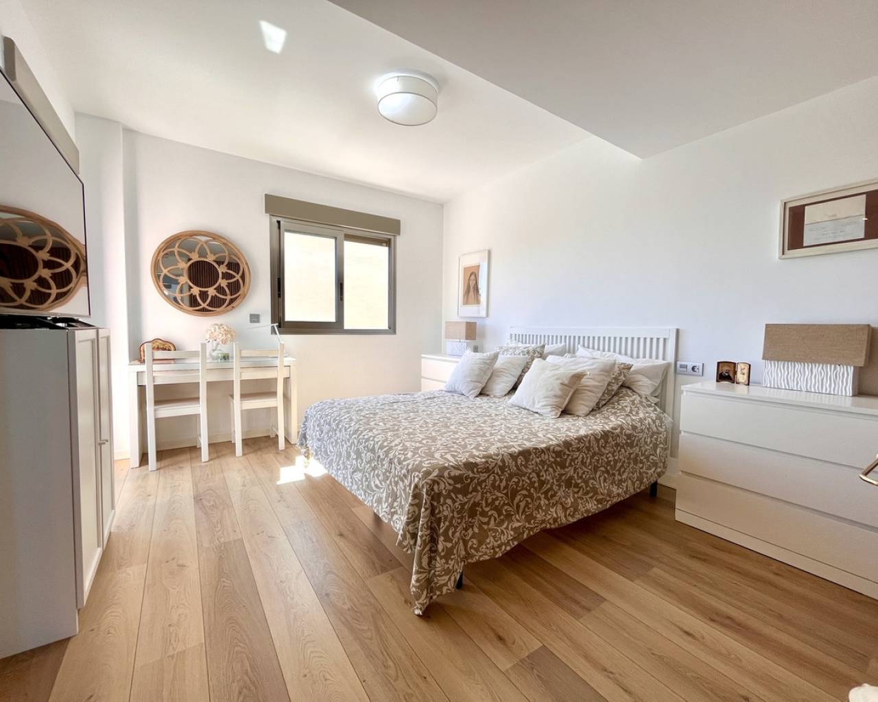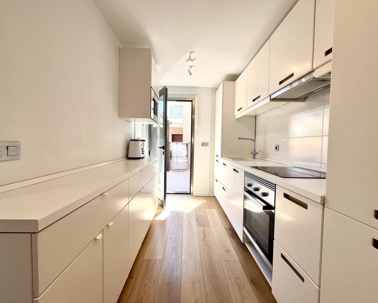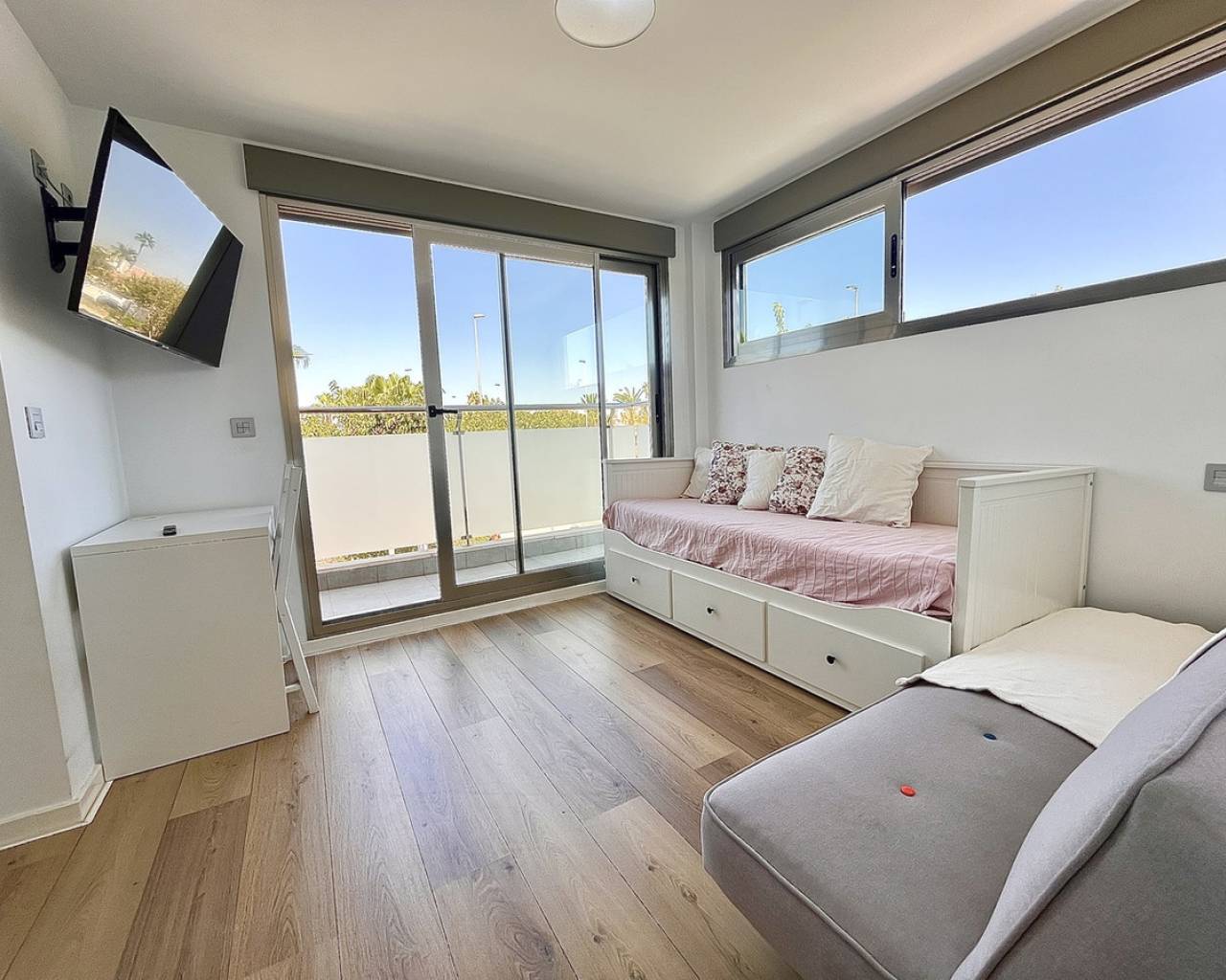 Step into modern coastal living with this exceptional 4 bedroom, 4 bathroom semi-detached home in the sought-after Torre de la Horadada. Located just 800 metres from pristine beaches, this property offers a rare combination of style, convenience, and Mediterranean charm. A short stroll takes you to the vibrant Nueva Plaza, filled with bars, restaurants, and local services, while the well-known main plaza is just two minutes away. For golf lovers, Lo Romero Golf Course is only a 15-minute drive. Sold fully furnished and ready to move into, this home is designed for effortless living. The open, light-filled spaces lead onto a large wraparound terrace with all-day sun, a private solarium with stunning sea views, pristine communal pool that can be accessed directly from the street — perfect for coming back from the beach and enjoying a swim without entering the house.. Every detail has been considered, from electric blinds with an automated security system in every room, to air conditioning throughout, built-in wardrobes, and two beautifully appointed en-suite bedrooms. The bathrooms feature underfloor heating for a touch of luxury all year round. With its unbeatable location just metres from the beach, top-quality finishes, and thoughtful design, this property is everything you need to enjoy your dream life on the Costa Blanca.