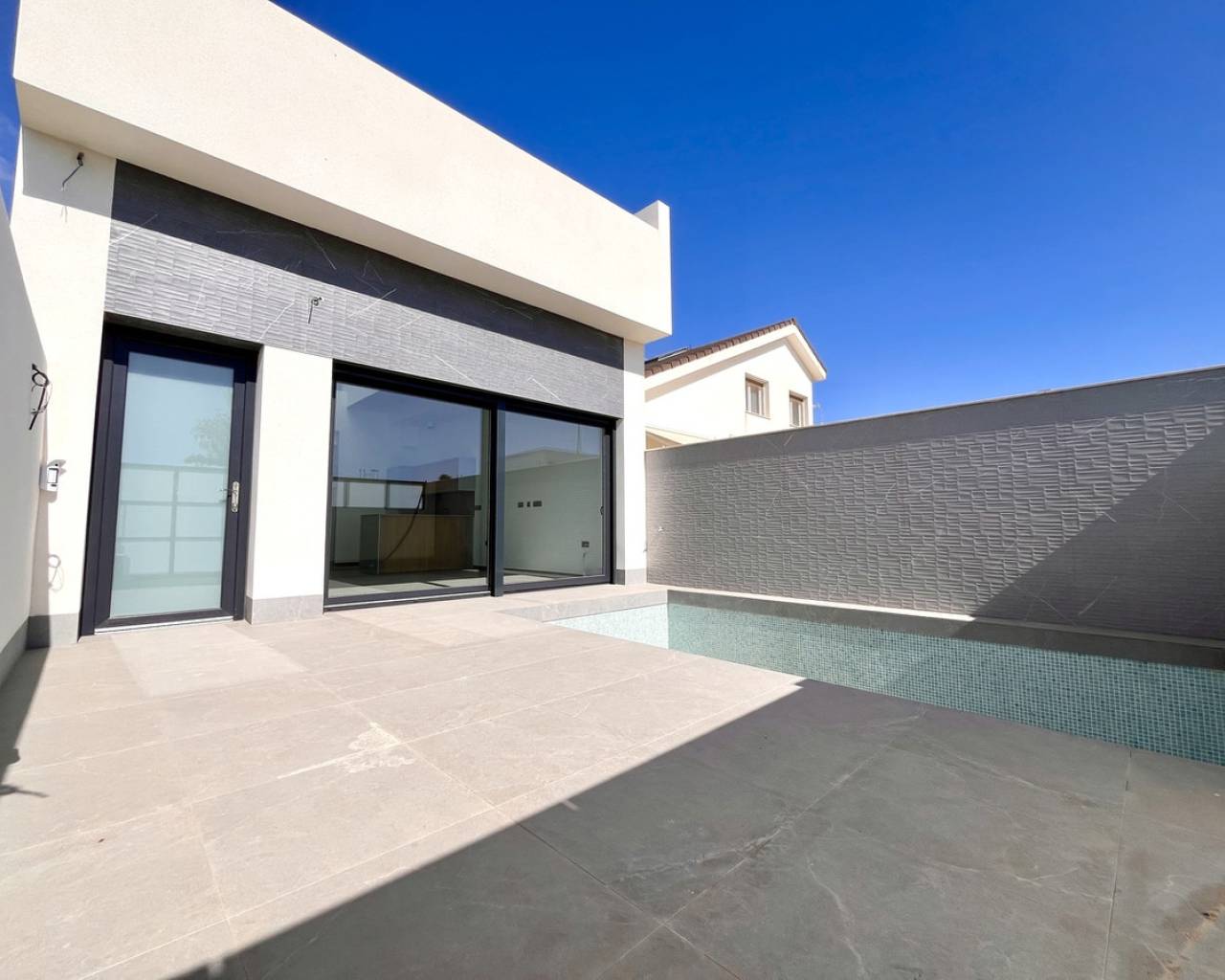 This stunning new build, three-bedroom, two-bathroom villa is located in the highly sought-after area of Lo Pagán, San Pedro del Pinatar. Designed with modern living in mind, it combines comfort, style, and practicality in one of the Costa Cálida's most desirable coastal settings. The villa welcomes you with spacious, light-filled interiors and a large open-plan kitchen that flows seamlessly into the living area, creating an inviting space for family life or entertaining. Each of the three bedrooms includes fitted wardrobes, while clever additional storage is provided under the stairs with built-in cupboards. Outdoor living is at the heart of this home. A private swimming pool offers the perfect place to cool off on warm summer days, while the large solarium provides an ideal setting for sunbathing, dining, or simply relaxing in the Mediterranean climate. Practical touches add further value, including a private driveway with secure parking and an electric car charging point, ensuring both convenience and peace of mind. The location is exceptional. Just a short stroll brings you to the Dos Mares Commercial Centre, while the prestigious Colegio Castelar, the sandy Mar Menor beaches, and the lively Lo Pagán promenade are all close by. This villa represents a rare opportunity to enjoy contemporary design, prime location, and relaxed coastal living whether you are seeking a permanent residence, a holiday home, or a smart investment on Spain's southeast coast.