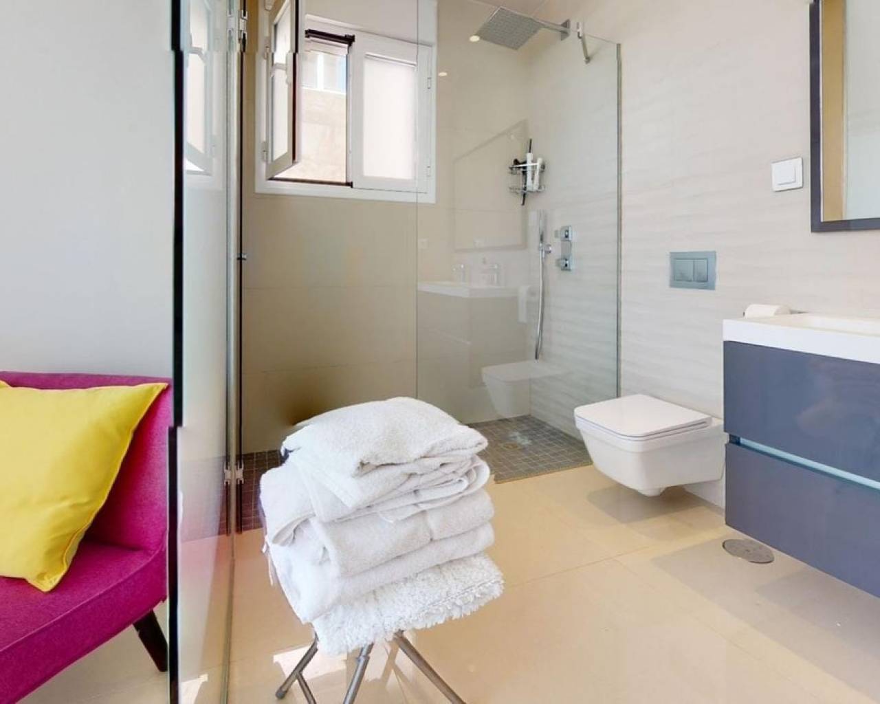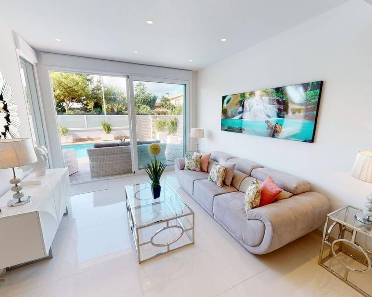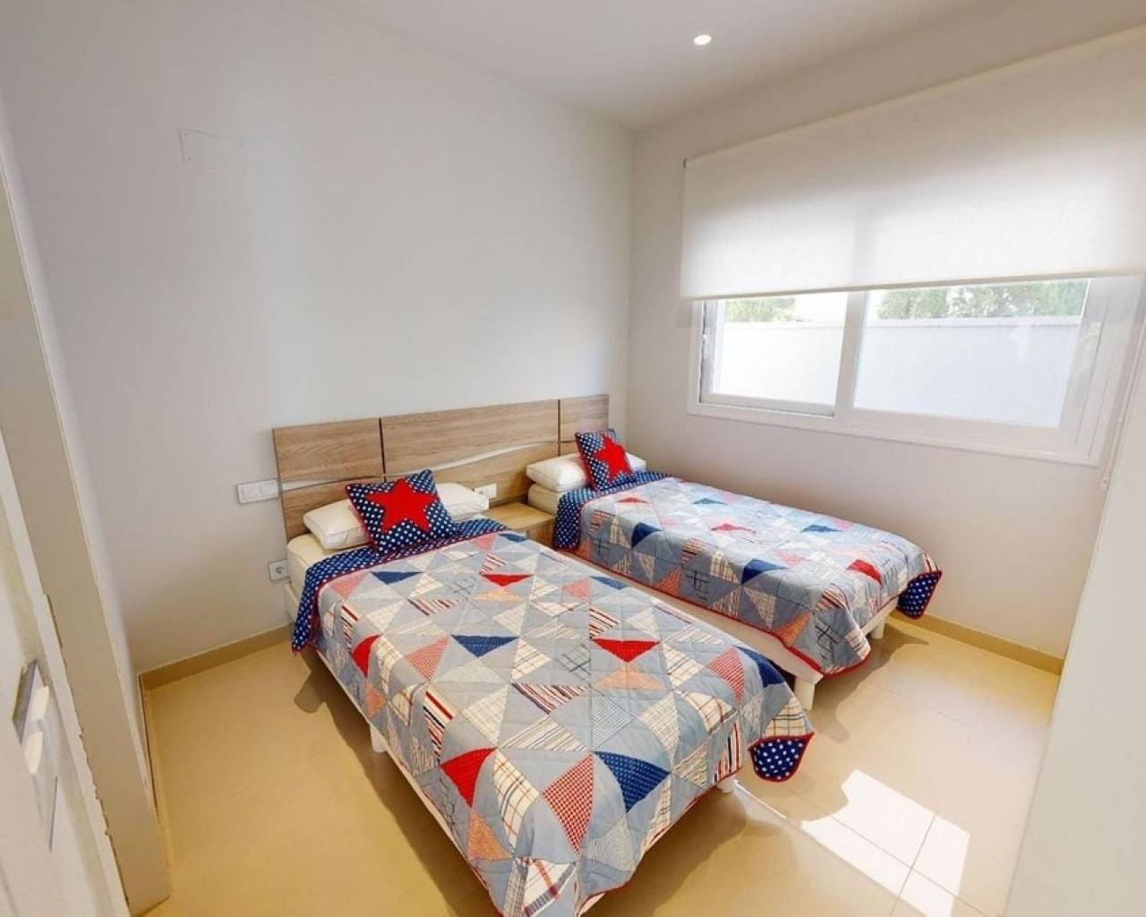 This is superbly presented modern detached villa, located in a quiet area of Torrevieja, but within walking distance to the beach, the marina and the amenities in the centre of Torrevieja. The villa is south facing and so benefits from sunshine throughout the day and on entering the plot, there is a good sized private swimming pool, which is heated and plenty of space to sit and enjoy the weather including area´s to have some sun and also a terrace which can provide some shade. The garden also has a storage area, plants and trees and is immaculately maintained. Inside, there is a large living / dining area, with patio doors that open up to the garden / pool area, one bedroom with en-suite bathroom, a storage area and one toilet. The kitchen has been very well designed and has a door leading to the back garden, so plenty of light comes into the property. Stairs lead up to the first floor, where there are a further two bedrooms and two bathrooms. The main bedroom has access to a private terrace. A further set of stairs lead up to the roof solarium, which has lovely views to the surrounding area and also has a storage area. The added bonus of this beautiful villa is the under-build, access via internal stairs on the ground floor which has a very large living area, complete with a sizeable sofa, TV on the wall and storage. The fourth bedroom is also located here with another en-suite bathroom. The villa is being sold furnished and benefits from ducted air-conditioning throughout, electric blinds, fully functioning kitchen, BBQ, heated swimming pool and an alarm system. For more information, please do not hesitate to contact us.