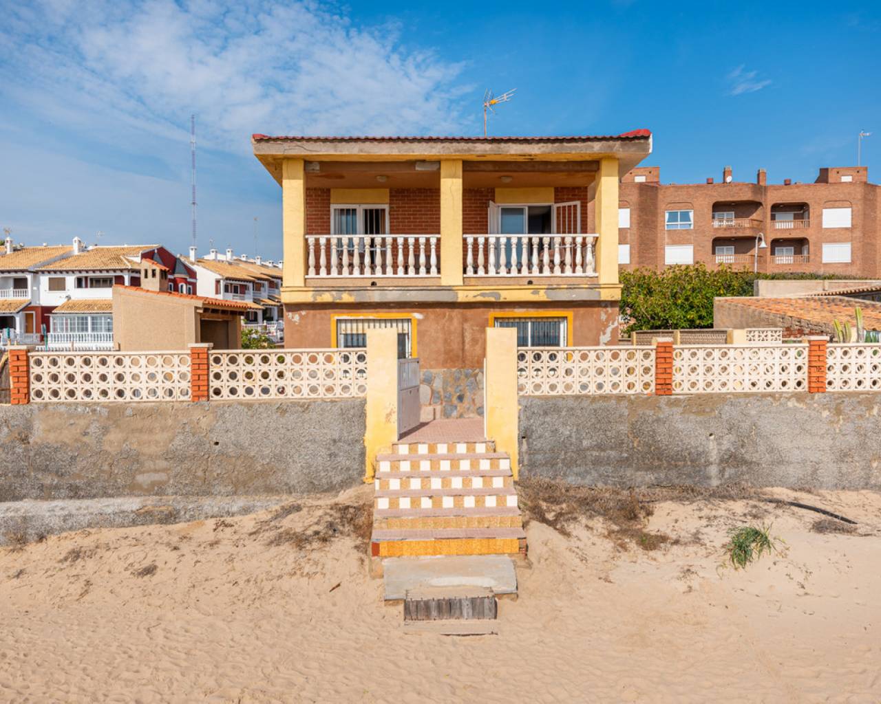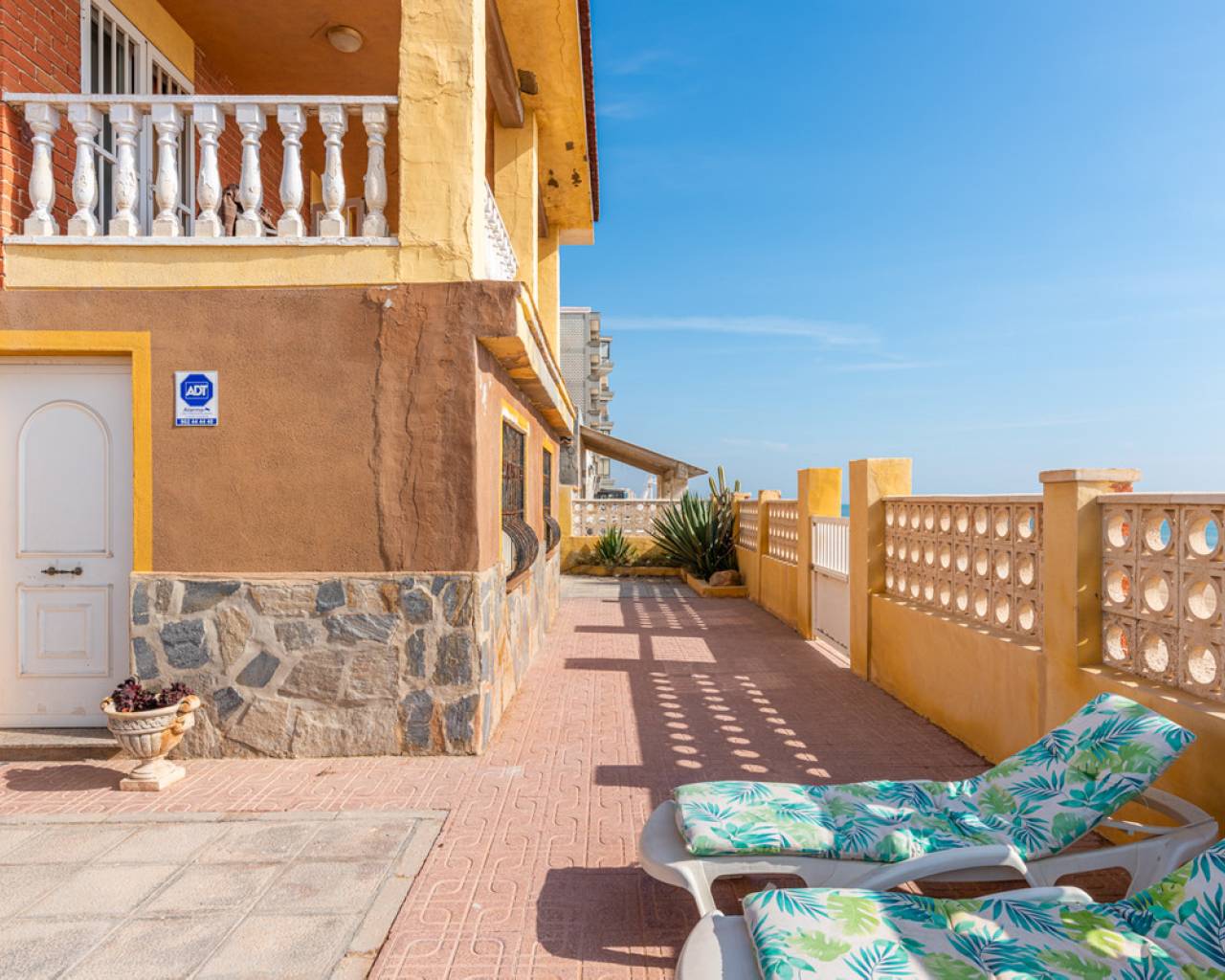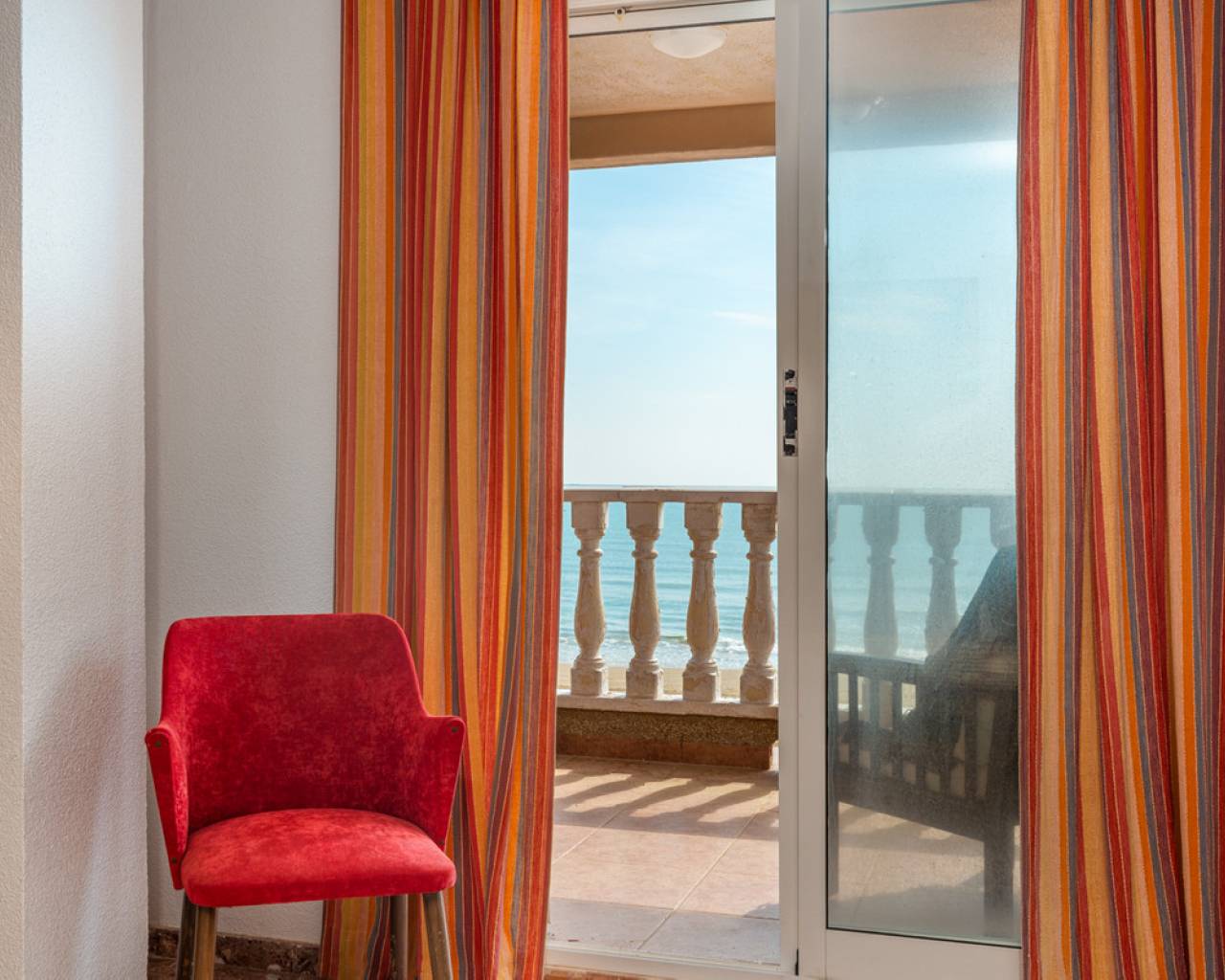 Unique opportunity 7 bedrooms villa on the beach. The villa is built on a 467 sqm plot and has a living size of 266 sqm set over two floors. The villa consist of seven bedrooms, three bathrooms one of them en-suite, open-plan kitchen, living/dining room, cover terrace, garage, garden with private direct access to the beach and a BBQ area. The villa is in condition to enter directly to live but is also a great opportunity to renovate it and have a luxury modern property in one of the best location on the Costa Blanca coast. When you access the villa you will find the living/dinning room, further on you have the open-plan kitchen which give you direct access to the other side of the garden. From the living room you will take the stairs to the first floor where you can find, two bedrooms (one of them with an en suite barthroom) with direct access to the cover terrace that has stunning sea views. Down the corredor you will find five more bedrooms and another bathroom. In the garage, with space for more than one vehicle, you will also find one more bathroom and a storage room. The villa comes fully furnished and it is equipped double glazed windows and mosquito nets. Outdoor area Here you will find a tiled garden with a BBQ area. From the garden you have private direct access to the beach. Area Guardamar is a cozy and popular place on the Costa Blanca, with a wonderful beach of 11 km of fine sand, dunes, and a beautiful park that stretches for kilometers through the town. You will also find shops, supermarkets, restaurants, coffee shops, bars, pharmacies, banks, medical and dental services, and everything you may need. As well as marina, tennis courts, soccer field, gyms and others. It is located very close to the La Marquesa golf course and the water park of Rojales, as well as only 10 km from Torrevieja, which offers a wide leisure program for all ages, shopping centers and more. Beaches The magnificent beach of "Torrelamata" in La Mata is the next to Guardamar, so the extension of wonderful beaches seems endless. Climate Guardamar is an ideal place to live, and lovely to spend the summer. Summers are always sunny and warm, while winters are mild, and the area has an average temperature of 20 degrees. Guardamar is located between the salt pans of Santa Pola, and those of Torrevieja that have an air purifying effect and help to give the area a salubrious and particularly favorable environment. The climate has an especially positive effect on people with asthma, allergies, rheumatism and skin diseases. According to medical science, the area belongs to one of the healthiest places in the world thanks to the salt lakes. Shopping In Guardamar you will find a large number of shops of all kinds and supermarkets. Also in Torrevieja, which is about 10 minutes by car, is the Habaneras and Carrefour shopping center, as well as a shopping street with a variety of shops. 15 kilometers away is the large shopping center Zenia Boulevard, where you will find a variety of shops such as Zara, Massimo Dutti, H & M, Stradivarius, Oysho, Mango, Primark, Pull & Bear, Decathlon, Guess, Kiko, Druni, Rituals , Swarowski, Leroy Merlin and many more. Golf At 7 km, in Ciudad Quesada you will find the well known golf course "La Marquesa Golf & Country Club". There are a number of nearby golf courses, such as Las Colinas Golf & Country Club, La Finca Golf, Golf Las Ramblas Golf Villamartin, Lo Romero Golf, Vistabella Golf, Real Club Golf Campoamor and Golf Greenlands that are within a radius of 20 kilometers. Yachting and water sports Within a radius of 20 kilometers there are several nautical and marine clubs. In Torrevieja you will find three, while there is one in Guardamar del Segura and two in Santa Pola. Here you will find sailing schools, windsurfing and diving schools, to name a few. Several places in the area rent boards for SUP (stand up paddle-boarding), and several beaches offer water activities such as fly-boarding, banana boats, jet skis and more. Hospitals and health care In Torrevieja there is a modern public hospital that enjoys excellent reputation, and also the Hospital Quirón, which is a private hospital and is also located in Torrevieja. For health, the Mar Menor Lagoon is also ideal, which is about 40 minutes away by car. It is one of the largest salt water lagoons in Europe with a maximum depth of approximately 7 meters. The high salinity of the water provides a microclimate that is very healthy, especially for people with heart problems, rheumatism, arthritis or lung diseases. The saline mud bath is also famous for relieving skin diseases such as psoriasis, and is recommended by many specialists. How to get Guardamar is approximately 30 minutes by car from Alicante airport, and about 55 minutes from Murcia airport. From Guardamar you can easily reach the main cities in the area through the A-7 motorway or the N-332 highway, such as Elche, Alicante, Valencia, Murcia and Cartagena, to name a few.