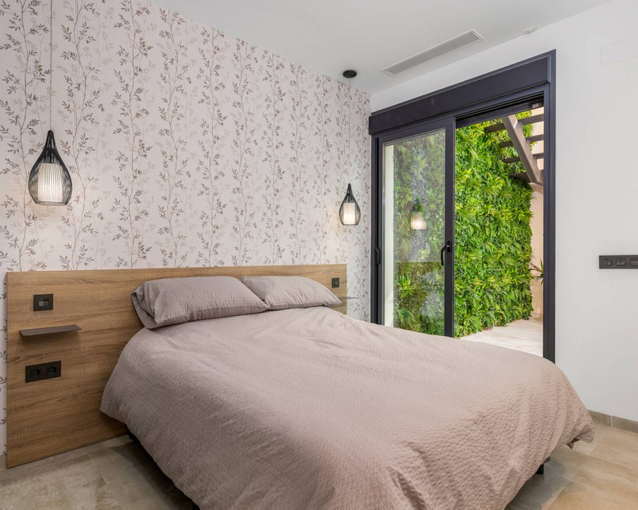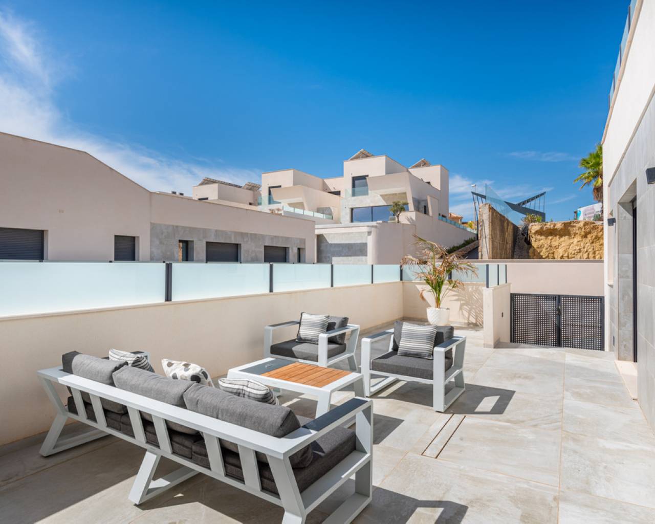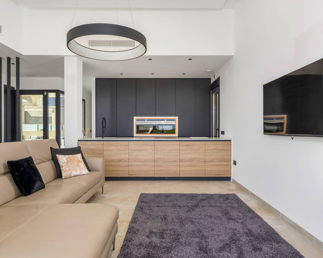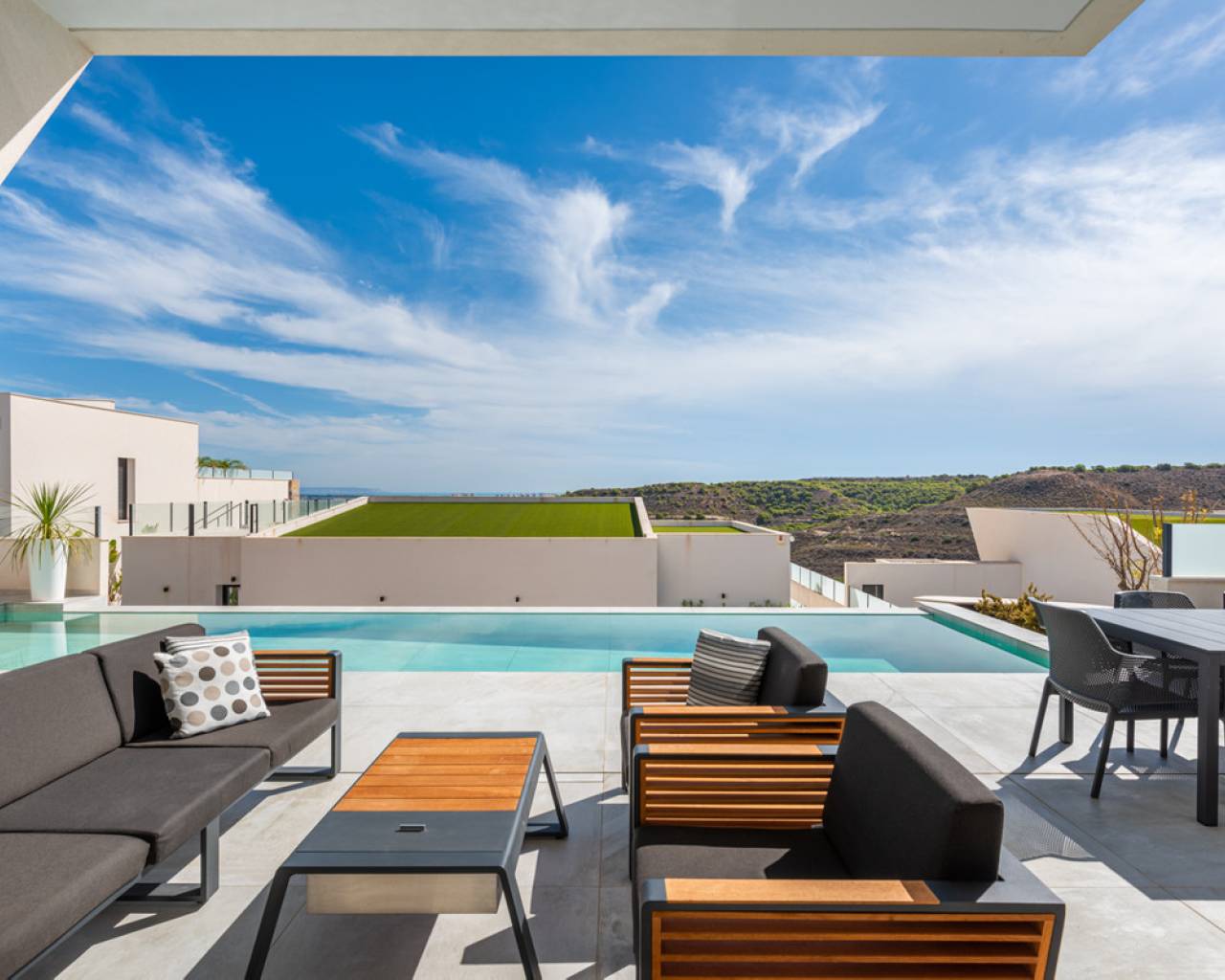 Luxury 5 bedroom / 6 bathroom villa with views in Ciudad Quesada. Beautiful luxury villa with a total living area of 333 m2 divided on two levels. It consists of a total of 5 double bedrooms, all of them with en-suite bathrooms, an additional bathroom and a guest toilet. The main floor consists of two bedrooms with en-suite bathrooms, a guest toilet, and a lovely open plan kitchen, living room and dining room. In the living area you have large sliding doors that opens up completely and gives a great indoor / outdoor living feature. The lower level consists of three bedrooms with en-suite bathrooms, a kitchen and utility room, a large living room, a bathroom, two storage rooms. The rooms in this level have access to a lovely patio. From the living room on this level you have direct access to the garage and techical room. The villa is equipped with central air condition (hot/cold), underfloor heating in the bathrooms, double glazes windows and security door. Outdoor areaThe villa is set on a lovely corner plot of 462 m2. The pool area is east facing, giving you amazing views over the surrounding area and to the sea. Around the pool you have a beautiful tiled area with space for several outdoor seating areas and sun beds. From the pool area you have external stairs leading you to the large roof terrace. Here you have one part that is tiled and the other part with artificial grass, both of them with a lot of space for outdoor entertainment and with amazing views. At the entrance to the house you have another lovely tiled garden area that faces west. This area is perfect to enjoy the afternoon / evening sun. At the lower level you can find a large tiled patio with an artificial vertical garden. This patio can be access from the garden through external stairs, and also from the living room and 2 of the bedrooms in the lower level.