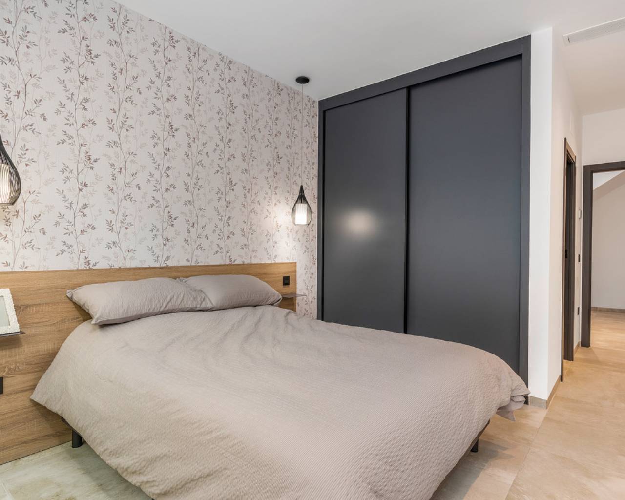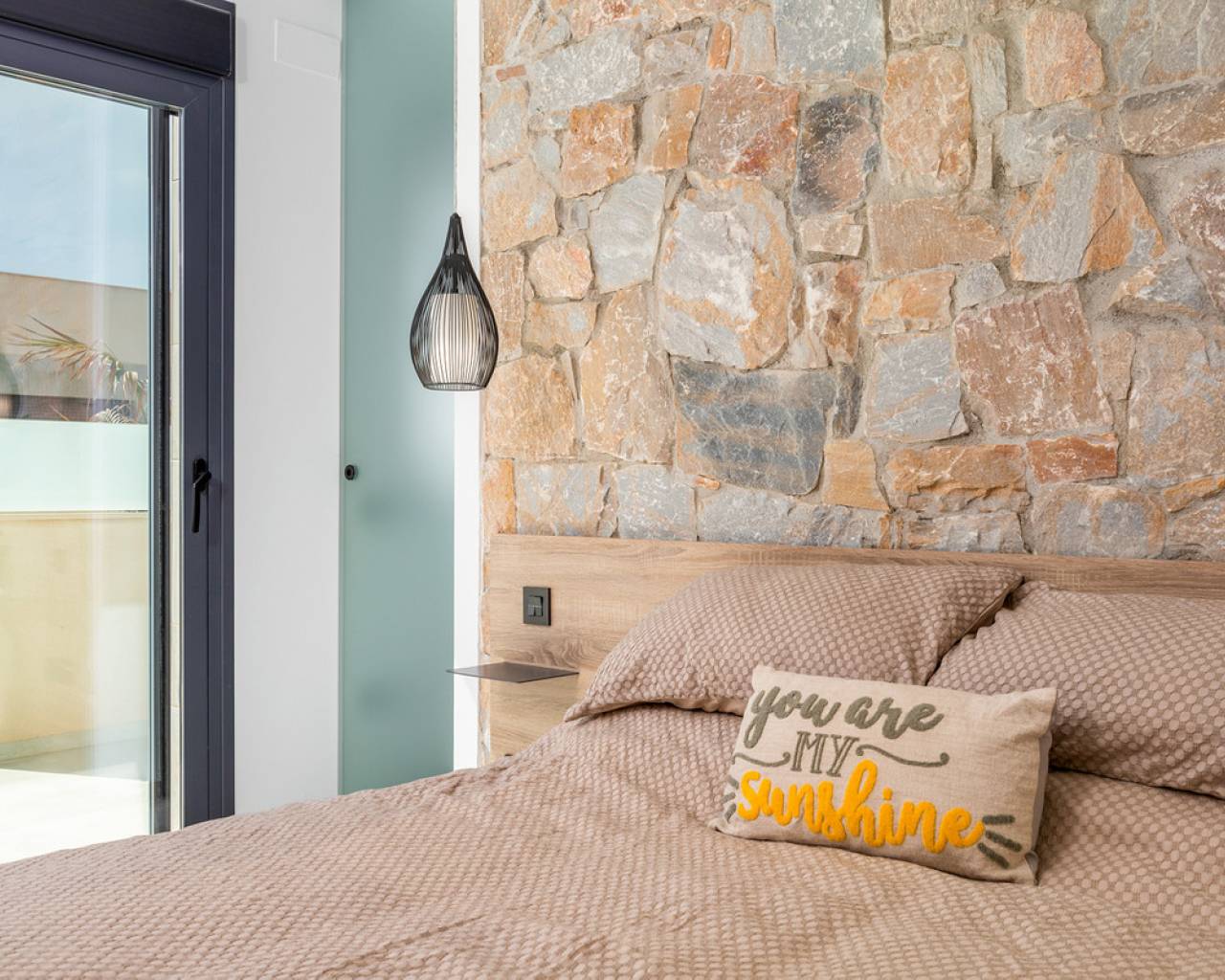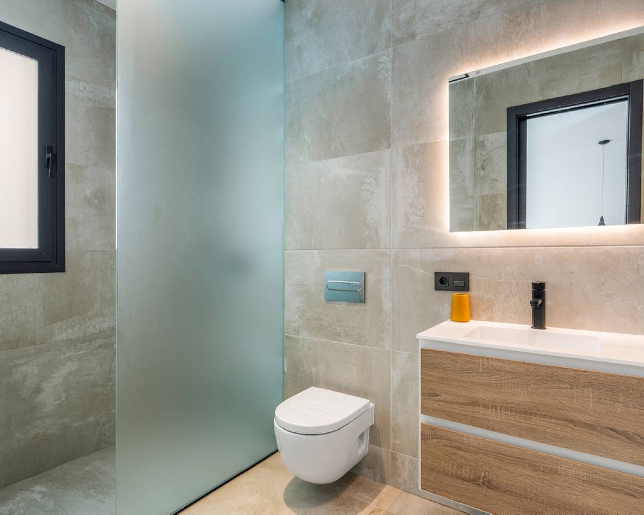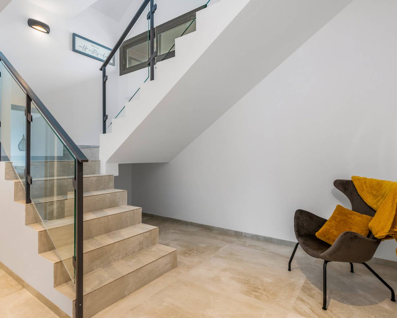 Luxury 5 bedroom / 6 bathroom villa with views in Ciudad Quesada. Beautiful luxury villa with a total living area of 333 m2 divided on two levels. It consists of a total of 5 double bedrooms, all of them with en-suite bathrooms, an additional bathroom and a guest toilet. The main floor consists of two bedrooms with en-suite bathrooms, a guest toilet, and a lovely open plan kitchen, living room and dining room. In the living area you have large sliding doors that opens up completely and gives a great indoor / outdoor living feature. The lower level consists of three bedrooms with en-suite bathrooms, a kitchen and utility room, a large living room, a bathroom, two storage rooms. The rooms in this level have access to a lovely patio. From the living room on this level you have direct access to the garage and techical room. The villa is equipped with central air condition (hot/cold), underfloor heating in the bathrooms, double glazes windows and security door. Outdoor areaThe villa is set on a lovely corner plot of 462 m2. The pool area is east facing, giving you amazing views over the surrounding area and to the sea. Around the pool you have a beautiful tiled area with space for several outdoor seating areas and sun beds. From the pool area you have external stairs leading you to the large roof terrace. Here you have one part that is tiled and the other part with artificial grass, both of them with a lot of space for outdoor entertainment and with amazing views. At the entrance to the house you have another lovely tiled garden area that faces west. This area is perfect to enjoy the afternoon / evening sun. At the lower level you can find a large tiled patio with an artificial vertical garden. This patio can be access from the garden through external stairs, and also from the living room and 2 of the bedrooms in the lower level.