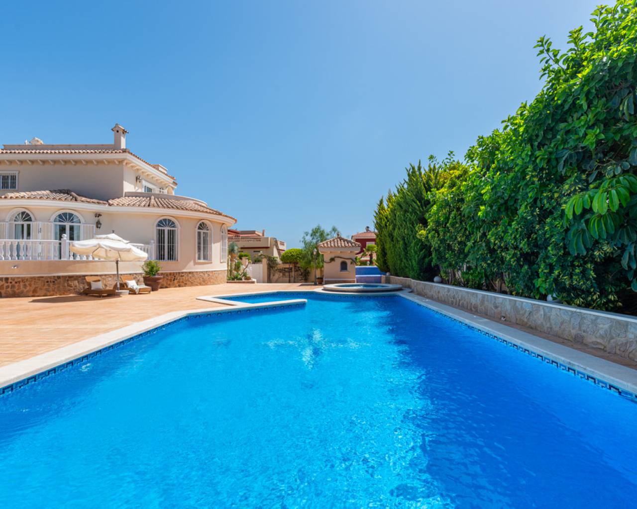 Mediterranean style villa with 4 bedrooms and 5bathrooms, distributed over two levels. On the ground floor you will find a kitchen, living room with a spacious open plan dining area and a hall. It has direct access to a large terrace and gardens from the kitchen or the front door. You will also find a laundry room and two bedrooms, one with an en-suite bathroom and the other with a separate bathroom. On the first floor you will find two en-suite bedrooms, both with fitted wardrobes and a balcony. From both balconies you can access a large solarium with spectacular views. The Villa has extras such as underfloor heating in all bathrooms, anti-limescale system and fireplace. Outdoor area The villa is located on a 1000 m2 plot with complete privacy. In the beautiful garden you can find a huge pool with integrated heated Jacuzzi next to a tall vertical garden to guarantee total privacy. Outside you will also find a bathroom with shower and a fully equipped outdoor kitchen. There is a porch to park two cars on the plot that can be accessed by an electric gate. Surroundings The villa is located in the exclusive area of Ciudad Quesada, on a high point that provides impressive views. You will find bars, restaurants and grocery stores very close. You will also find the popular La Marquesa golf course and the beautiful beaches of Guardamar just a few minutes' drive away.