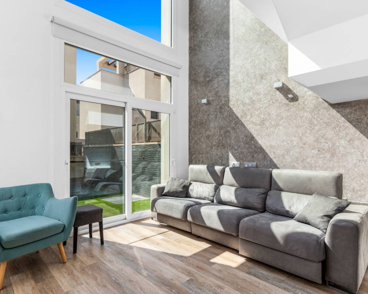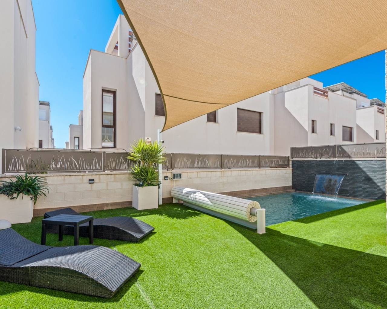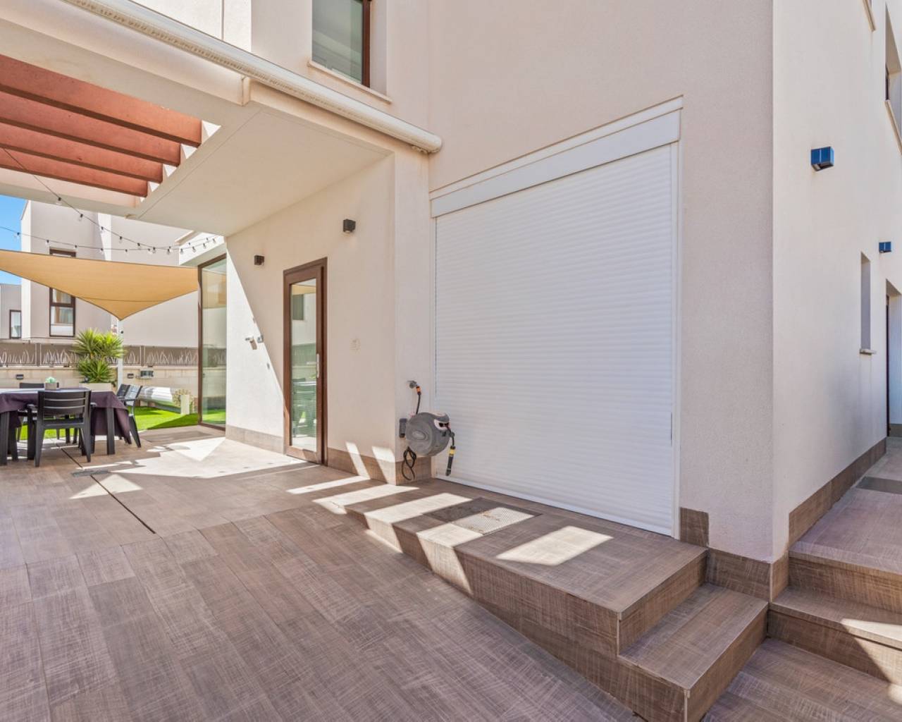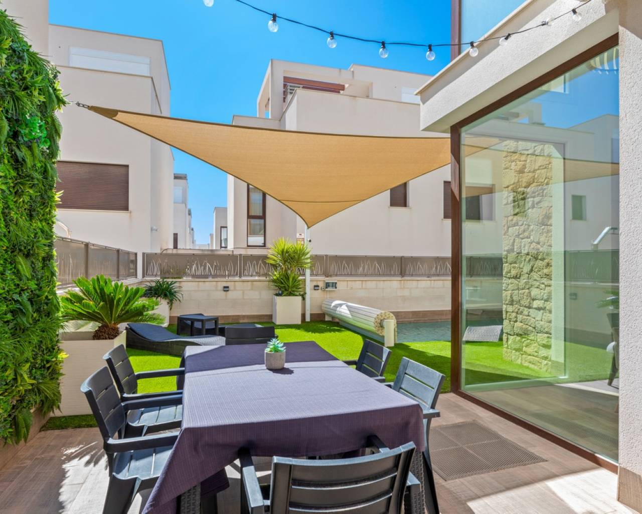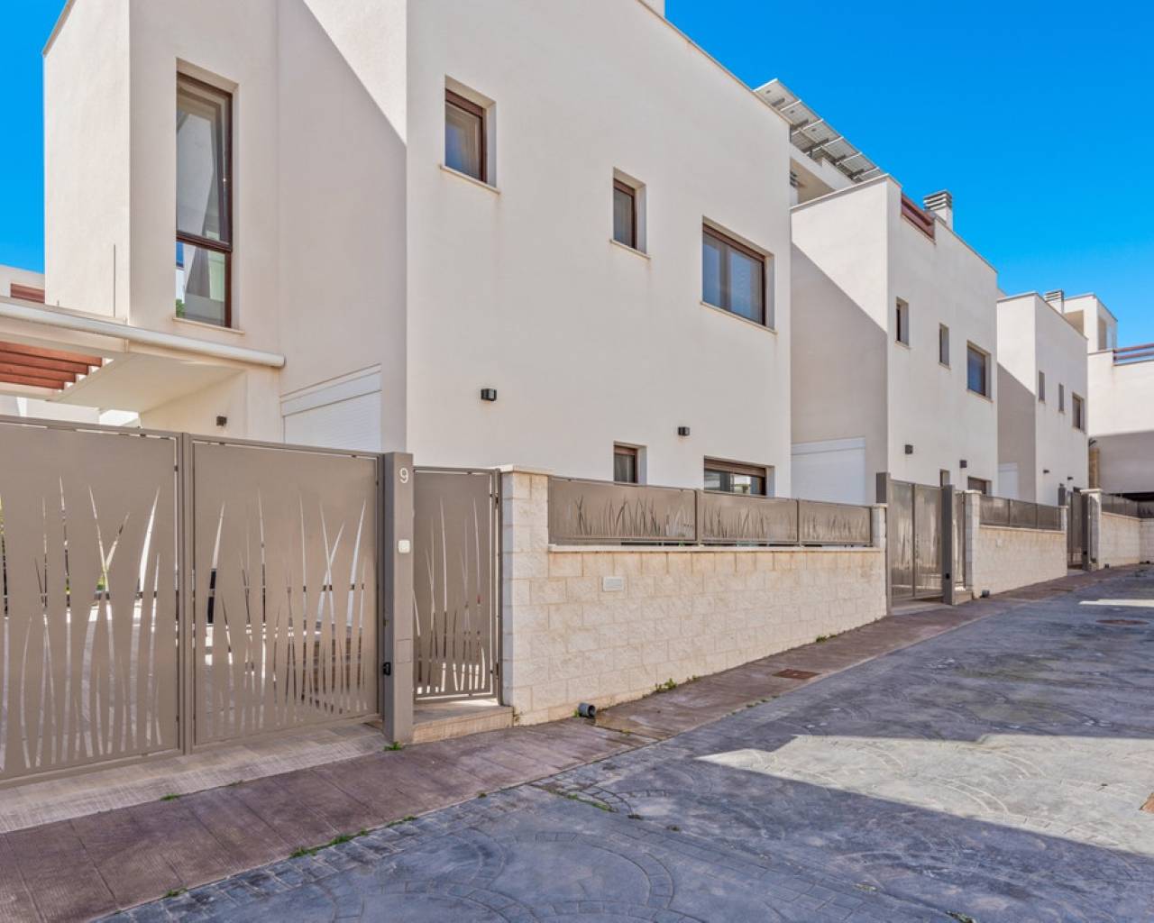 Located in a residential complex of 50 independent homes, this property offers a functional layout and comfortable living spaces. Built in 2018, it has a total area of 101 m² on a 182 m² plot, with three bedrooms and three bathrooms. The ground floor includes a living room with an integrated kitchen, a full bathroom, a bedroom, and a laundry area equipped with an 8 kg washer and dryer. The first floor features two additional bedrooms, one with an en-suite bathroom and access to a private terrace. The upper floor has a solarium with space for an outdoor kitchen and a jacuzzi installation. The outdoor area includes a private saltwater pool with an automatic cover, an artificial grass garden, and a designated parking space within the plot. The home is equipped with an aerothermal heating and cooling system, two automatic awnings, and a solar sail for shade. Additional features include built-in kitchen appliances, a Bosch Wi-Fi super-automatic coffee machine, automatic blinds, mosquito screens on windows and doors, glass shower enclosures, an interior and exterior security system, and a safe. The property is located in a quiet area with good access to nearby urban centers. For more information or to schedule a visit, please contact us.