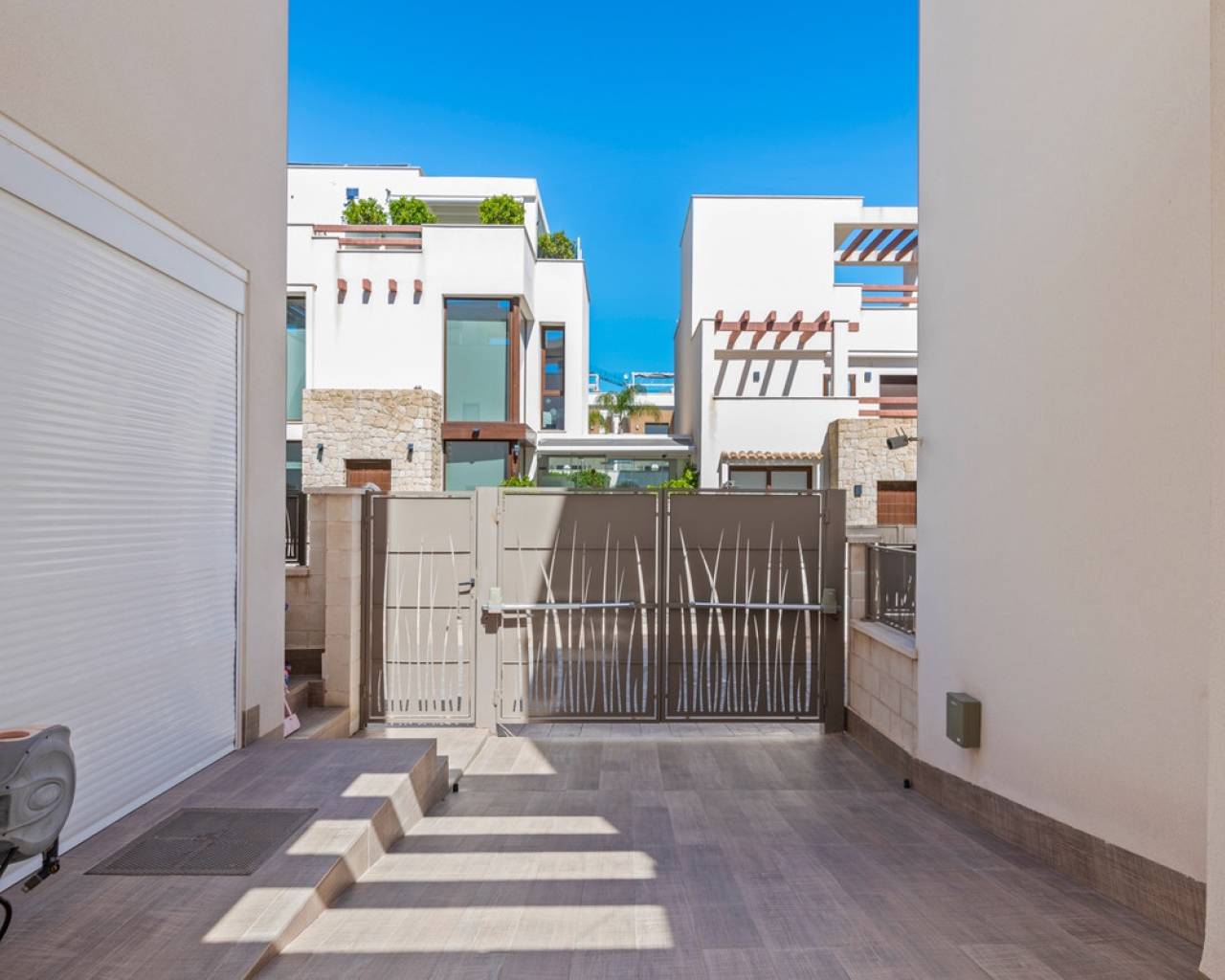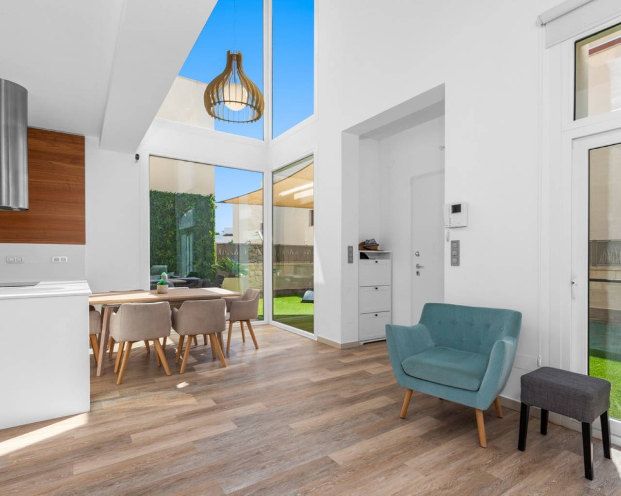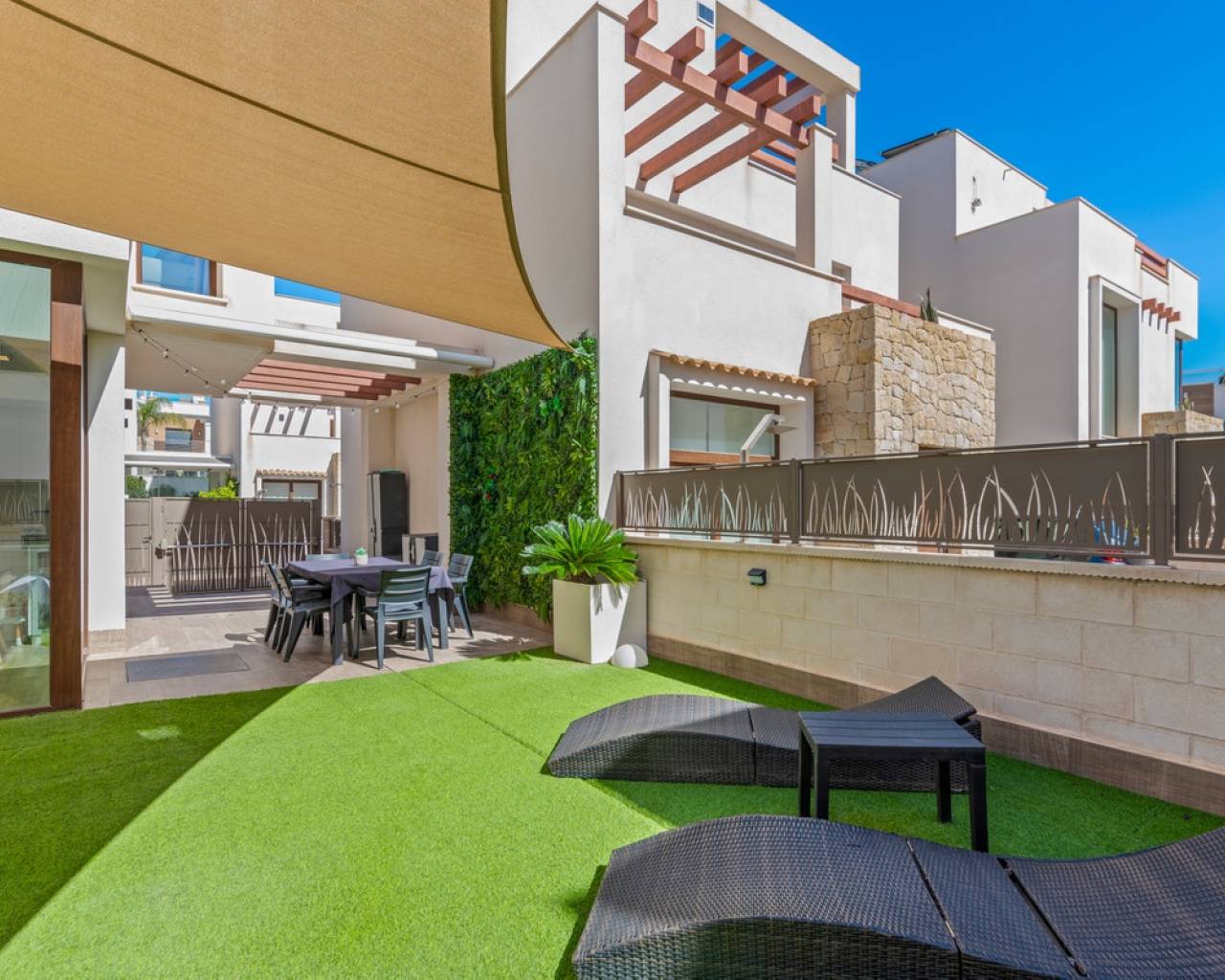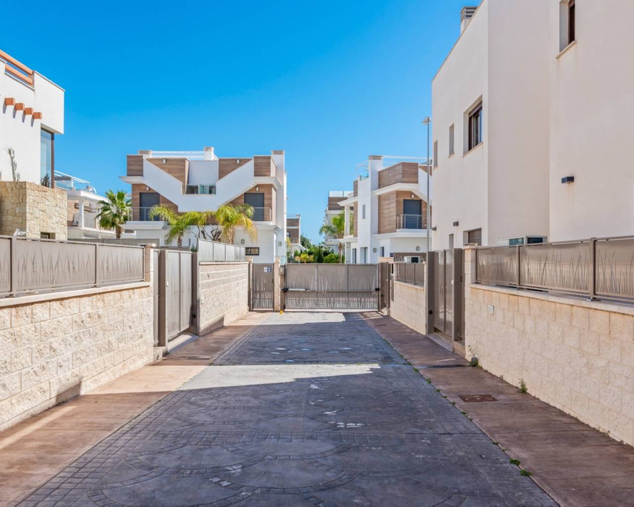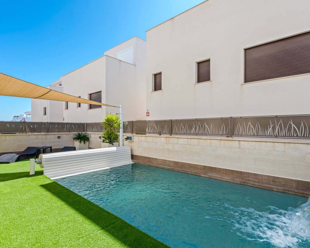 Located in a residential complex of 50 independent homes, this property offers a functional layout and comfortable living spaces. Built in 2018, it has a total area of 101 m² on a 182 m² plot, with three bedrooms and three bathrooms. The ground floor includes a living room with an integrated kitchen, a full bathroom, a bedroom, and a laundry area equipped with an 8 kg washer and dryer. The first floor features two additional bedrooms, one with an en-suite bathroom and access to a private terrace. The upper floor has a solarium with space for an outdoor kitchen and a jacuzzi installation. The outdoor area includes a private saltwater pool with an automatic cover, an artificial grass garden, and a designated parking space within the plot. The home is equipped with an aerothermal heating and cooling system, two automatic awnings, and a solar sail for shade. Additional features include built-in kitchen appliances, a Bosch Wi-Fi super-automatic coffee machine, automatic blinds, mosquito screens on windows and doors, glass shower enclosures, an interior and exterior security system, and a safe. The property is located in a quiet area with good access to nearby urban centers. For more information or to schedule a visit, please contact us.