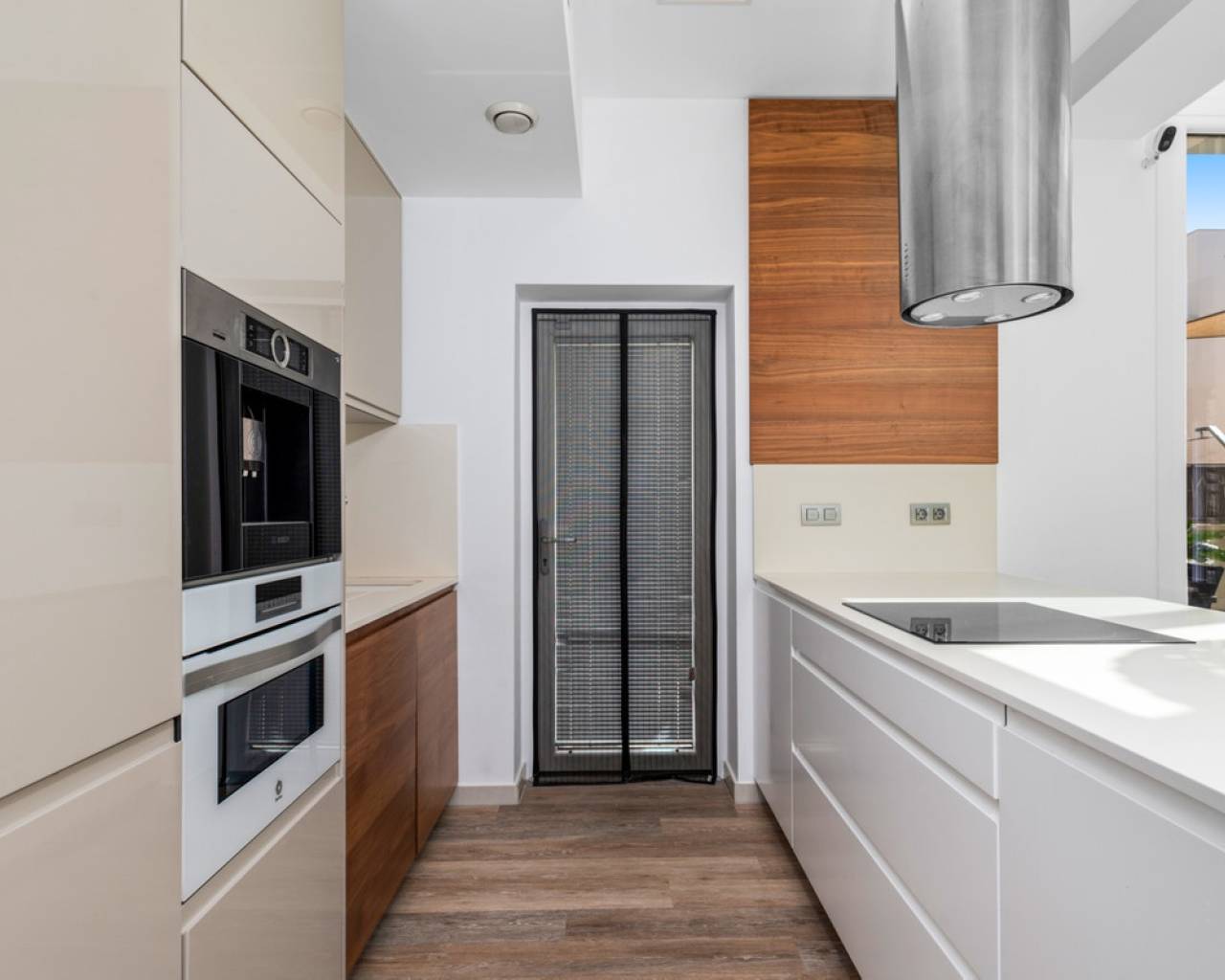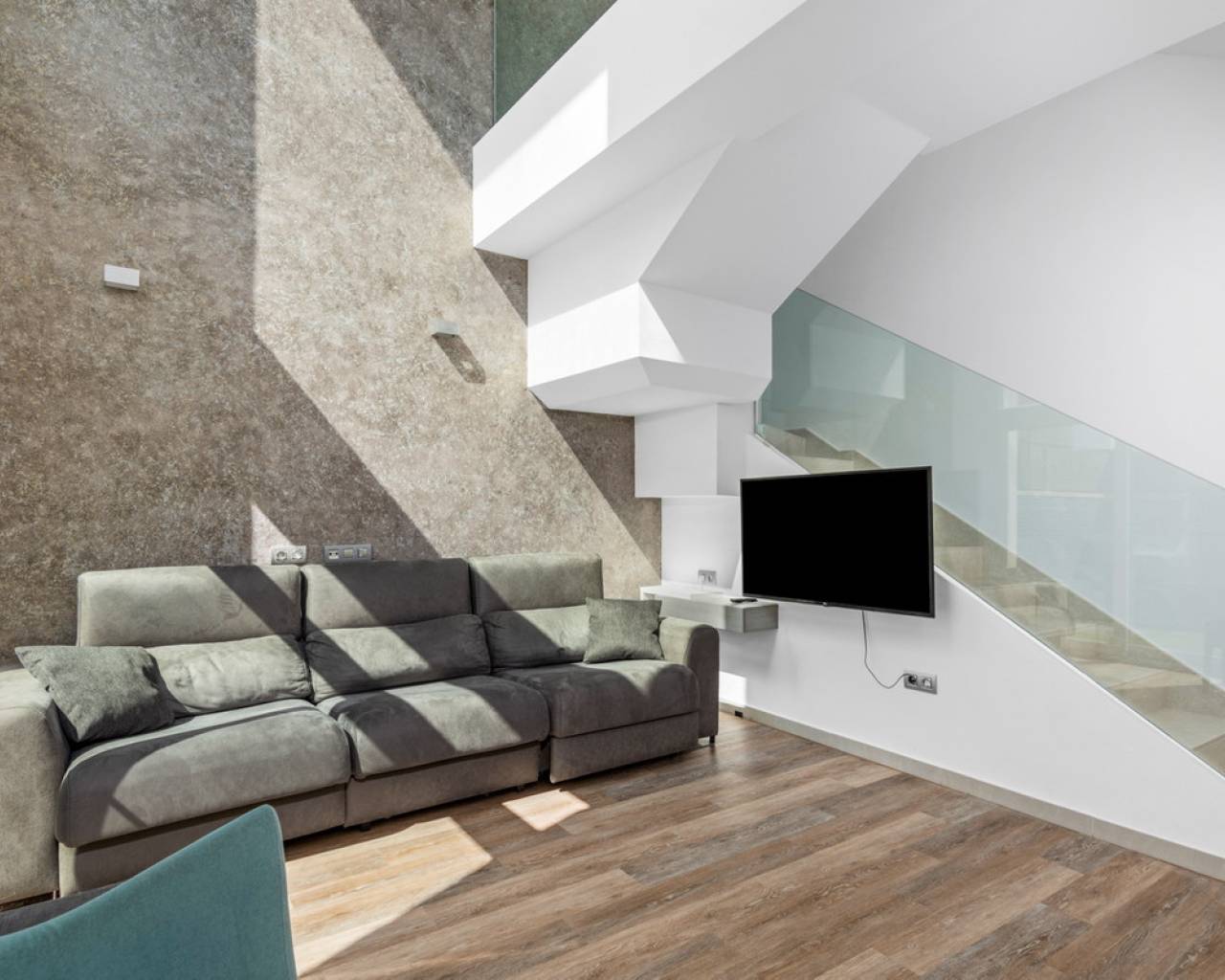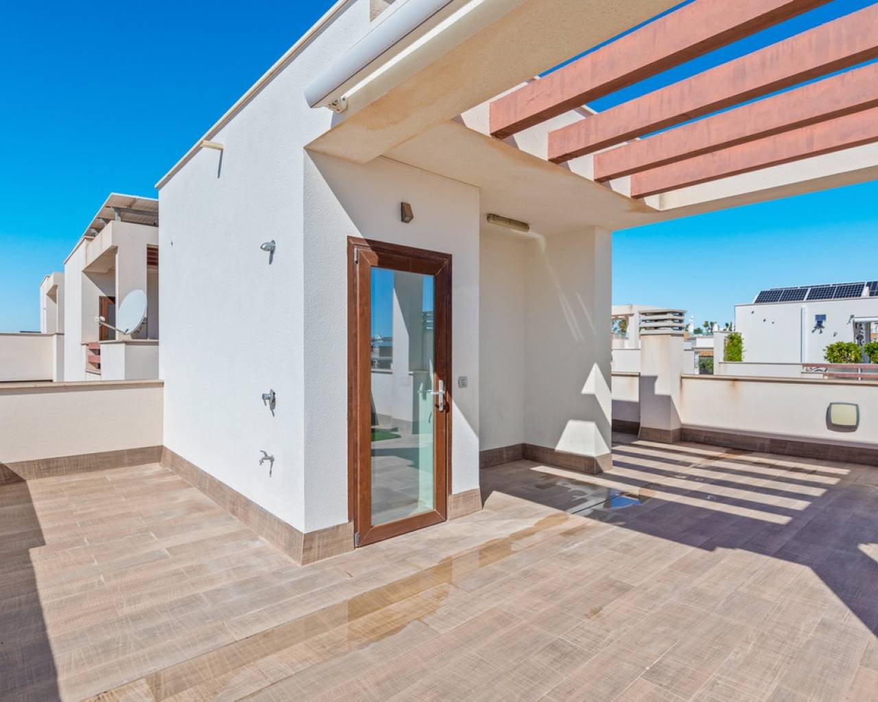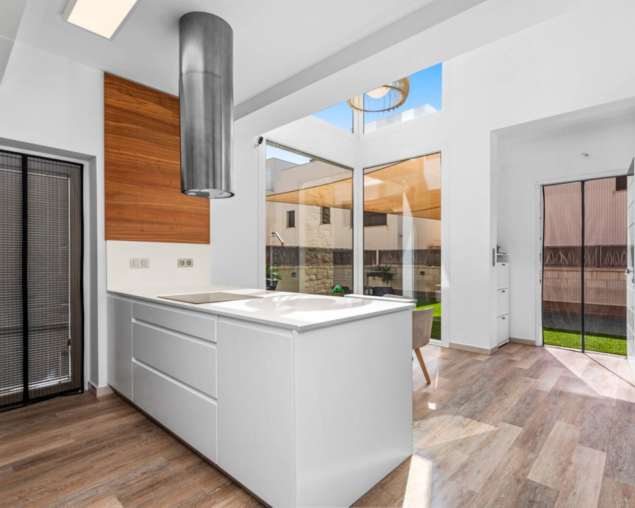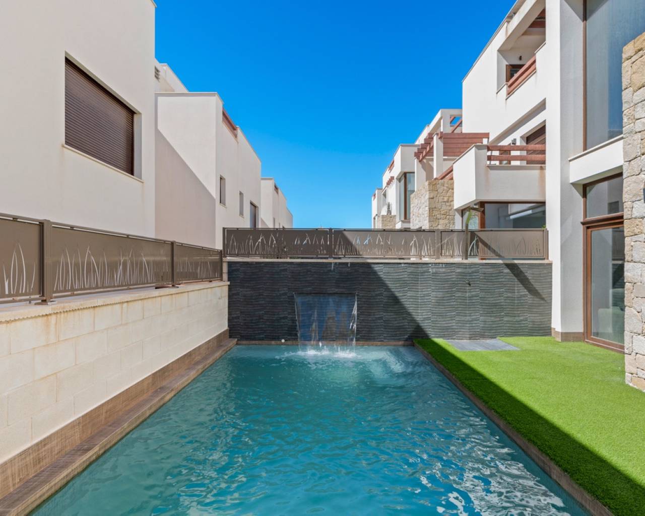 Located in a residential complex of 50 independent homes, this property offers a functional layout and comfortable living spaces. Built in 2018, it has a total area of 101 m² on a 182 m² plot, with three bedrooms and three bathrooms. The ground floor includes a living room with an integrated kitchen, a full bathroom, a bedroom, and a laundry area equipped with an 8 kg washer and dryer. The first floor features two additional bedrooms, one with an en-suite bathroom and access to a private terrace. The upper floor has a solarium with space for an outdoor kitchen and a jacuzzi installation. The outdoor area includes a private saltwater pool with an automatic cover, an artificial grass garden, and a designated parking space within the plot. The home is equipped with an aerothermal heating and cooling system, two automatic awnings, and a solar sail for shade. Additional features include built-in kitchen appliances, a Bosch Wi-Fi super-automatic coffee machine, automatic blinds, mosquito screens on windows and doors, glass shower enclosures, an interior and exterior security system, and a safe. The property is located in a quiet area with good access to nearby urban centers. For more information or to schedule a visit, please contact us.