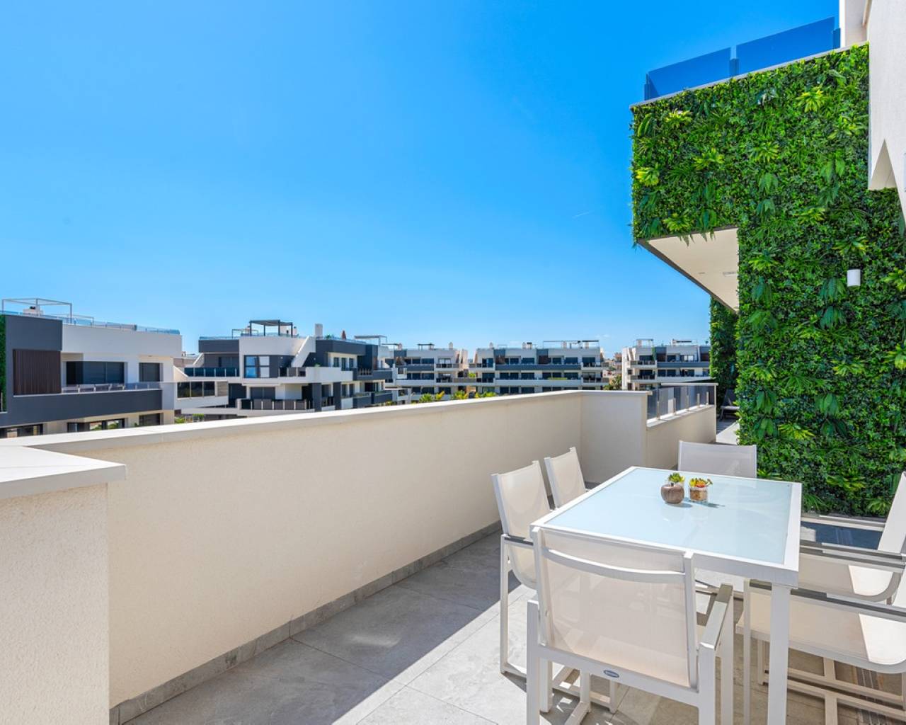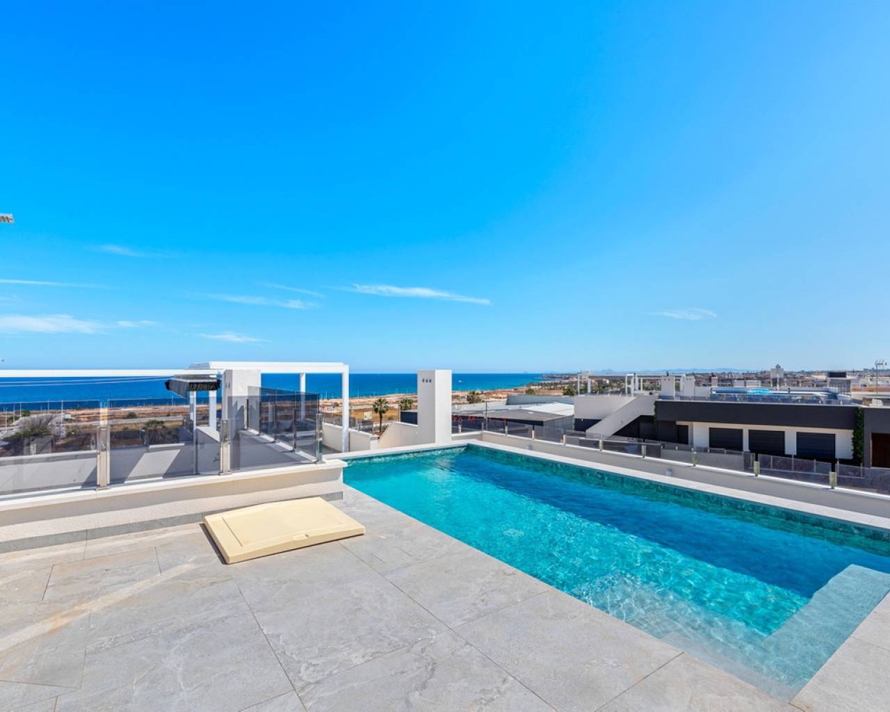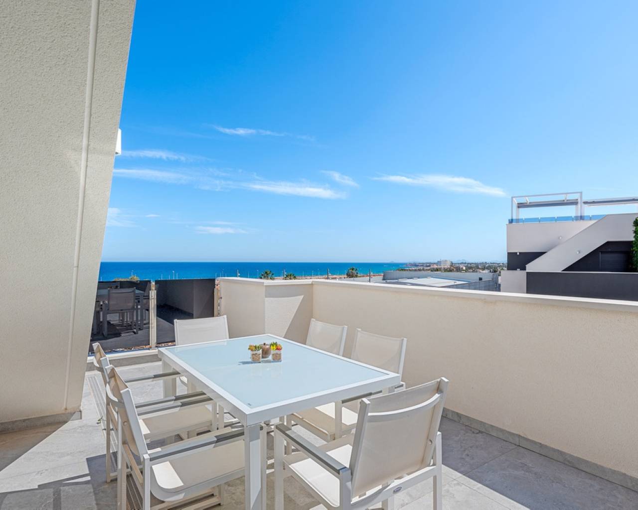 Located in the exclusive Amanecer Deluxe residential complex, this two-storey apartment offers an excellent combination of location, comfort and sea views. Situated in Orihuela Costa, just steps from the Mediterranean and close to all essential services, it is ideal as a permanent residence or holiday investment. The property features three bedrooms, two bathrooms (one en suite), an independent kitchen, and a spacious living-dining area. All rooms, including the kitchen, have direct access to a continuous balcony with sea views and space to sit and enjoy the outdoors. It is sold fully furnished and equipped with high-quality materials: PVC windows with electric shutters, underfloor heating in bathrooms, and modern finishes. On the upper floor, you'll find a private solarium with a swimming pool, perfect for relaxing in complete privacy. The apartment also includes a large, enclosed parking space within the complex. The residential offers communal green areas, a swimming pool and a children's playground, all in a quiet and well-maintained setting.