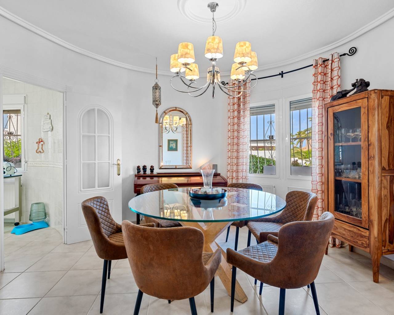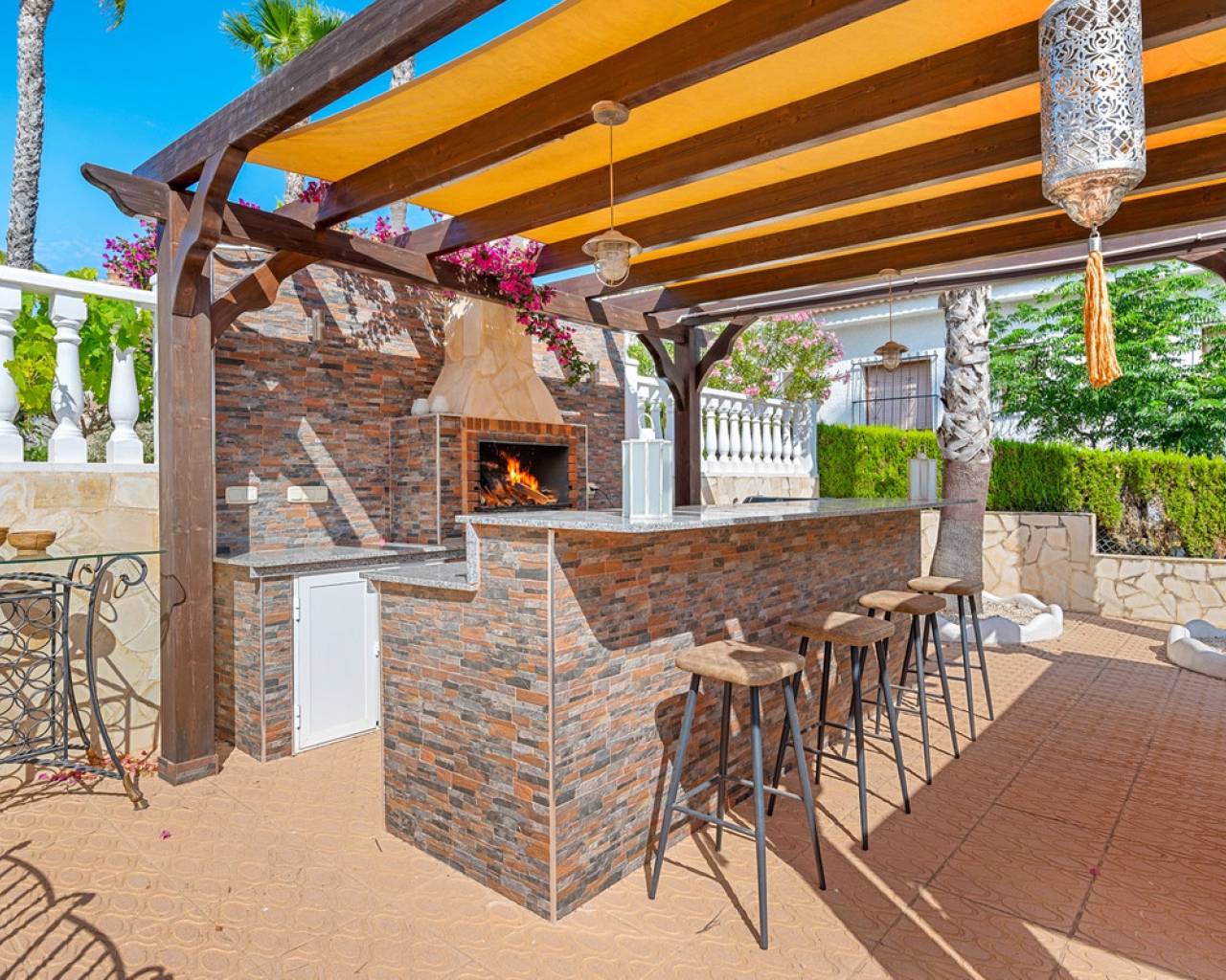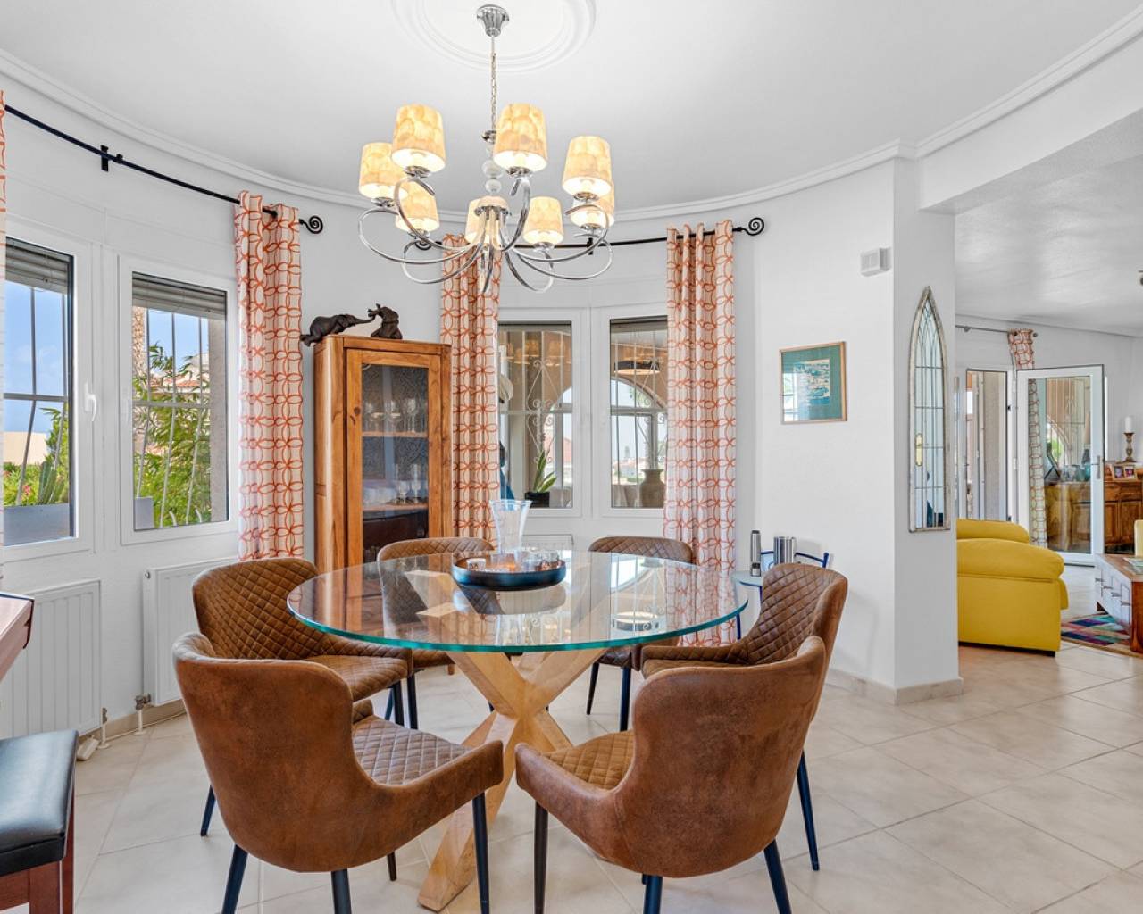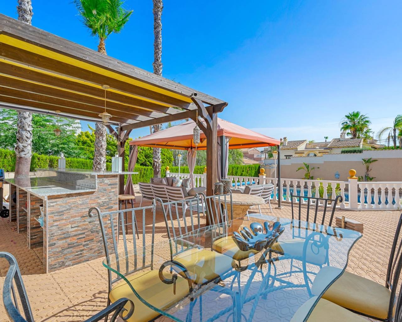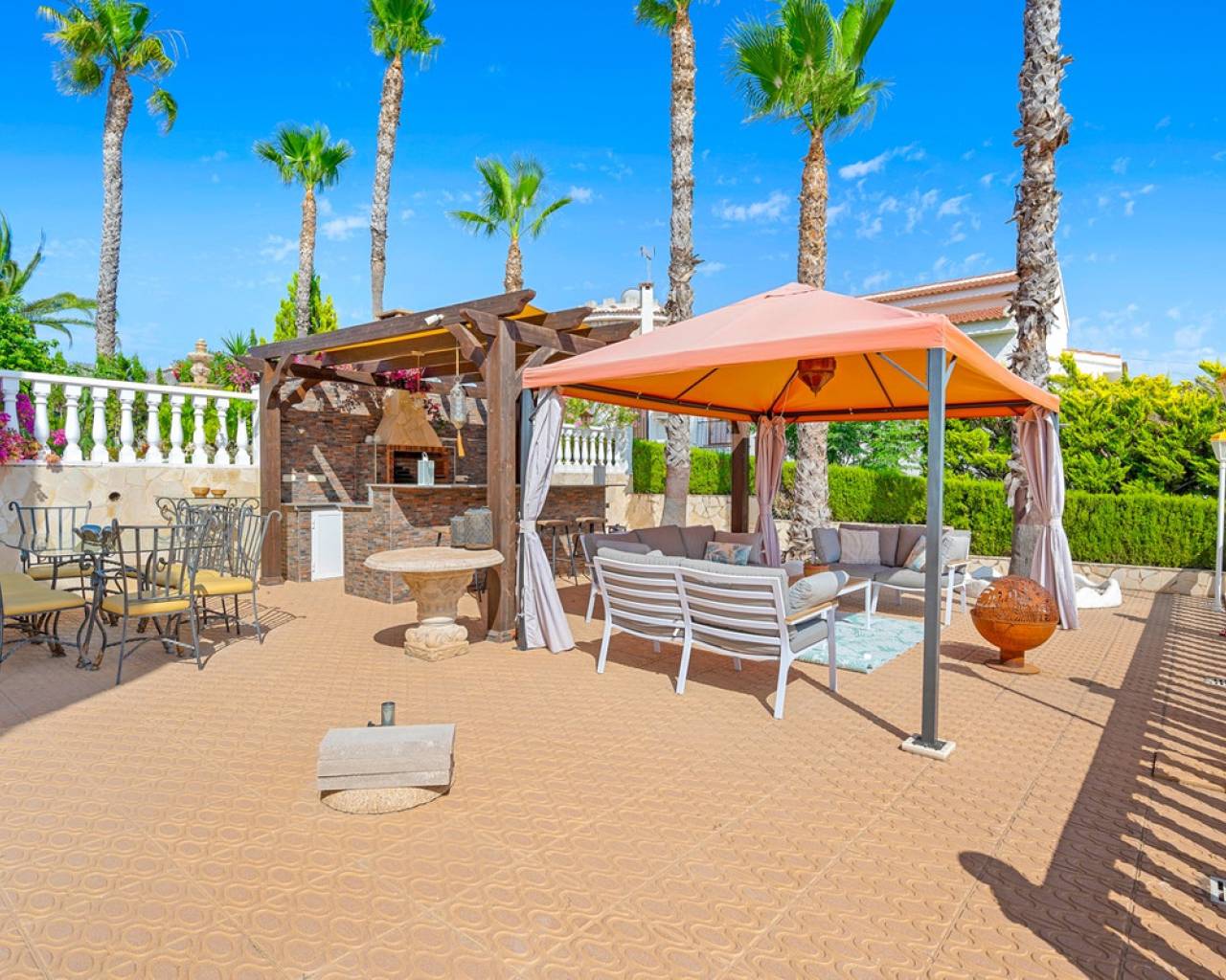 Detached house built in 2001, with a total built area of 239 m² on a 1,152 m² plot, located in a quiet area surrounded by green zones. It is a spacious, bright, and well-maintained property, with south-facing outdoor areas ideal for year-round enjoyment of the Mediterranean climate. The main entrance is through the northwest-facing façade. On the main floor, there is a large curved living-dining room with a fireplace, a fully equipped independent kitchen, three bedrooms with built-in wardrobes, and two bathrooms. Upstairs, the tower room is currently used as an office and provides access to a rooftop terrace with open views of the Torrevieja Salt Lakes. An additional guest room with en-suite bathroom and independent access from the garden offers extra privacy—ideal for visitors or as a separate studio. The outdoor area is carefully landscaped, featuring mature gardens with fruit trees such as lemon trees, various palm trees, a decorative fountain, and multiple seating areas. The private pool area, oriented to the south, includes a built-in shower, jacuzzi, pergola, and a fully equipped outdoor kitchen with barbecue. An enclosed terrace acts as a winter dining or lounge space. There is also an independent building in the garden currently used as a laundry room and gym, with a surface area of 53.55 m², equipped with solar panels on the roof to increase energy efficiency. The private pool measures 35.87 m² and is complemented by well-designed leisure facilities. The property includes a 32 m² covered garage with an electric car charging station, a carport, and ample space on the plot for additional parking. The annual property tax (IBI/SUMA) is just €760.97. A versatile and complete home, ready to move into, combining privacy, functionality, and excellent outdoor living.