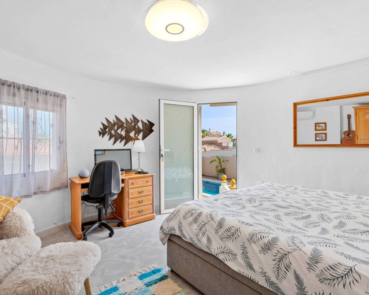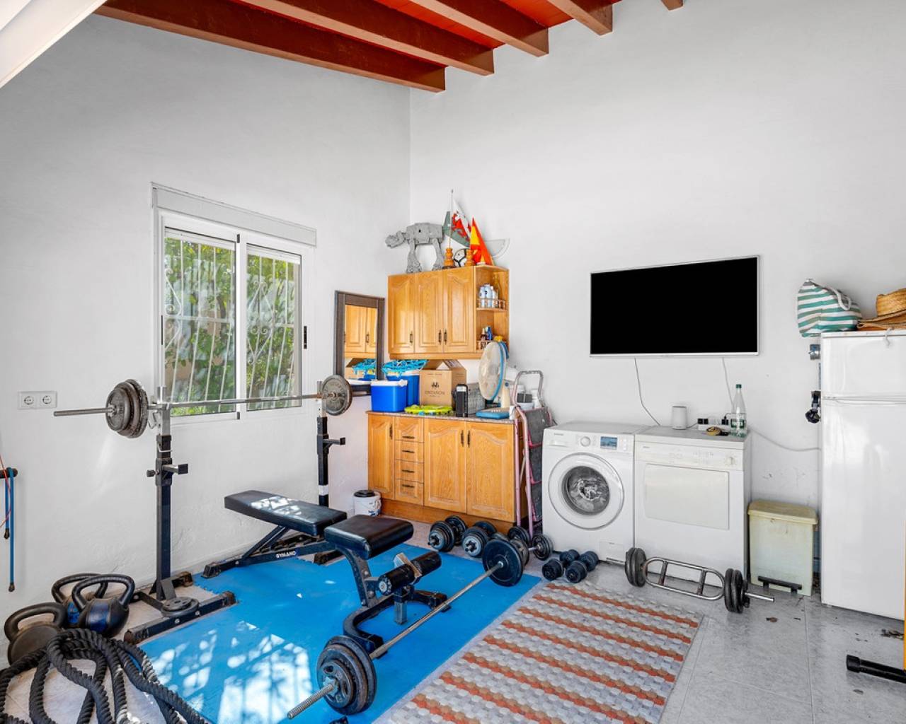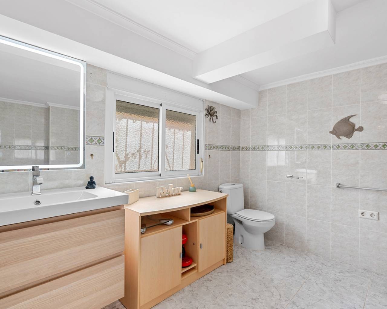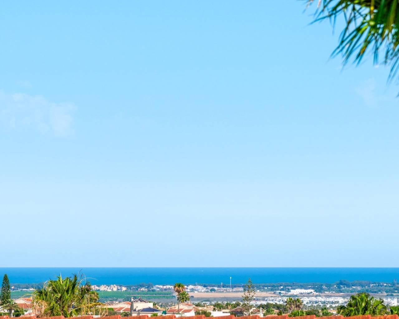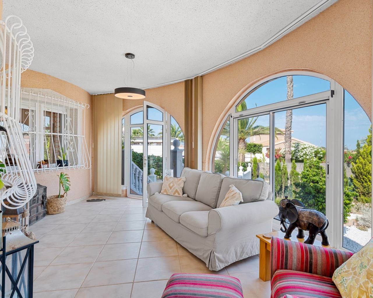 Detached house built in 2001, with a total built area of 239 m² on a 1,152 m² plot, located in a quiet area surrounded by green zones. It is a spacious, bright, and well-maintained property, with south-facing outdoor areas ideal for year-round enjoyment of the Mediterranean climate. The main entrance is through the northwest-facing façade. On the main floor, there is a large curved living-dining room with a fireplace, a fully equipped independent kitchen, three bedrooms with built-in wardrobes, and two bathrooms. Upstairs, the tower room is currently used as an office and provides access to a rooftop terrace with open views of the Torrevieja Salt Lakes. An additional guest room with en-suite bathroom and independent access from the garden offers extra privacy—ideal for visitors or as a separate studio. The outdoor area is carefully landscaped, featuring mature gardens with fruit trees such as lemon trees, various palm trees, a decorative fountain, and multiple seating areas. The private pool area, oriented to the south, includes a built-in shower, jacuzzi, pergola, and a fully equipped outdoor kitchen with barbecue. An enclosed terrace acts as a winter dining or lounge space. There is also an independent building in the garden currently used as a laundry room and gym, with a surface area of 53.55 m², equipped with solar panels on the roof to increase energy efficiency. The private pool measures 35.87 m² and is complemented by well-designed leisure facilities. The property includes a 32 m² covered garage with an electric car charging station, a carport, and ample space on the plot for additional parking. The annual property tax (IBI/SUMA) is just €760.97. A versatile and complete home, ready to move into, combining privacy, functionality, and excellent outdoor living.
