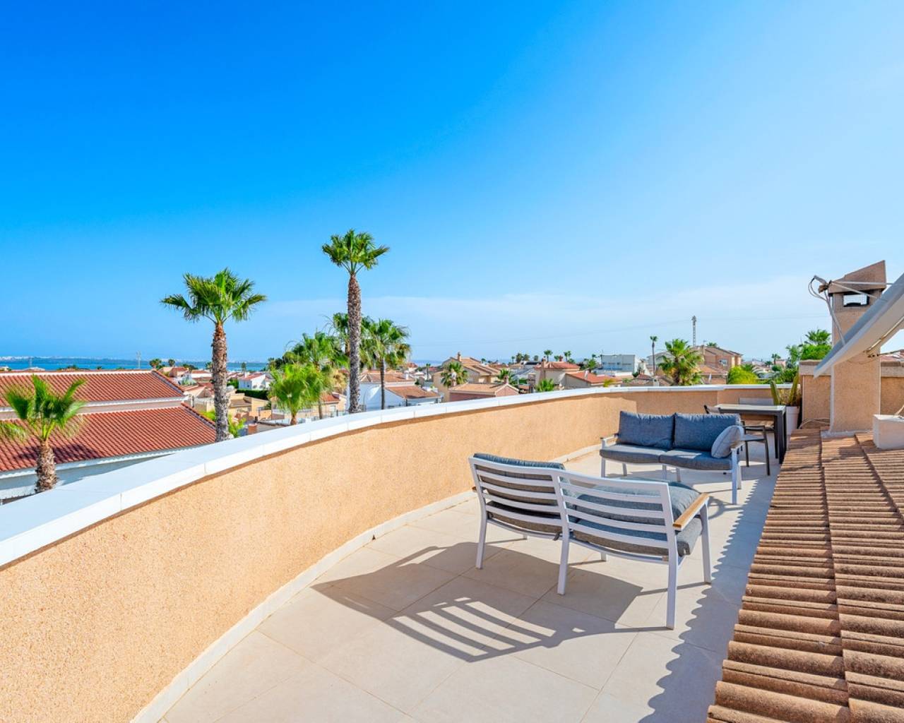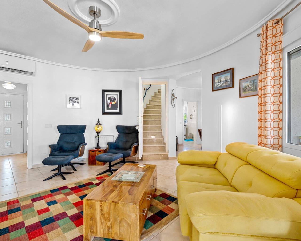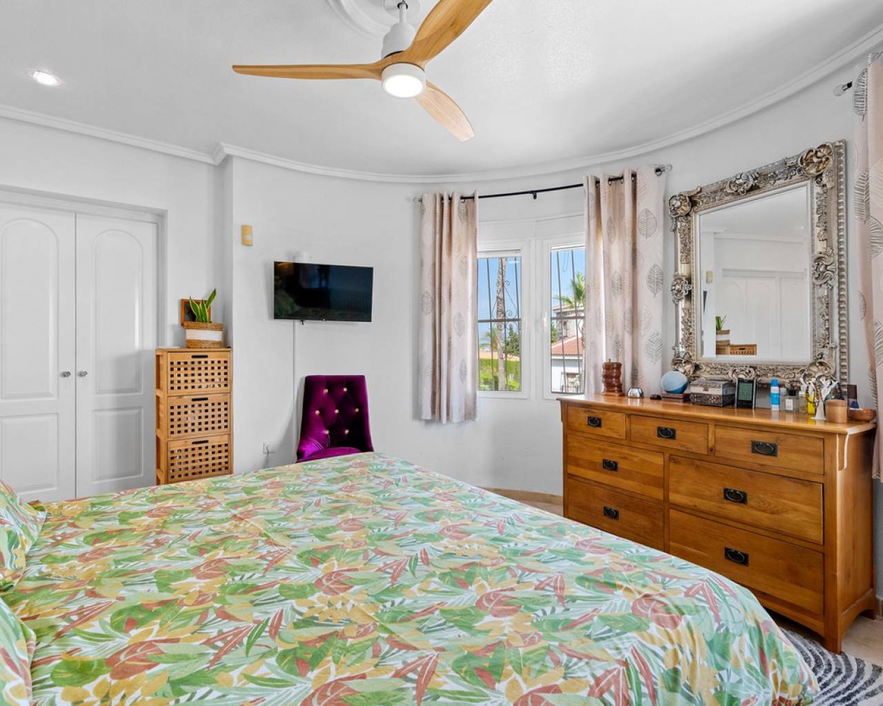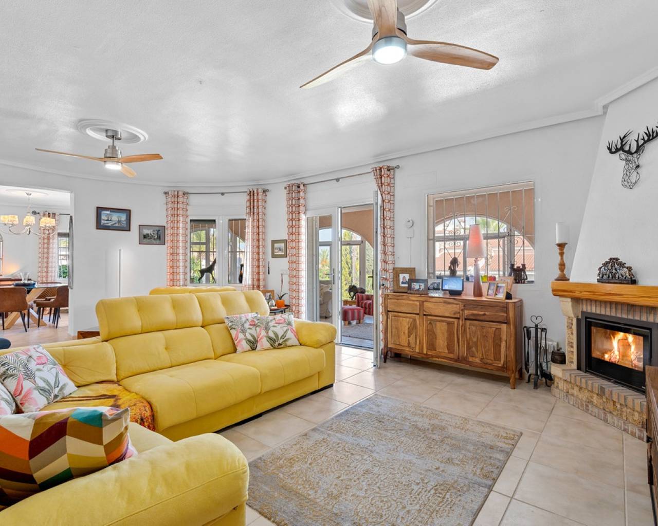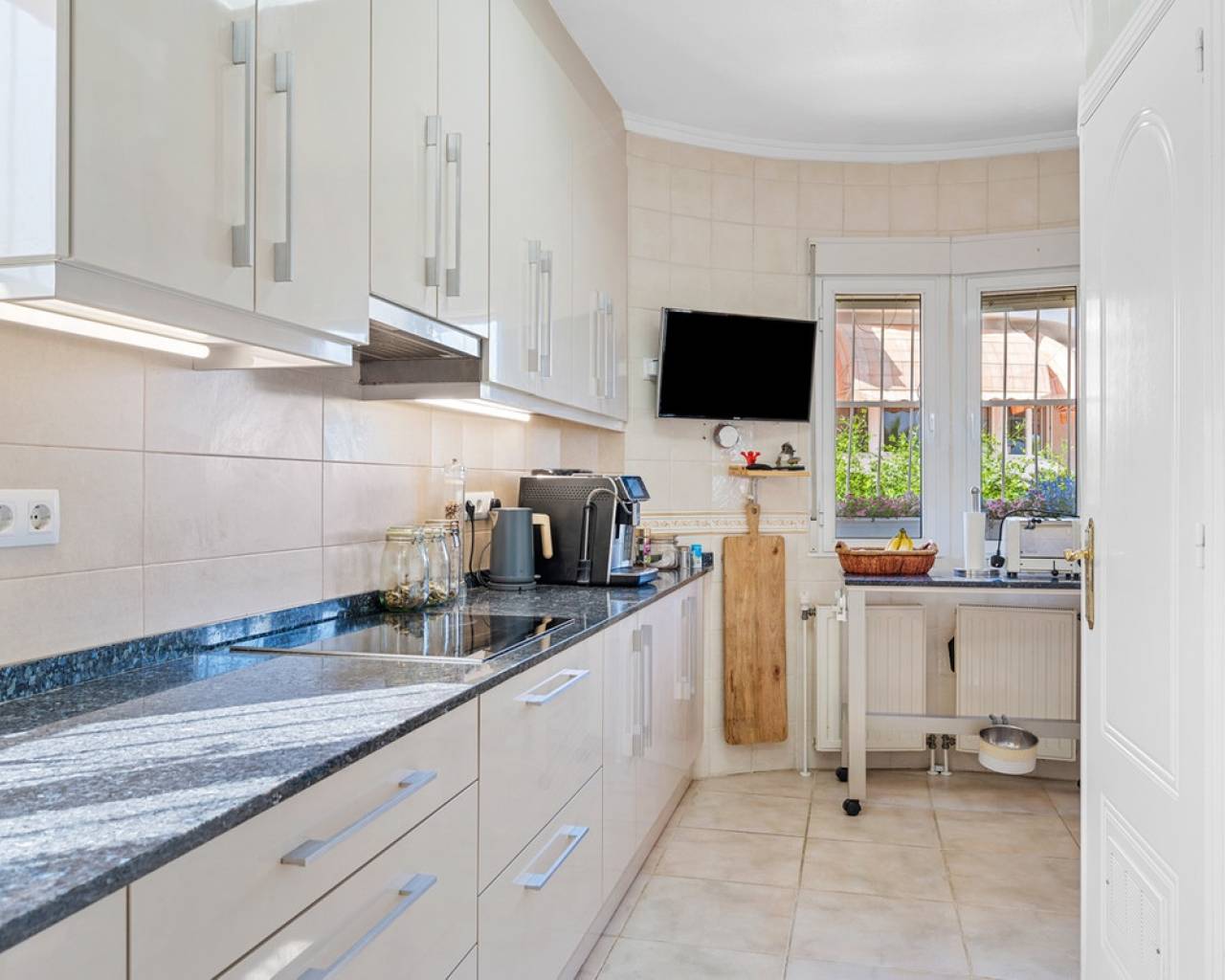 Detached house built in 2001, with a total built area of 239 m² on a 1,152 m² plot, located in a quiet area surrounded by green zones. It is a spacious, bright, and well-maintained property, with south-facing outdoor areas ideal for year-round enjoyment of the Mediterranean climate. The main entrance is through the northwest-facing façade. On the main floor, there is a large curved living-dining room with a fireplace, a fully equipped independent kitchen, three bedrooms with built-in wardrobes, and two bathrooms. Upstairs, the tower room is currently used as an office and provides access to a rooftop terrace with open views of the Torrevieja Salt Lakes. An additional guest room with en-suite bathroom and independent access from the garden offers extra privacy—ideal for visitors or as a separate studio. The outdoor area is carefully landscaped, featuring mature gardens with fruit trees such as lemon trees, various palm trees, a decorative fountain, and multiple seating areas. The private pool area, oriented to the south, includes a built-in shower, jacuzzi, pergola, and a fully equipped outdoor kitchen with barbecue. An enclosed terrace acts as a winter dining or lounge space. There is also an independent building in the garden currently used as a laundry room and gym, with a surface area of 53.55 m², equipped with solar panels on the roof to increase energy efficiency. The private pool measures 35.87 m² and is complemented by well-designed leisure facilities. The property includes a 32 m² covered garage with an electric car charging station, a carport, and ample space on the plot for additional parking. The annual property tax (IBI/SUMA) is just €760.97. A versatile and complete home, ready to move into, combining privacy, functionality, and excellent outdoor living.
