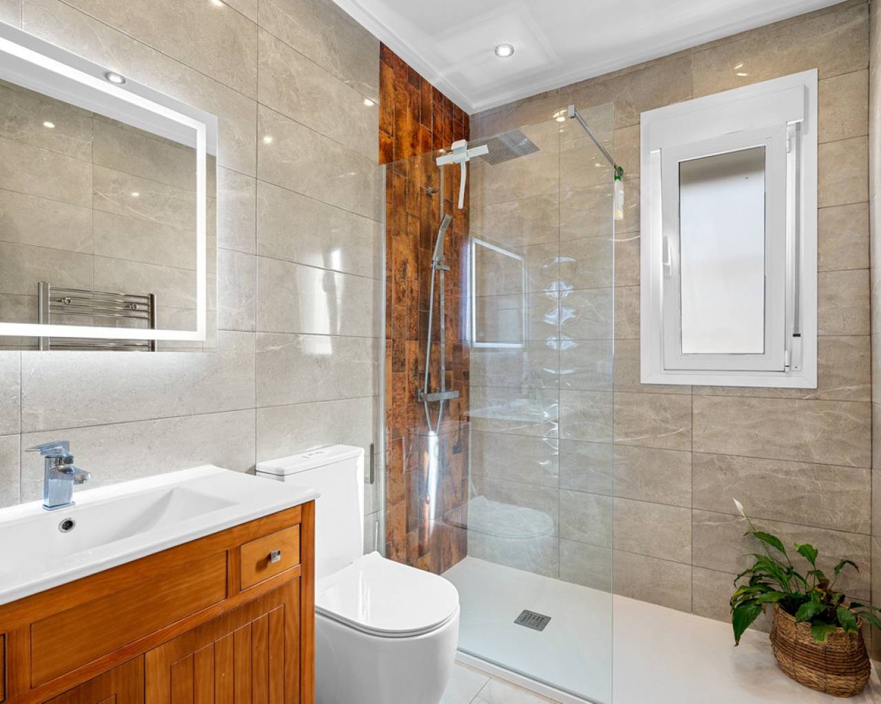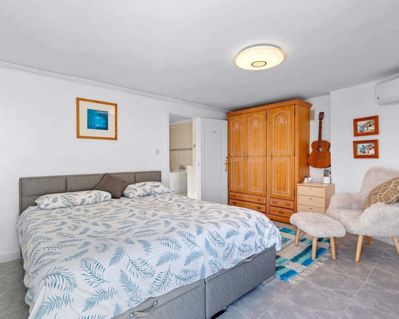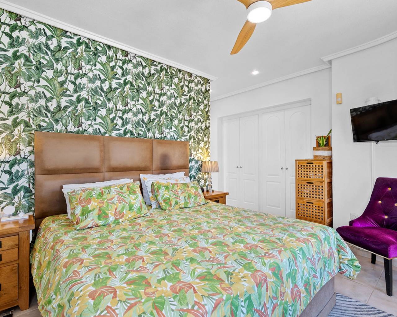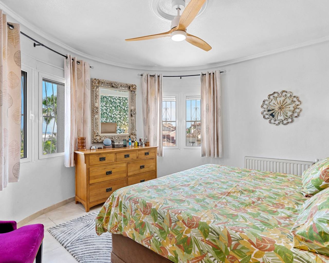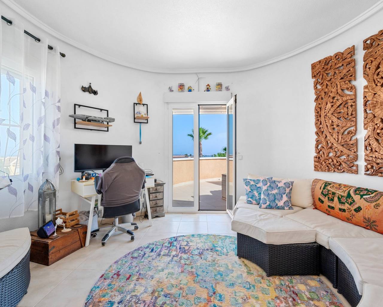 Detached house built in 2001, with a total built area of 239 m² on a 1,152 m² plot, located in a quiet area surrounded by green zones. It is a spacious, bright, and well-maintained property, with south-facing outdoor areas ideal for year-round enjoyment of the Mediterranean climate. The main entrance is through the northwest-facing façade. On the main floor, there is a large curved living-dining room with a fireplace, a fully equipped independent kitchen, three bedrooms with built-in wardrobes, and two bathrooms. Upstairs, the tower room is currently used as an office and provides access to a rooftop terrace with open views of the Torrevieja Salt Lakes. An additional guest room with en-suite bathroom and independent access from the garden offers extra privacy—ideal for visitors or as a separate studio. The outdoor area is carefully landscaped, featuring mature gardens with fruit trees such as lemon trees, various palm trees, a decorative fountain, and multiple seating areas. The private pool area, oriented to the south, includes a built-in shower, jacuzzi, pergola, and a fully equipped outdoor kitchen with barbecue. An enclosed terrace acts as a winter dining or lounge space. There is also an independent building in the garden currently used as a laundry room and gym, with a surface area of 53.55 m², equipped with solar panels on the roof to increase energy efficiency. The private pool measures 35.87 m² and is complemented by well-designed leisure facilities. The property includes a 32 m² covered garage with an electric car charging station, a carport, and ample space on the plot for additional parking. The annual property tax (IBI/SUMA) is just €760.97. A versatile and complete home, ready to move into, combining privacy, functionality, and excellent outdoor living.