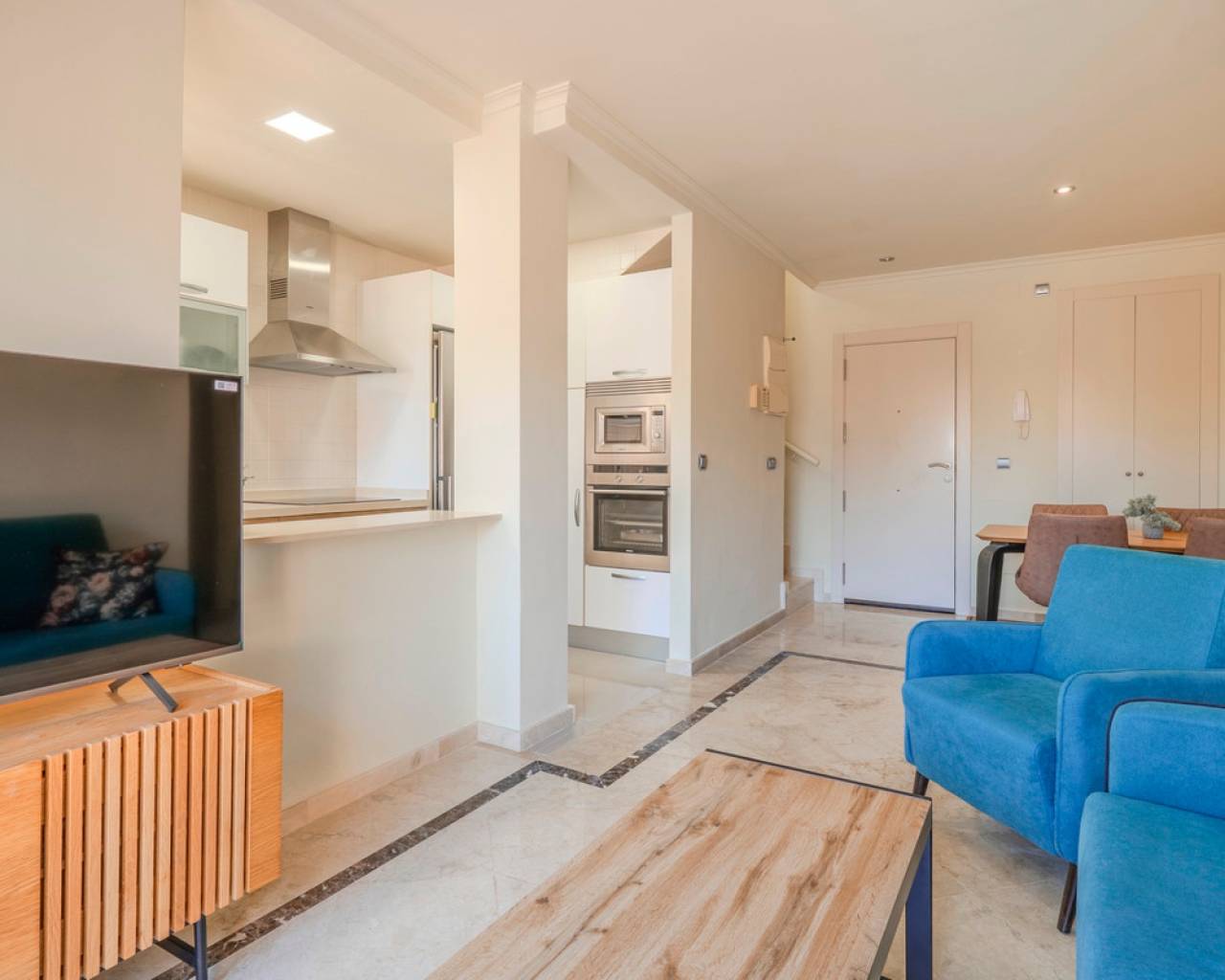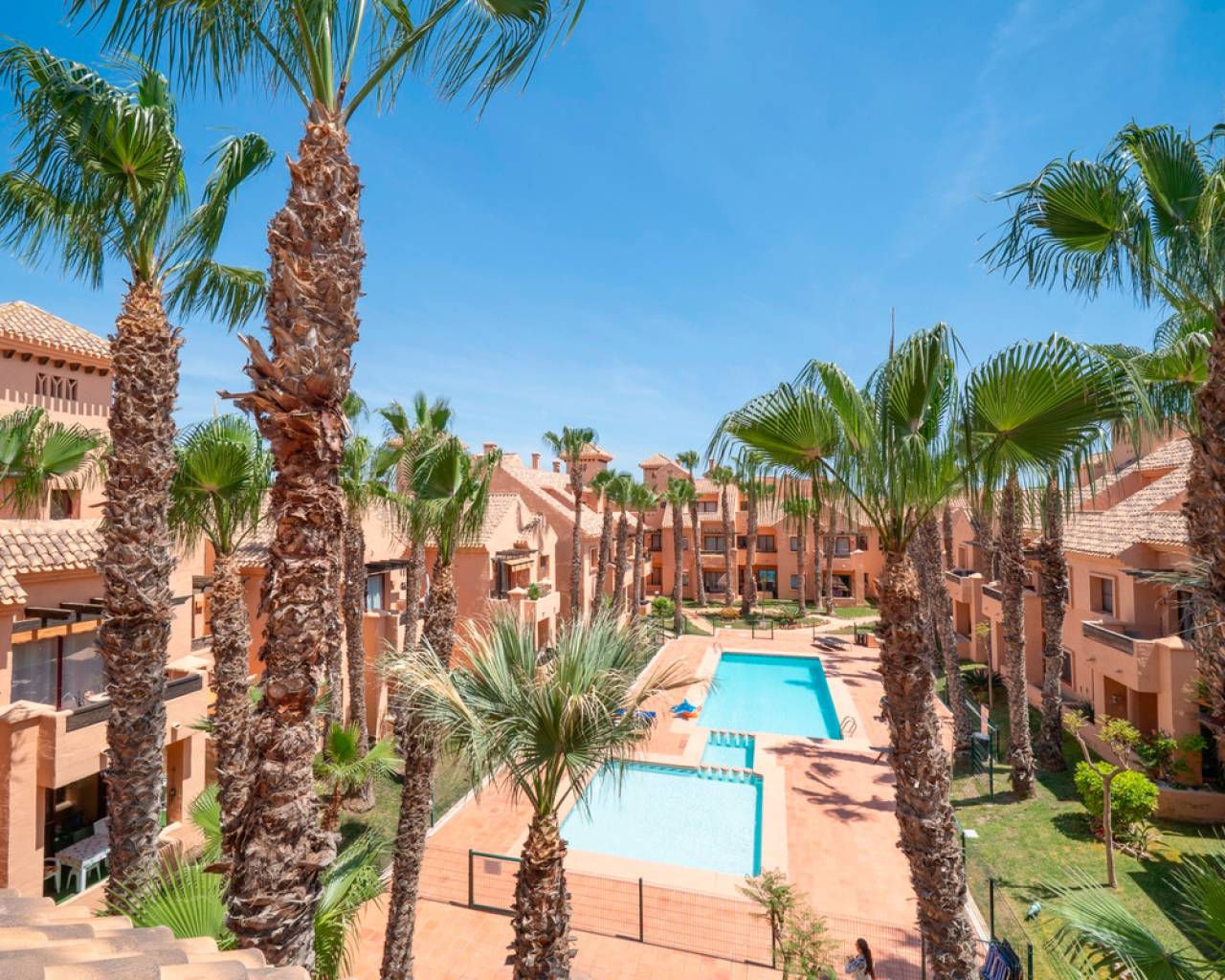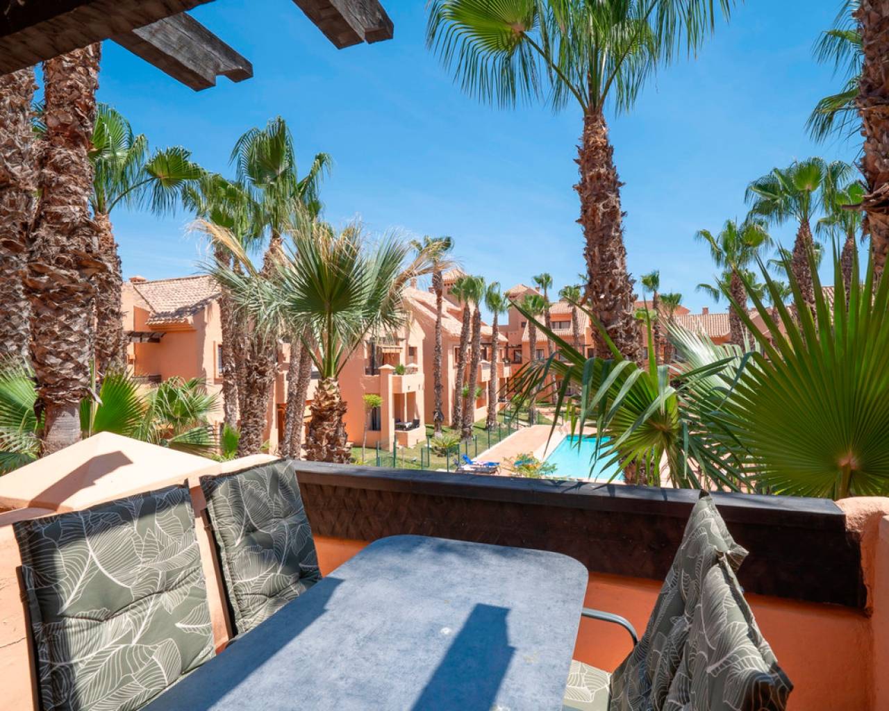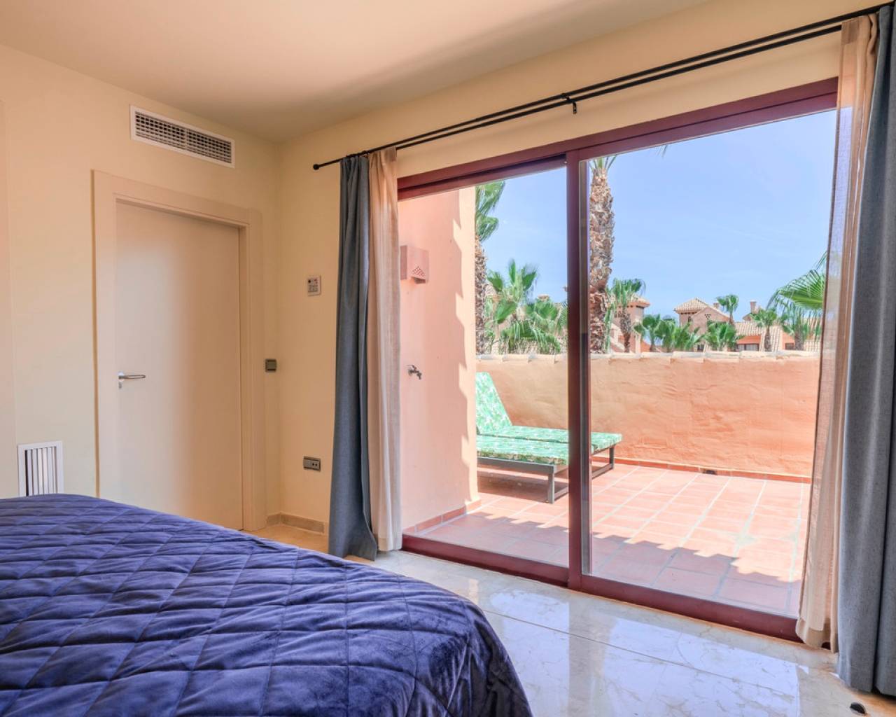 This exclusive 3-bedroom penthouse duplex is located in the prestigious Nueva Ribera Beach Club urbanization, right on the front line of the best beach in Mar Menor. With a built area of 97.78 m² spread over two floors, this property offers the perfect combination of comfort, style, and a privileged location. On the main floor, there is a bright and spacious living-dining room with access to a balcony overlooking the communal pool, a fully equipped independent kitchen, a full bathroom, a secondary bedroom, and a master bedroom with access to another balcony facing the landscaped communal pool area. The upper floor features an additional bedroom, a full bathroom, a convenient storage room, and a large private solarium terrace, ideal for relaxing outdoors and enjoying the Mediterranean climate year-round. The property includes a garage space and storage room in the price. It stands out for its excellent quality finishes: armored front door, white lacquered interior doors, and high-quality built-in wardrobes. The gated urbanization offers extensive green areas, a communal swimming pool, and 24-hour security surveillance, all within a peaceful and secure environment just steps from the sea, allowing you to enjoy sun, beach, and a unique lifestyle on the Mar Menor.