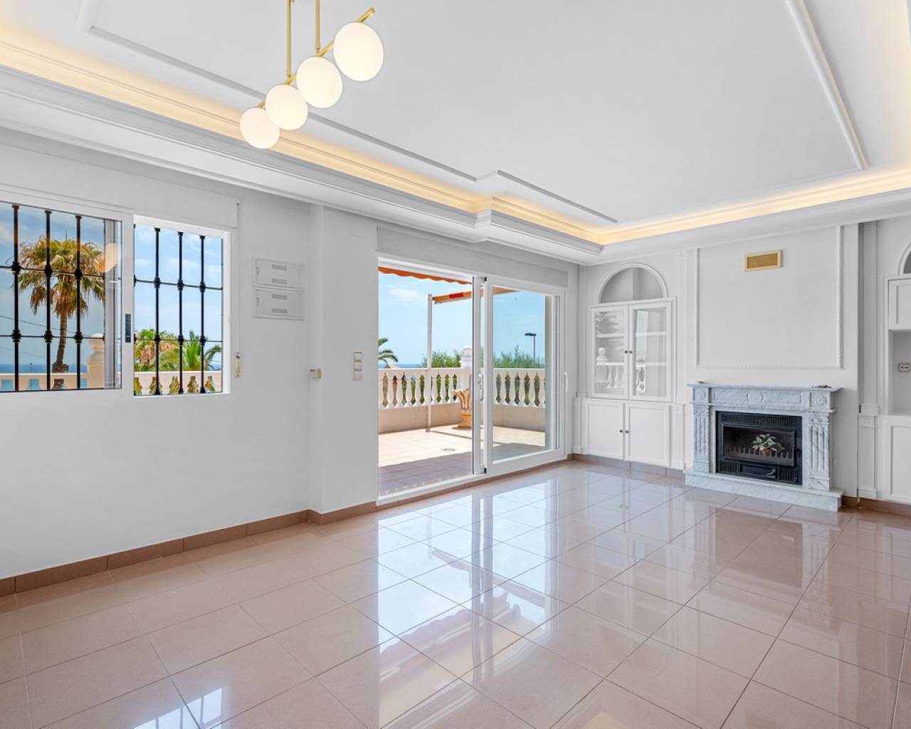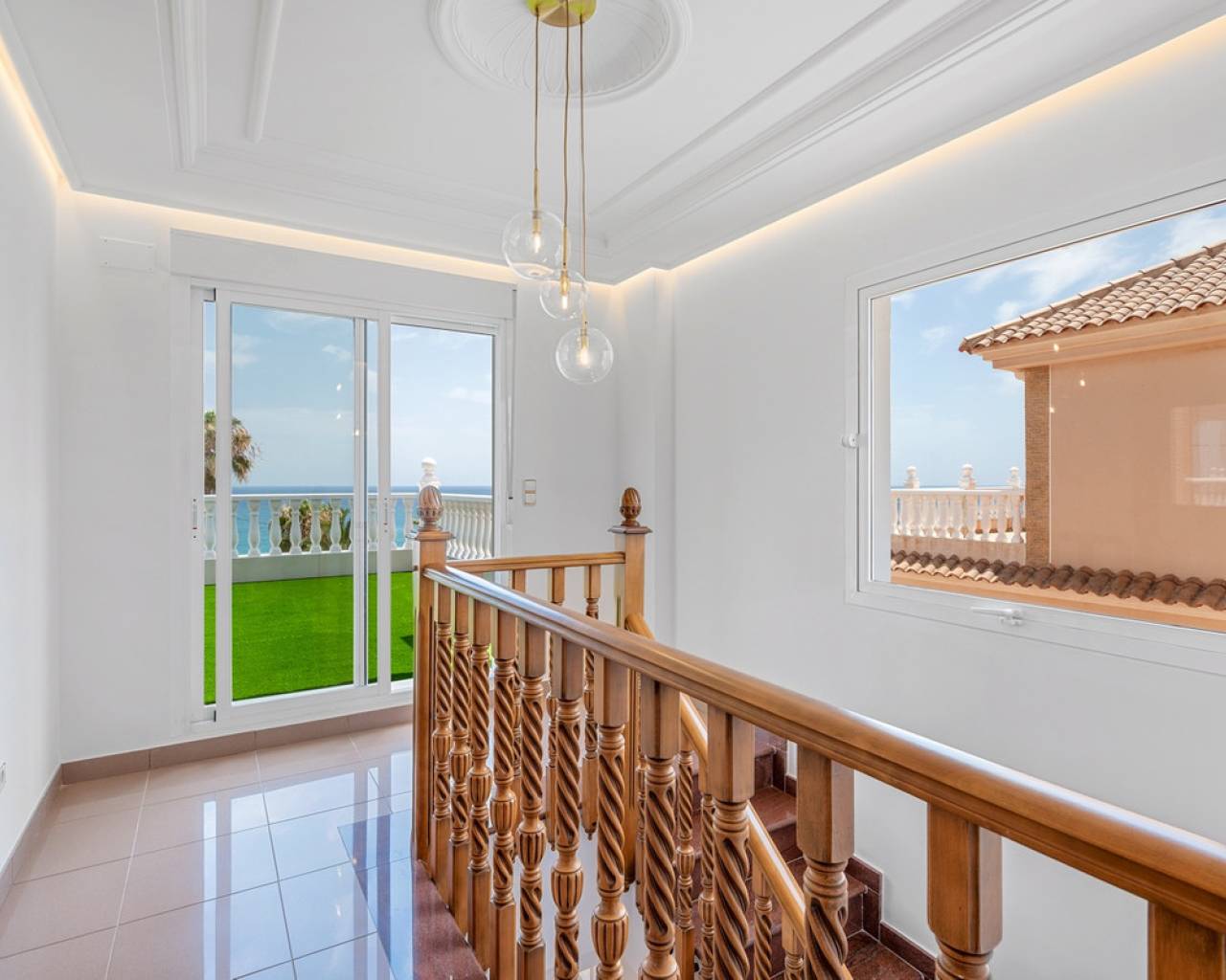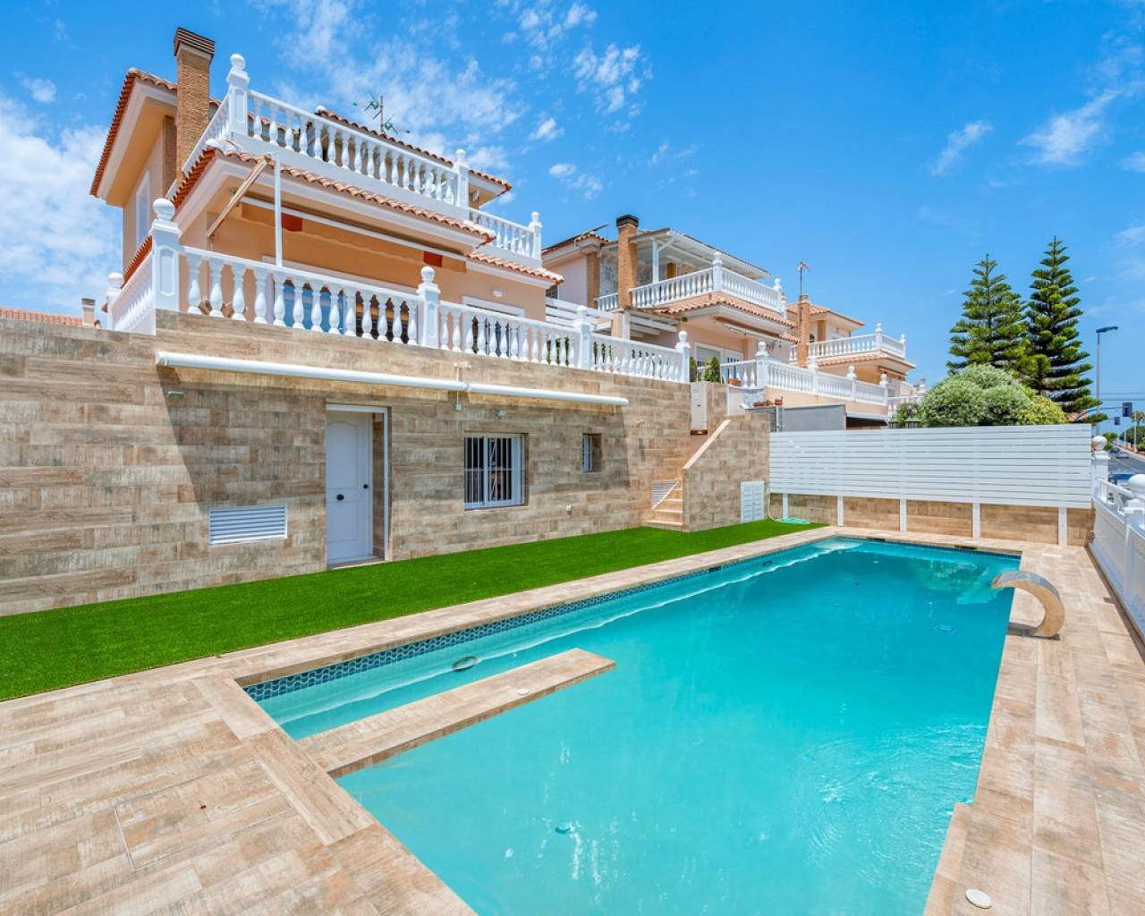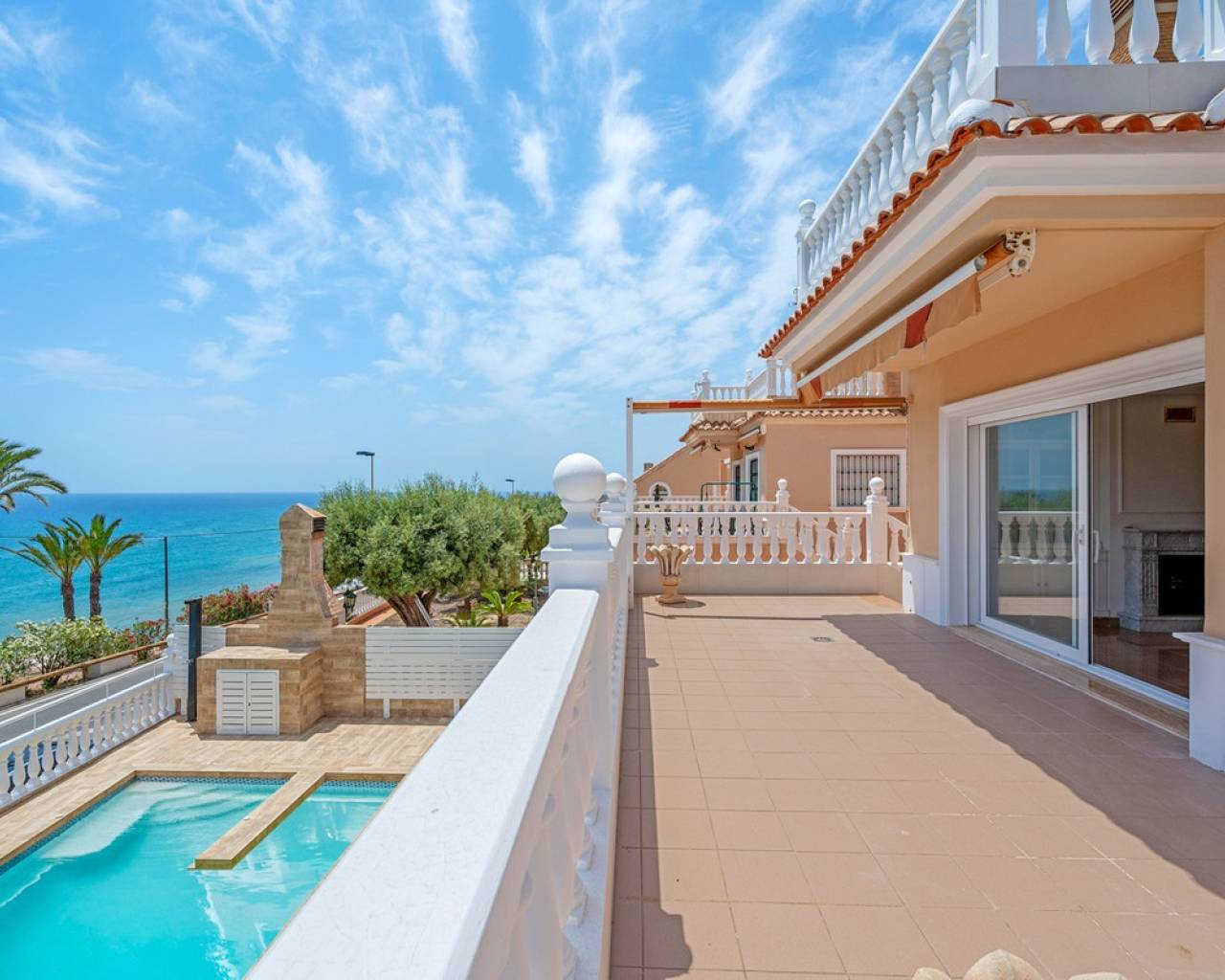 This elegant detached villa of 290 m², located in the prestigious Residencial El Faro in Torrevieja, has been recently renovated and combines modern design, functionality, and a privileged location with open sea views. The house is spread over three floors. The lower level includes a double private garage with direct access to the home, a spacious recreation room ideal for a home cinema or games area, a wine cellar, an additional bedroom, a full bathroom, a technical room with a diesel tank, and various storage areas. This floor provides direct access to the outdoor space featuring a private pool, artificial grass, and a large patio – perfect for enjoying the Mediterranean climate. The main floor features a fully equipped independent kitchen, a bright living-dining room with a fireplace, a bedroom with a built-in wardrobe, and a full bathroom. The living room opens to a spacious terrace with sea views and several outdoor patio areas ideal for relaxing or entertaining. The upper floor has two additional bedrooms, both with access to a large balcony overlooking the sea, and a full bathroom. All rooms are spacious and bright with built-in wardrobes. Additional features include air conditioning, fireplace, laundry room, covered terrace, diesel heating system, storage room, and extra parking on the plot. The property is located in a gated community offering privacy and security. A unique opportunity for those seeking a move-in-ready home with sea views in one of the most desirable residential areas of Torrevieja.