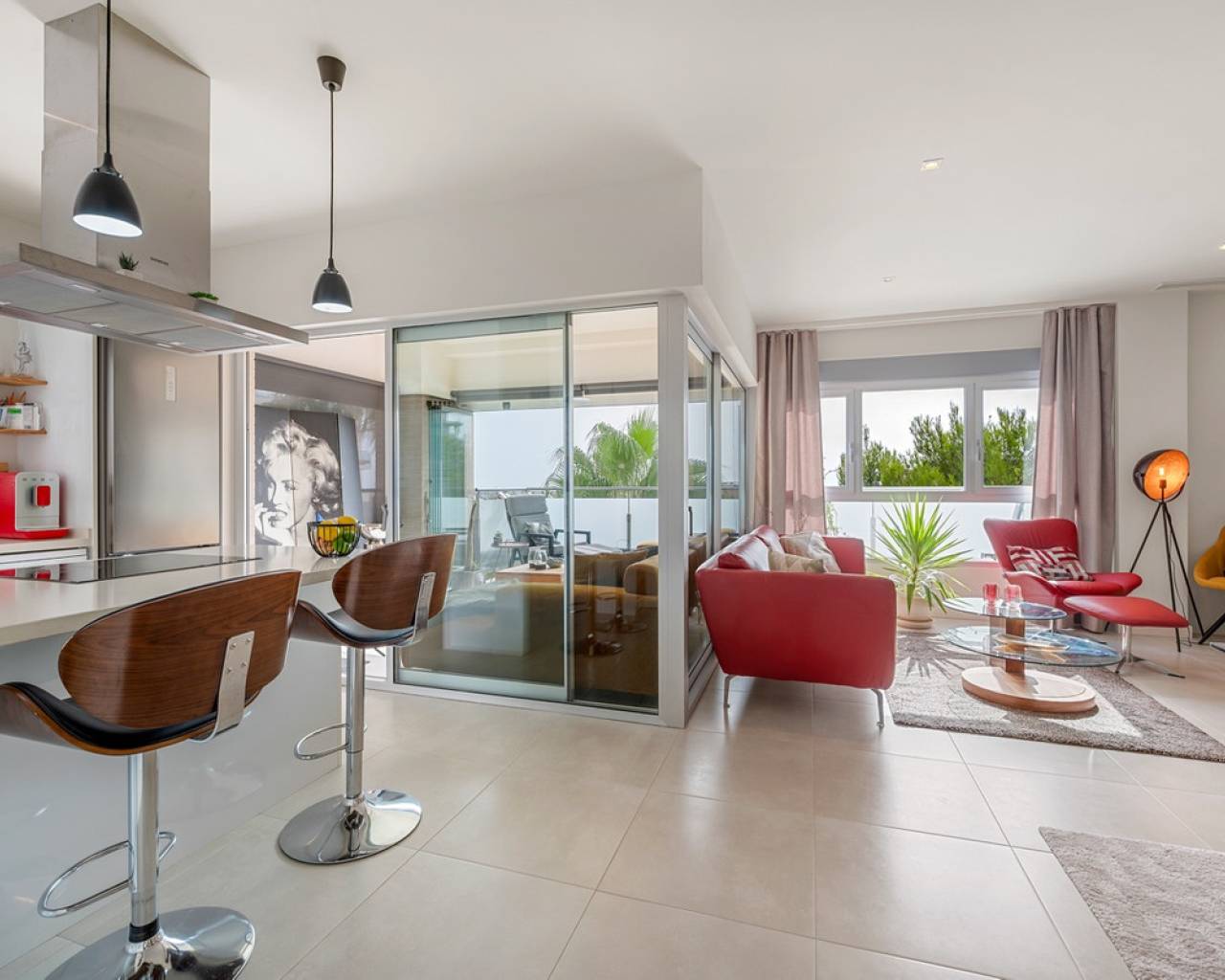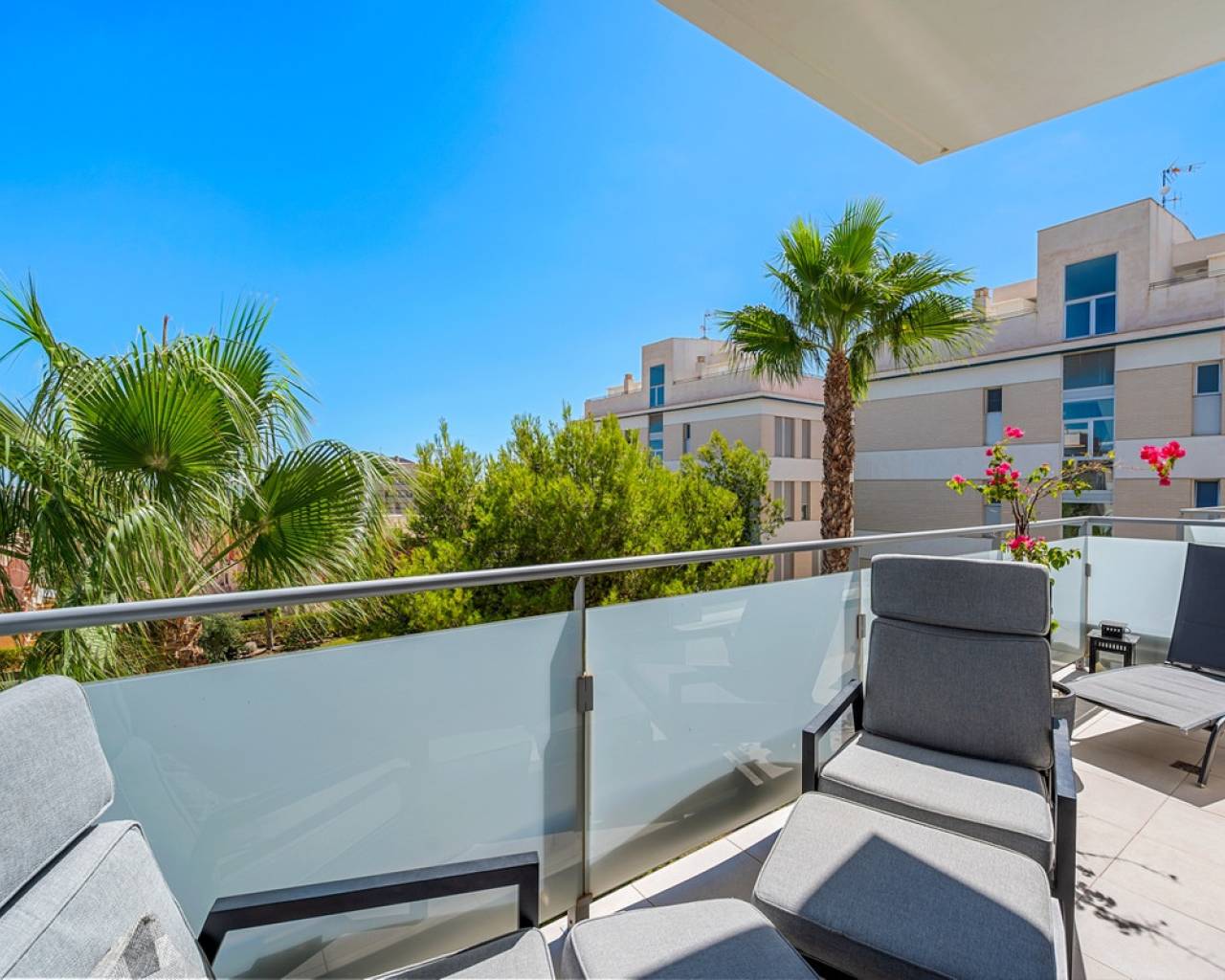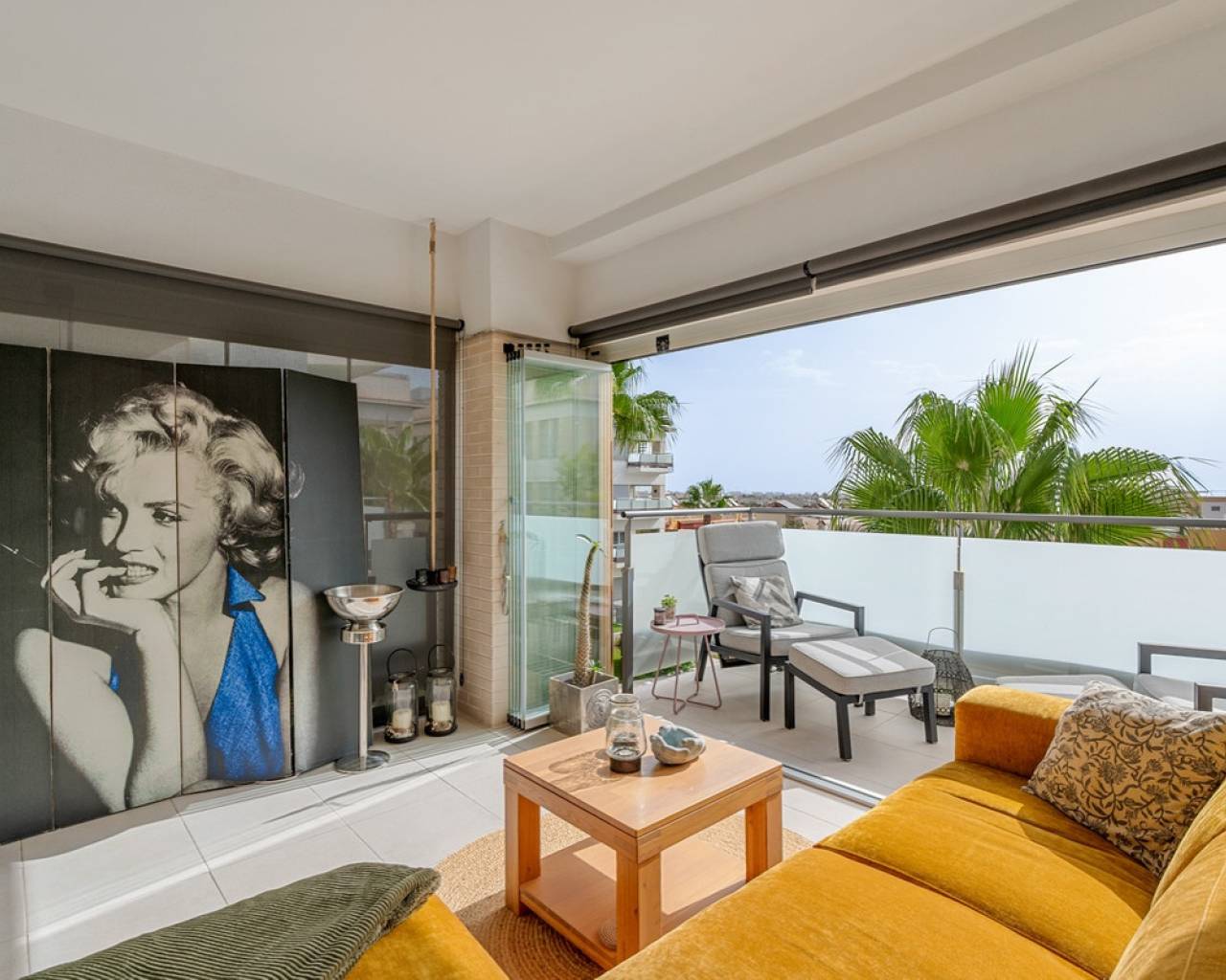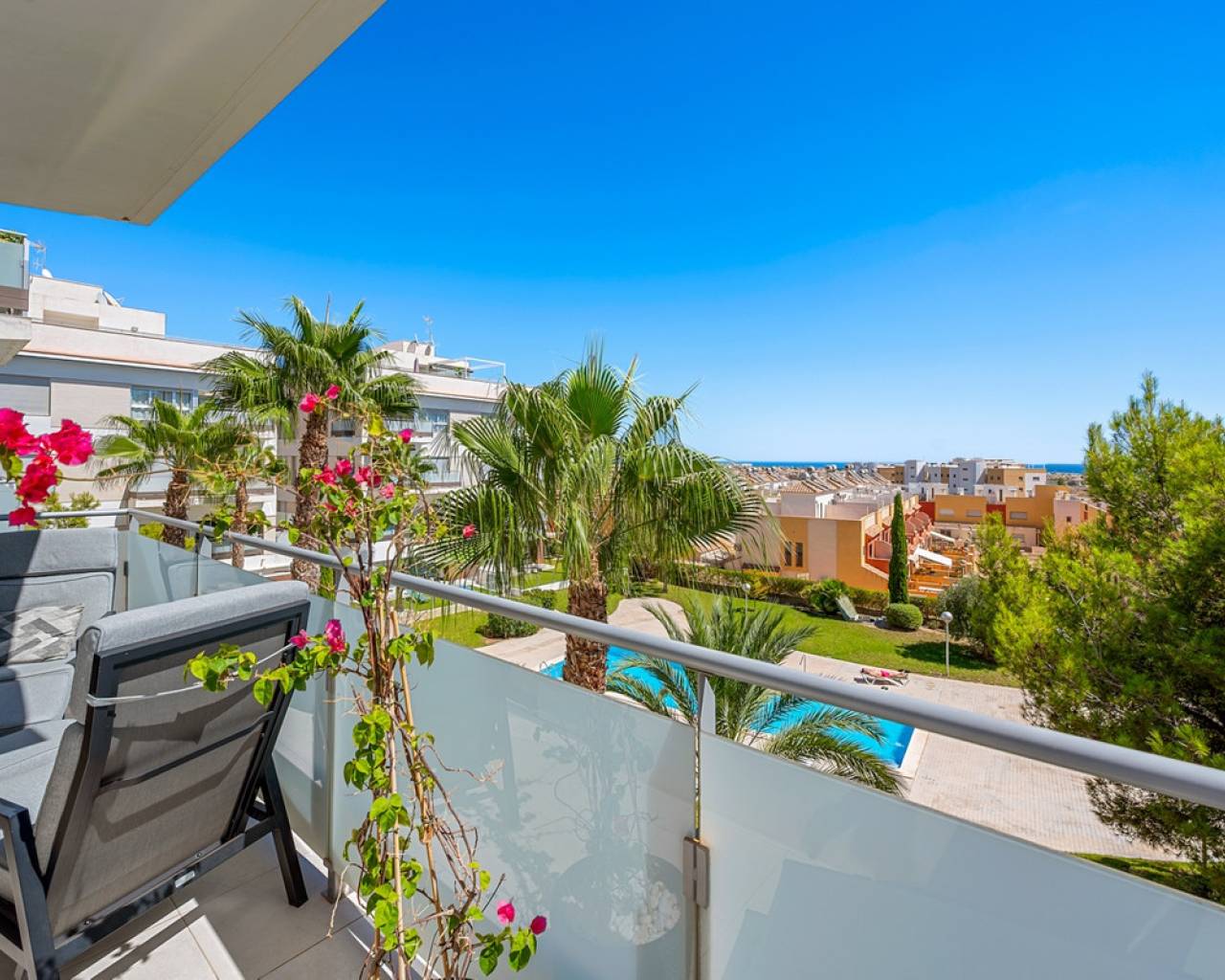 Discover this elegant 2-bedroom, 2-bathroom apartment built in 2017 and kept in excellent condition. The property is sold furnished (excluding a few personal items and artwork), offering a move-in-ready home in one of the most sought-after areas of the Costa Blanca. Enjoy a smart and practical floor plan with a bright living space extended by a glazed terrace — perfect as an additional lounge or dining area. From here, you can take in the beautiful views towards the Mediterranean Sea. The apartment is located on the third floor. Additional features include: Two storage rooms (one inside the apartment, one in the attic)Elevator in the buildingConvenient parking right outsideA well-established community with a great atmosphere Located just a short distance from cafés, restaurants, shops, beaches, and golf courses, this home offers the perfect balance between relaxation and convenience. Whether you're looking for a holiday retreat, a permanent residence, or an investment in a rising market, this apartment is a rare opportunity. Sit back, relax, and enjoy a glass of wine with panoramic sea views from your private terrace. Community Mirador Villamartin. All appliances (including the induction hob) are in good condition. Floor heating in both bathrooms.