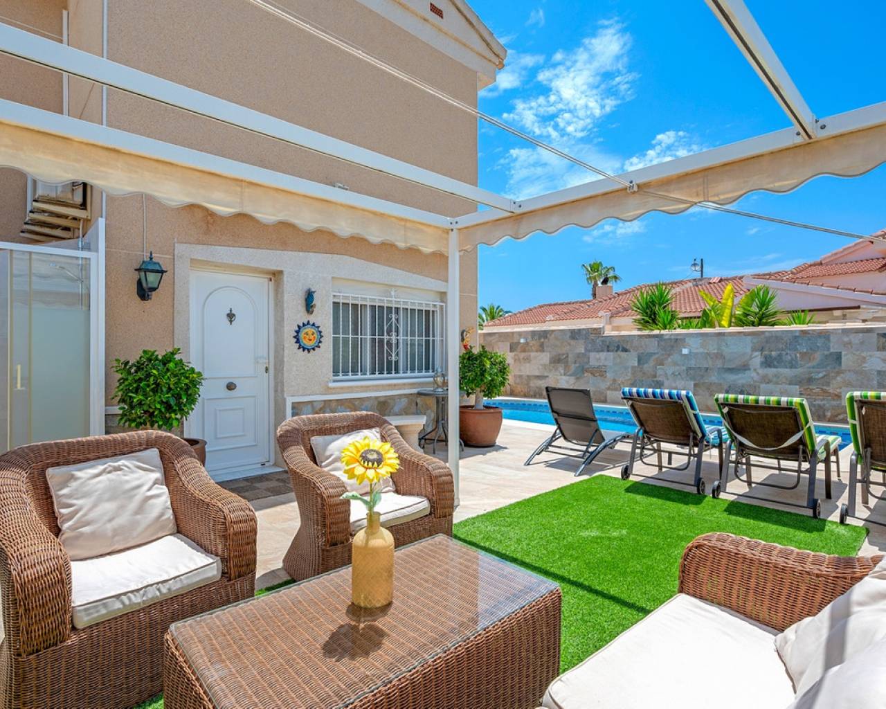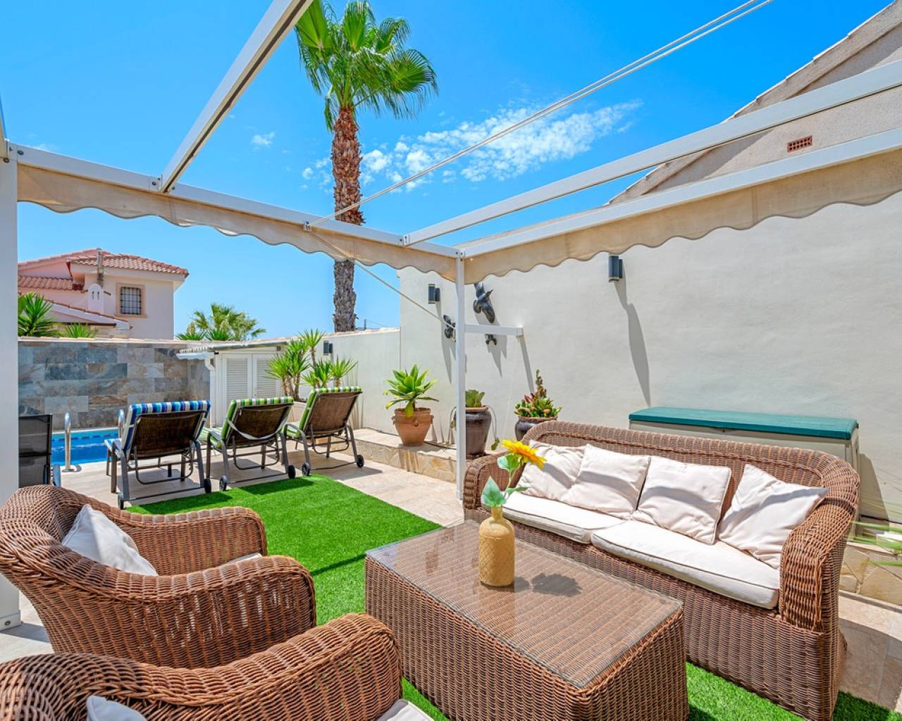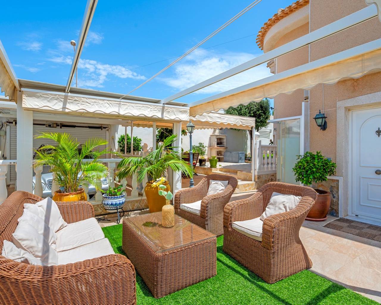 Charming Mediterranean style villa with 3 bedrooms located close to the center of Ciudad Quesada. The villa has a total living area of 238 m2 divided on two levels; the main floor and a guest apartment in the lower floor. The main floor consists of two double bedrooms and two bathrooms, where one of them is en-suite to the master bedroom. Furthermore this floor consists of an entrance area, an open-plan kitchen, a dining and living area with fireplace, and a glazed terrace with an additional dining and living room. By the entrance to the villa there is a covered terrace and from the glazed terrace you have direct access to the pool area. On the lower level you can find a separate guest apartment that consists of a living room, a kitchen, a large bedroom and a bathroom. The villa is equipped with central heating (on gas), air condition, fireplace in the living room, alarm system and osmosis filter. Outdoor areaThe villa is set on a south facing plot of 500 m2. The garden is well maintained with tiles and plants. You can find a swimming pool (salt water), an outdoor shower, a carport, a BBQ area, a storage room and several outdoor seating areas. The garden has automatic irrigation system. The villa is located just a short walk from the Main Street in Ciudad Quesada where you can find a wide selection of amenities.