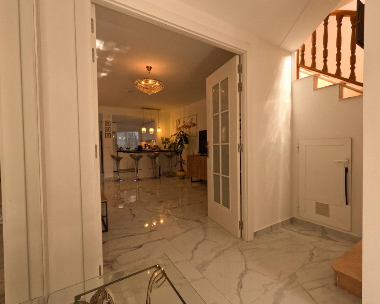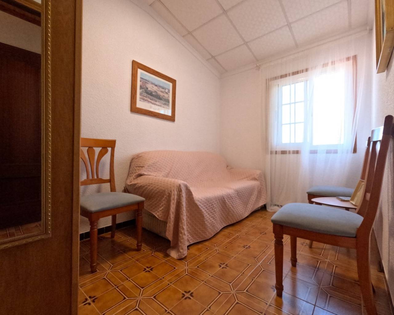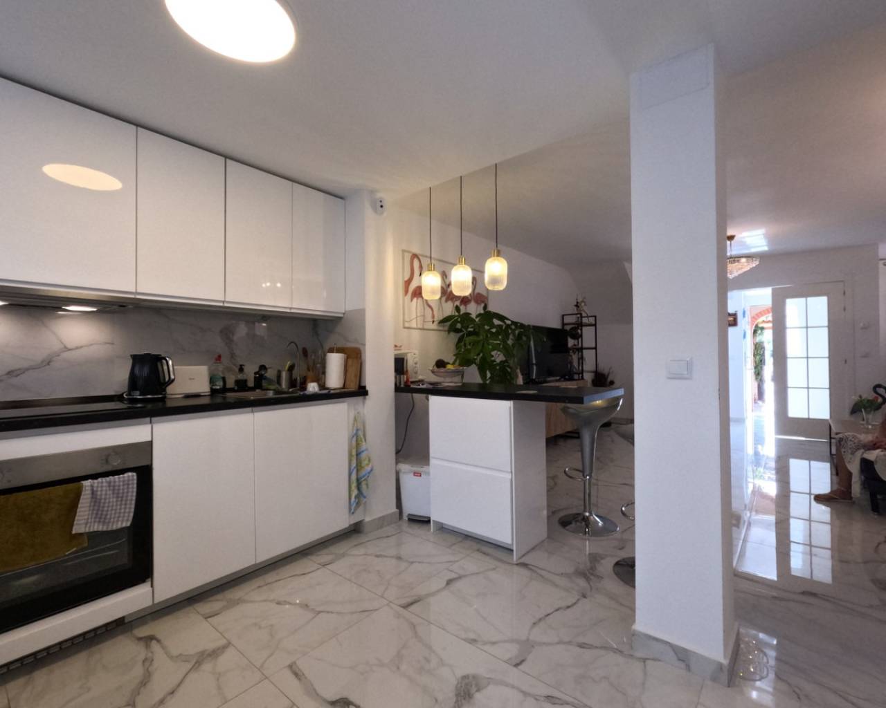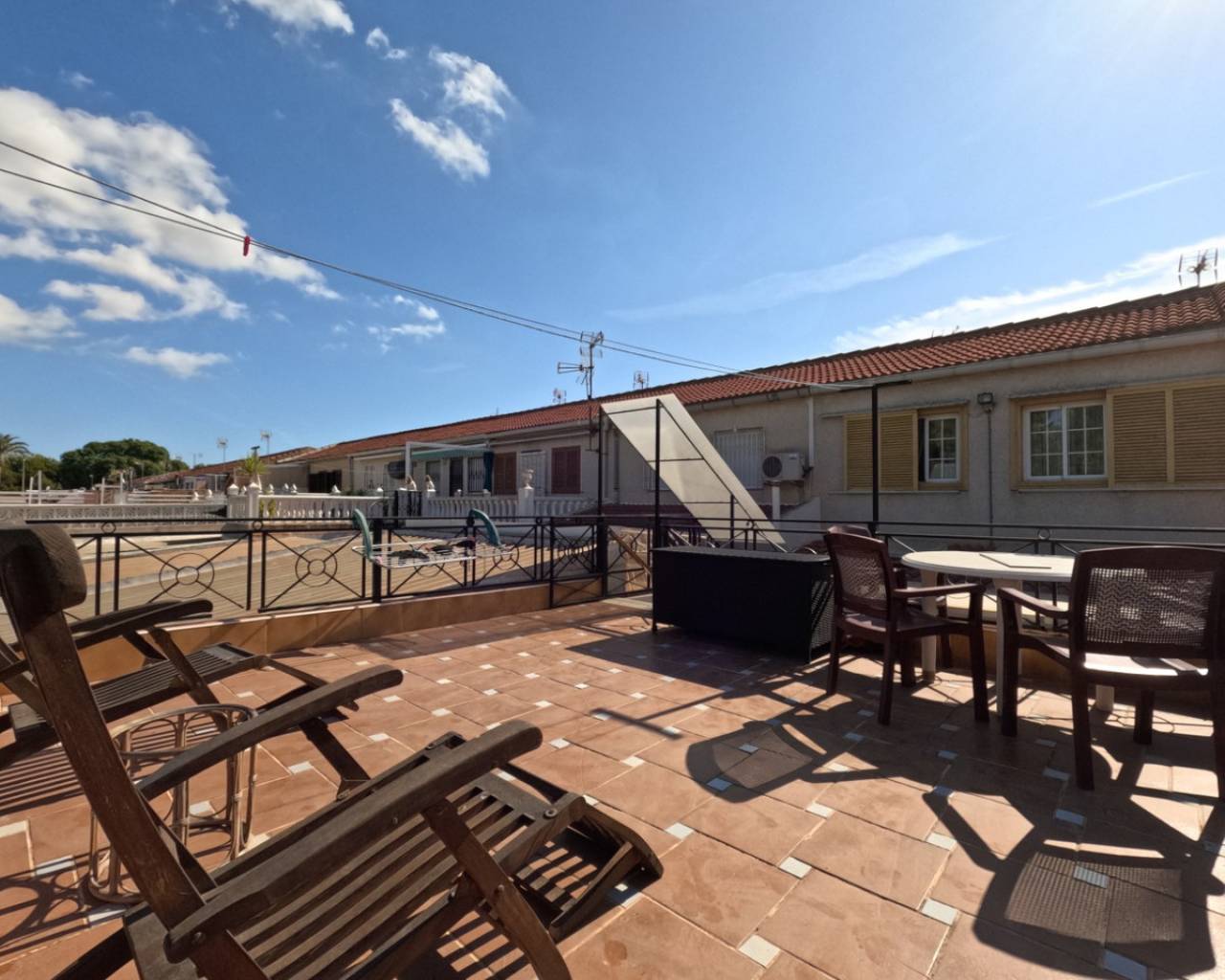 Discover this fantastic corner terraced house located in a quiet and pleasant residential area of Torrevieja, strategically positioned between Los Náufragos Beach and the famous Salt Lakes, just 350 m from the sea. A perfect setting to enjoy the Mediterranean lifestyle all year round. With 116 m² of built area, this corner property offers spacious, bright and well-distributed interiors — ideal as a permanent home, holiday retreat or investment. It features 4 bedrooms, making it perfect for large families, a home office, guest rooms or rental opportunities with excellent potential. The renovated ground floor includes a comfortable living room with underfloor heating, a functional open-plan kitchen with separate laundry area, one bedroom and a full bathroom. From this floor, there is direct access to the private solarium, a highly valued space for sunbathing, relaxing, or enjoying open views in a chill-out atmosphere. On the upper floor, you'll find the remaining bedrooms, all with good ventilation and natural light. The property also features a terrace, private corner garden (perfect for barbecues, kids' area or leisure), and a private garage space, a real asset in coastal areas. A standout feature is the installation of photovoltaic solar panels, providing significant energy savings and making the home more efficient and sustainable. Sold semi-furnished, ready to move into or customize. A unique opportunity that combines space, privacy, outdoor living, energy efficiency and a privileged location close to the sea.