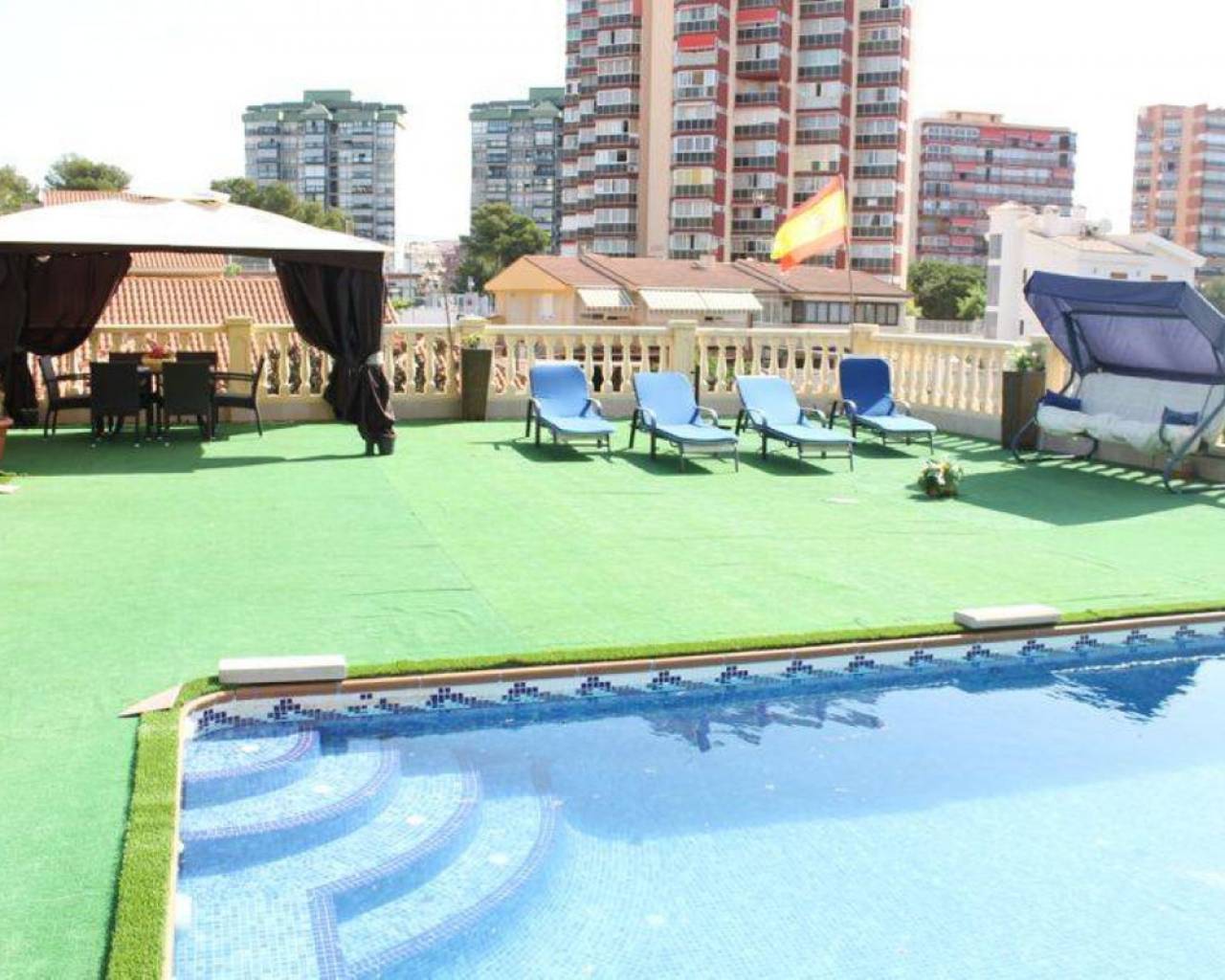This fantastic property consists of 2 cottages, each with independent access, has an automatic pool cleaning do not have to worry. Is located in Benidorm, very difficult to find. In its low has 13 parking spaces that currently are rented to customers who need it as it is in the city. The main house was built in 1988 and the second chalet in 2011. This second house is transparent so you furnish it to your taste, ideal as guest cottage.~