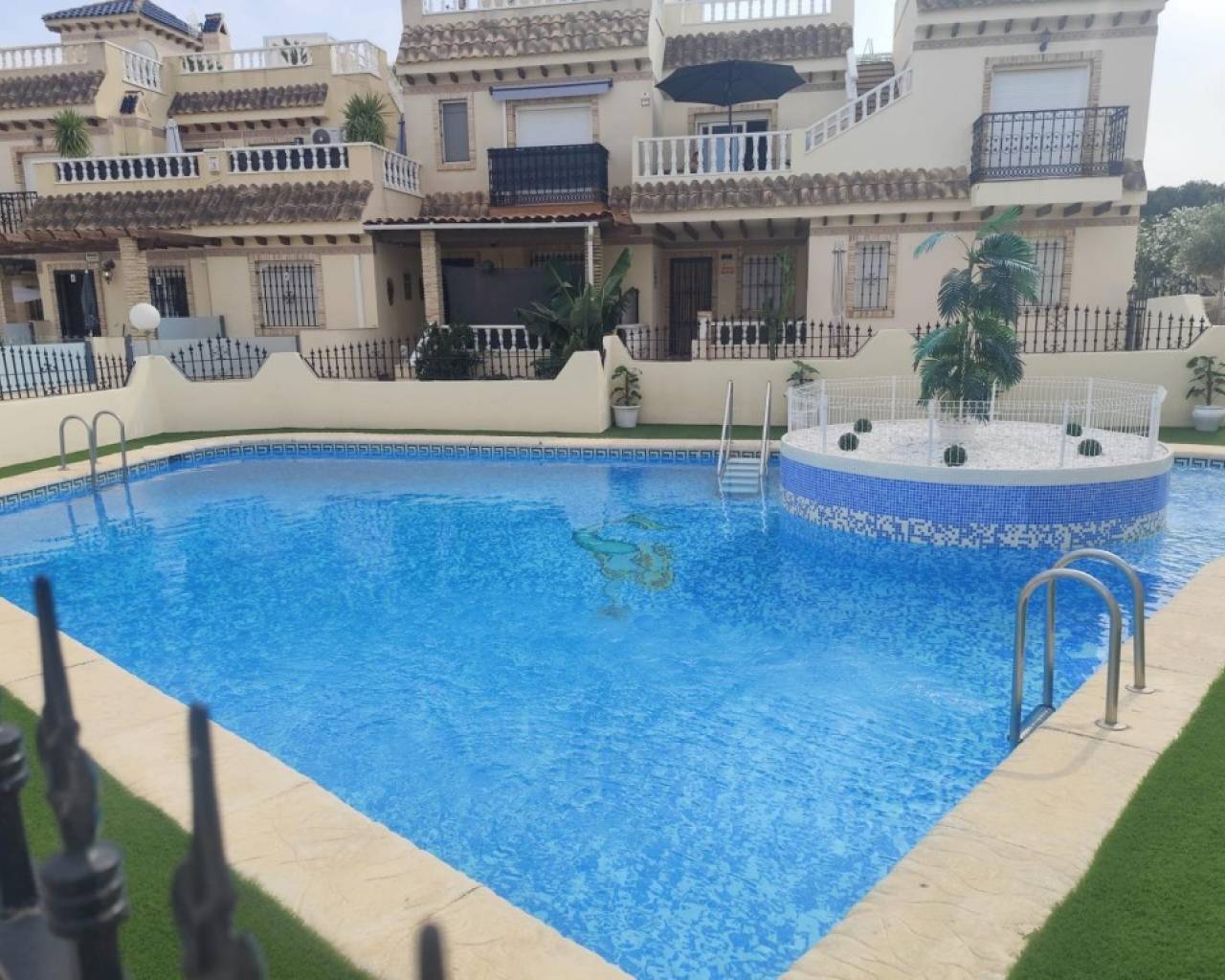 We present at the Costa Blanca Alicante a semi-detached house in Orihuela Costa in a closed urbanization with swimmingpool! This house have 2 double bedrooms a bathroom, a toilet, and a equiped kitchen! Further a solarium and a garden! Close to the golf and center comercial!