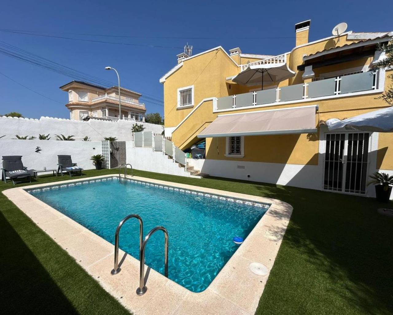 Discover this beautifully presented, spacious detached villa set on a generous 400m² private plot in the sought-after residential area of El Galan. Nestled between Villamartin and San Miguel de Salinas, the property offers a peaceful and secluded lifestyle while remaining close to key amenities. This impressive home boasts excellent curb appeal with off-road parking and a covered carport, as well as a large, low-maintenance outdoor space ideal for enjoying the Mediterranean climate. The villa is thoughtfully laid out over two levels. The main floor features a bright, open-plan living and dining area, a sleek modern kitchen, and a convenient guest toilet – perfect for entertaining and day-to-day comfort. On the lower level, you'll find a spacious master bedroom complete with en-suite bathroom and direct access to the southwest-facing private pool area through patio doors. This sun-soaked space is perfect for relaxing, outdoor dining, or hosting guests. Two additional double bedrooms (one currently used as a home office), a family bathroom, and a large storage room complete this level. Internal stairs lead to a private roof solarium offering sun all day and stunning open views – an ideal spot for sunbathing or evening drinks. This turnkey villa comes with a host of extras, including air conditioning throughout, LED lighting, solar panels for both electricity and hot water, and a charming log burner for cosy winter nights. Prime Location: El Galan offers easy access to everything you need – including a range of bars, restaurants, and shops within walking distance. A top-rated international school is nearby, and the renowned Villamartin Golf Course is just 3 minutes away. The beautiful blue-flag beaches of the Orihuela Costa and the popular La Zenia Boulevard shopping centre are only a 10-minute drive. Key Features: Detached villa on a 400m² private plot Southwest-facing private pool 3 bedrooms, 2.5 bathrooms Modern open-plan kitchen and living area Roof solarium with all-day sun Air-conditioning, solar panels, and log burner Close to golf, beaches, schools, and amenities This is an exceptional opportunity to own a stylish and energy-efficient home in one of the Costa Blanca's most desirable areas. Contact us today to arrange a viewing!