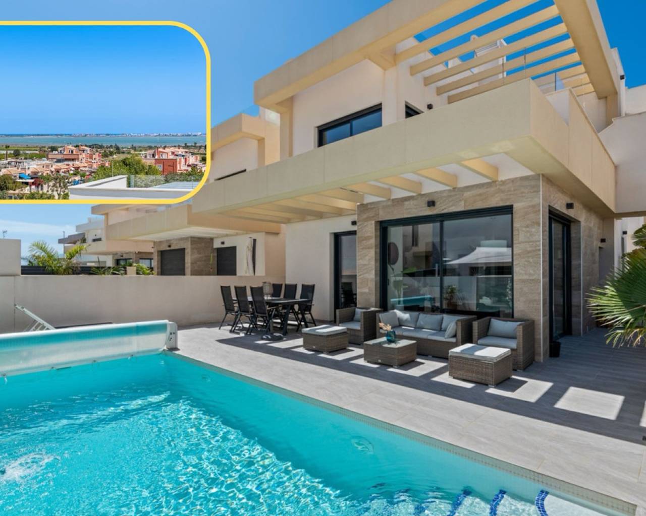 Welcome to our newest exclusive listing in La Herrada, Los Montesinos. Costa Blanca, Spain!The first thing to note about this beautiful & well maintained property is that it is the perfect choice for someone who wants the beauty and quality of a new build property but without the wait for one to be built. It is a fantastic 3 floor villa with 3 bedrooms and 2 bathrooms and with a nice outside space, and it is sold as seen. With all furniture included. The best start to owning a beautiful Spanish home is to own a modern home that is ready to go!New Build villa with 3 bedrooms and 2 bathrooms, open plan kitchen with living room-dining room. Special about this property is that the living room area is extra large! This villa has a bigger living room without losing any useful space for the rest of the house! The open kitchen is very practical and comfortable. It includes a large island that unites the entire space and helps you create a very spacious, large room, in which you can create different environments: a formal dining room to receive your guests, a very homely living area with some bohemian details, a little corner with some games for the children….The large windows of this wonderful room fill the house with the warm light of the Mediterranean and unite the interior with the terrace and the garden, and, above all, with the pool. A true oasis where you will spend the days and nights, having fun, laughing and enjoying with yours. The villa has a private swimming pool from 7x3M with a built in waterfall. There is also the possibility to park your car on your own property driveway. On the second floor are 2 bedrooms, one of the bedrooms is the master suite, with a private bathroom, is spacious, comfortable and intimate, and offers fantastic views. You also have direct access from both bedrooms to the terrace. In addition you have a magnificent solarium that will be your private paradise, your private corner where you can disconnect and relax as you deserve.The typical town of Los Montesinos is strategically located 10 minutes by car from the beaches and leisure of Torrevieja (with all the services of a big city: theatre, 2 hospitals, international schools, etc.), from several golf courses and with easy access to the A7 highway to reach Alicante airport in 35 min.In the urbanization there are supermarkets and bars for day-to-day service, being a rural and quiet environment. The climate in this area guarantees 300 days of sunshine a year with an average temperature of 20ºC, which, together with the rich gastronomy and cultural and sports activities available in its surroundings, makes this area an ideal place to establish a second residence for vacation or a quiet place to live permanently.