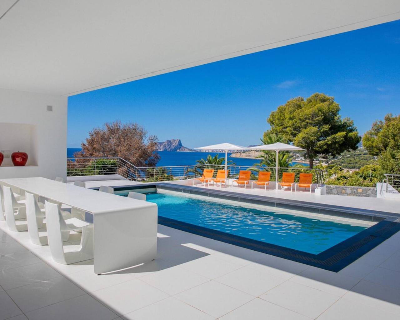 Luxury villa with several terraces, solarium, swimming pool, summer kitchen, gym, garage, 5 bedrooms, open kitchen, guest apartment and alarm system. This exceptional gem has been crafted with a unique design that sets it apart from other architectural masterpieces. Every detail has been carefully selected to create an atmosphere reminiscent of an art gallery. Immaculate white dominates this architectural marvel, which boasts stunning panoramic sea views and expansive terraces enveloped in luxury. The asymmetrical structure with a towering double-height window on the main facade floods the interior with light and creates a distinctive design. The modern staircase and natural stone walls infuse the home with warmth while maintaining its elegant character. The spectacular terrace with a swimming pool and waterfall, the exclusive outdoor summer kitchen, the glass elevator, and the generous rooms offer pure luxury. A fitness room, home theater, and large garage complete the image of this breathtaking property. Situated in a peaceful, sun-drenched residential area, this home provides easy access to the renowned El Portet beach, the Moraira Yacht Club, and beautiful coastal walks. Enjoy life in one of the most sought-after locations, with world-class restaurants, charming terraces, and an array of shopping opportunities - a place where luxury and comfort blend seamlessly.