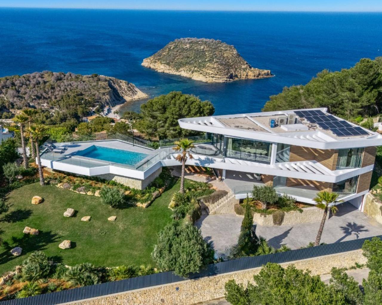 Modern luxury villa with stunning views to isla Portichol, swimming pool, garden, double garage, home automation, solar panels and electronic entrance. Presiding over the hill at the top, from where you can enjoy the best views of the sea and the captivating Portichol Island, home to one of Jávea's most iconic coves, a setting for numerous international films due to its sheer beauty, lies this spectacular, uniquely designed villa. Its large glass walls allow for mesmerizing views of the sea and the mountains. Its modern aesthetic, with elegant overhangs and atypical shape, make it truly captivating. Solid qualities, elegant finishes, bright spaces, and an intelligent layout make the interior of this beautiful work of art an idyllic place to live. Like a private oasis in paradise itself, where you can unwind and experience unforgettable moments, from sunrise overlooking the sea from your bed, to intimate sunset dinners with a good wine in pleasant company, or to hosting lively parties on the terrace and by the pool. A short walk away is Portichol Cove; a little further, Granadella; Along with Arenal Beach in the heart of Jávea, these are undoubtedly the stars of the Mediterranean Coast. This beautiful villa is also close to the Jávea Golf Club, the Jávea Yacht Club, tennis and paddle tennis courts, supermarkets, and numerous restaurants, some of which are even on the prestigious Michelin list. Lively beach bars by the sea provide music and color on warm summer nights.