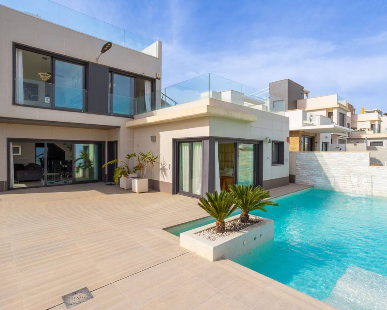 Elegant villa with stunning roof terrace and private pool Welcome to this elegant villa with a large private pool and a spacious roof terrace in a sunny location. This is a modern and well-planned accommodation with a natural location near San Miguel de Salinas. A short drive from the salt lakes, the Mediterranean Sea and beautiful beaches. Torrevieja city can be reached in about fifteen minutes by car. The villa has a well-thought-out floor plan, generous light flows and lightly furnished spaces. There are five bedrooms, four bathrooms, a guest toilet and a living room and kitchen in an open plan. In addition, there is a spacious plot with a private pool, a terrace and a large sunny roof terrace. On the entrance floor there is a living room and kitchen as well as a bedroom with en suite bathroom and a guest toilet. One floor up there are two bedrooms, each with its own bathroom en suite. On the basement floor there is an open-plan kitchen and living room as well as two bedrooms and a bathroom. At the top of the house is the large roof terrace with space for sun loungers and lounge furniture. This is an accommodation that suits even the most discerning of tastes and requirements. An accommodation that you will be happy to call your home in Spain. Please contact us for more information or to book a viewing. We will of course conduct digital viewings if you are unable to be there in person.