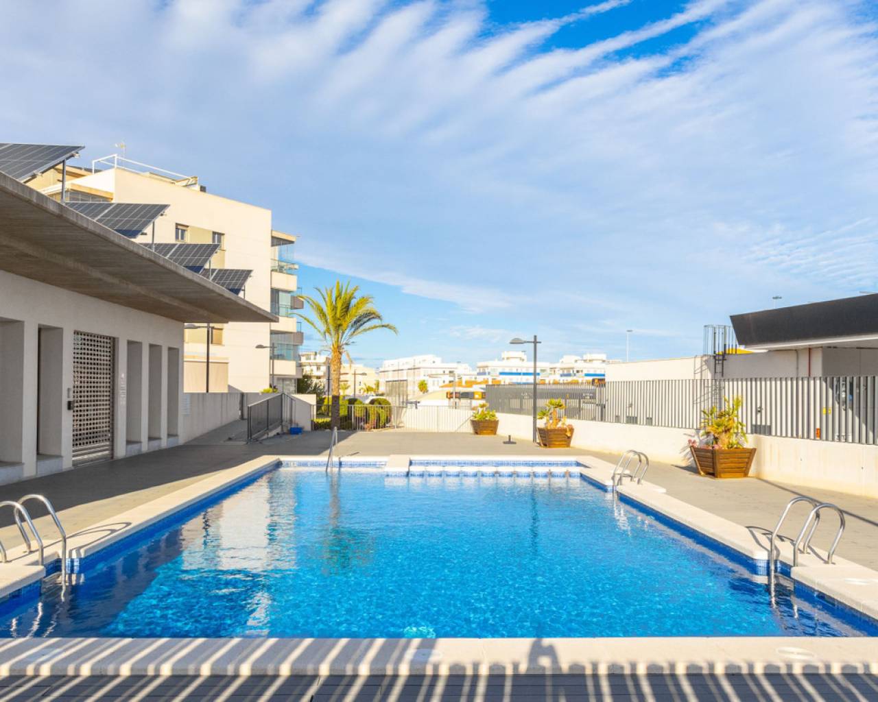 Apartment with large terrace. Communal pools, sauna and gym. A warm welcome to this well-planned and spacious apartment with a large terrace located in the attractive Altos del Mediterraneo in Los Dolses on the southern Costa Blanca. The apartment has a consistently pleasant flow of light and lightly furnished surfaces, it is about 152 square meters and consists of four bedrooms, two bathrooms, living room and kitchen. On the large terrace there is space for outdoor furniture and a lounge group. The living room has an inviting feel with space for a sitting area and dining area. The kitchen, which is open plan to the living room, has good storage possibilities in upper and lower cupboards as well as good work surfaces. Four bedrooms with pleasant light and quiet locations, space for beds and bedside tables. The master bedroom also has a bathroom en suite, that bathroom is equipped with a toilet, sink with commode and shower. The bathroom is modern and equipped with a toilet, sink and shower, there are also windows for light and ventilation. There is a parking space for the apartment. Here you live in a popular urbanization with a large range of facilities, in the common area there is an indoor pool, an outdoor pool, a gym and a sauna. Proximity to grocery store, restaurants and cafes and a short walk or bike ride from the large shopping center La Zenia Boulevard. The Mediterranean Sea and nice beaches such as Playa de la Zenia, Cala Capitán and Playa Pequeña Cabo Roig are a few kilometers away. For those interested in golf, there are a large number of well-maintained golf courses a short drive away, including Villamartin Golf, Las Ramblas Golf and Real club de Golf Campoamor. Welcome to contact us for more information or to book a viewing. We of course carry out digital screenings if you are unable to be there.