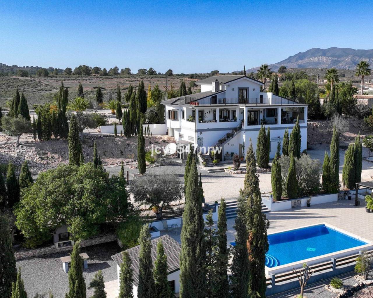 Luxury Villa in Pinoso Step into this luxurious three-story villa with breathtaking views of the sought-after village of Pinoso. Be amazed by the space and charming ambiance, and discover the possibilities to enjoy the Spanish lifestyle in peace and luxury, together with family or friends. The Villa Upon entering, the spaciousness of the villa becomes immediately evident. A large hallway offers access to the expansive living room through double doors. The living room leads to the enormous terrace, which is bathed in natural light and features a cozy fireplace. From the hallway, there is also access to the luxurious kitchen, which is fully equipped and provides direct access to the terrace. The terrace spans the entire length of the villa and offers various cozy spots to enjoy both the sun and the shade while taking in the views. How wonderful it is to enjoy a meal on the terrace, overlooking the village of Pinoso and the landscape of olive groves, almond trees, and vineyards. The kitchen also has a spacious utility room. On this floor, there is a separate toilet, a bedroom, and two bedrooms, each with an ensuite bathroom. A spacious built-in wardrobe is located in the hallway. An internal staircase leads to the upper floor. Here, you'll find a built-in linen closet and a very spacious bedroom with an ensuite bathroom. The bathroom is accessible via a hallway/walk-in closet, which offers plenty of storage space and is equipped with both a bathtub and a shower. This floor also has a large terrace, where the view is just as stunning. From the garden, the lower floor of the villa is accessible; not only is there a large garage (for two cars and plenty of storage space), but also a fully equipped, spacious apartment with high ceilings. Guests can enjoy complete privacy here, with their own living room, kitchen, bedroom, and bathroom. Around the Villa The plot is mostly fenced. The garden is beautifully landscaped and features many trees and shrubs. A standout feature is the pool with a surrounding terrace, which offers another fantastic view. There is a pool house with a toilet, and a cozy covered area has been created, where it's pleasant to relax in the shade. Near the pool house, there is also a BBQ. Everything has been thoughtfully arranged to ensure you have a great time during evenings here. Villa Amenities Both inside and outside, the villa is in excellent condition, with electricity and water. It features a wood-burning stove in the living room, a septic tank, screens with mosquito nets, TV, and internet. Pinoso The villa is located just a few minutes' drive from the village of Pinoso. In Pinoso, you'll find all daily necessities, including supermarkets, schools, a medical center, sports facilities, and a wide variety of restaurants. Both Alicante and Murcia airports, as well as the beaches, are within an hour's reach. Experience the surroundings and the villa itself, and make an appointment for a viewing!