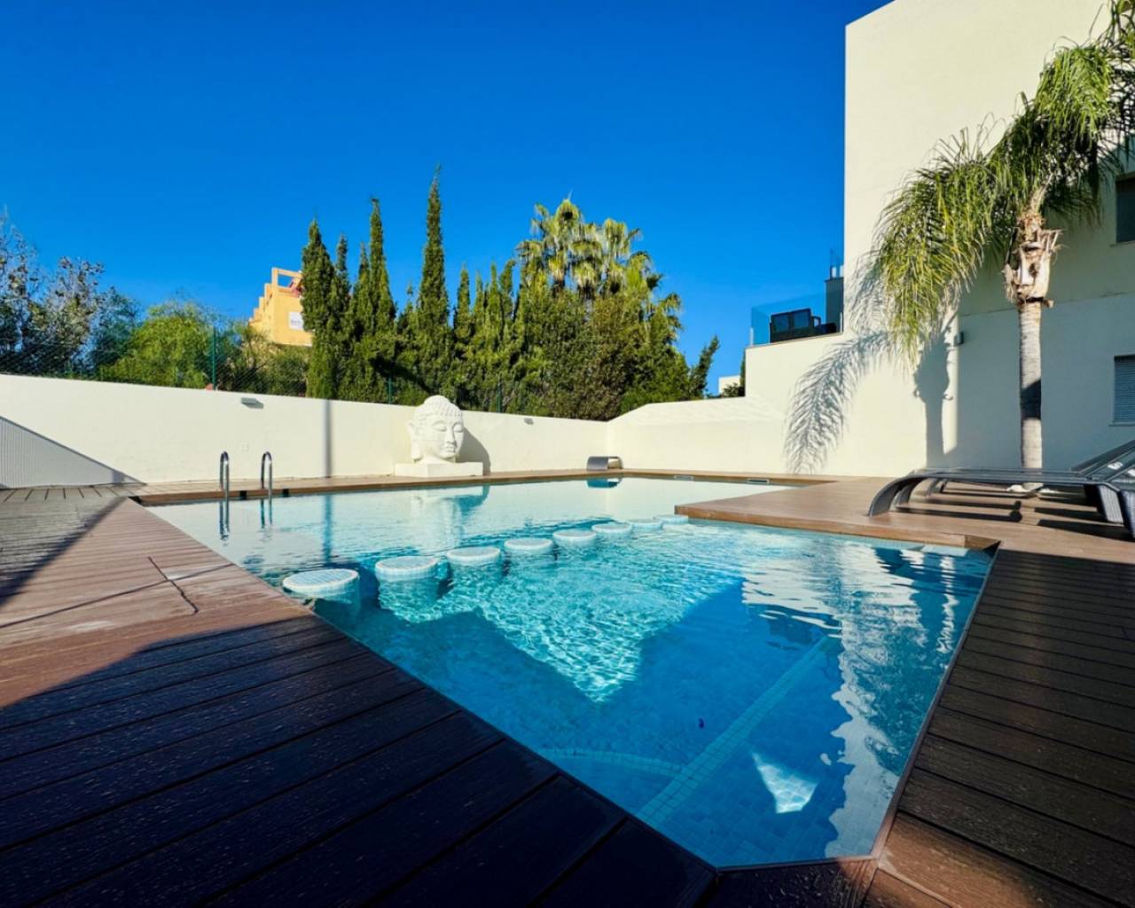 This ground floor apartment in Denia offers you a unique opportunity to live just steps away from the beautiful Playa Estanyo. With a private garden and direct access to the beach through a lockable gate with outdoor shower, here you will experience the ultimate vacation feeling in your own apartment. The secure front door gives access to a bright living room with a fully equipped American kitchen, which is perfectly connected to the garden thanks to its open layout and large windows. The apartment has a comfortable master bedroom with built-in closets and an ensuite bathroom, a second double bedroom with also built-in closets, and a third smaller bedroom. In addition, there is a separate bathroom with shower, ideal for guests or family members. The gated complex offers excellent facilities, including a large communal pool with a separate children's pool and paved outdoor areas for sports and games. All you have to worry about is relaxing, as the apartment is being sold fully furnished and is move-in ready. This apartment is not only perfect as a second home, but also offers excellent rental opportunities thanks to the available rental license. With a proven rental income of €12,000 during the summer months alone, it is an investment that can pay for itself.g Don't miss this opportunity to live or invest in one of the most beautiful coastal areas of Denia. IBI 500€, Basura 120€, community 70€/m