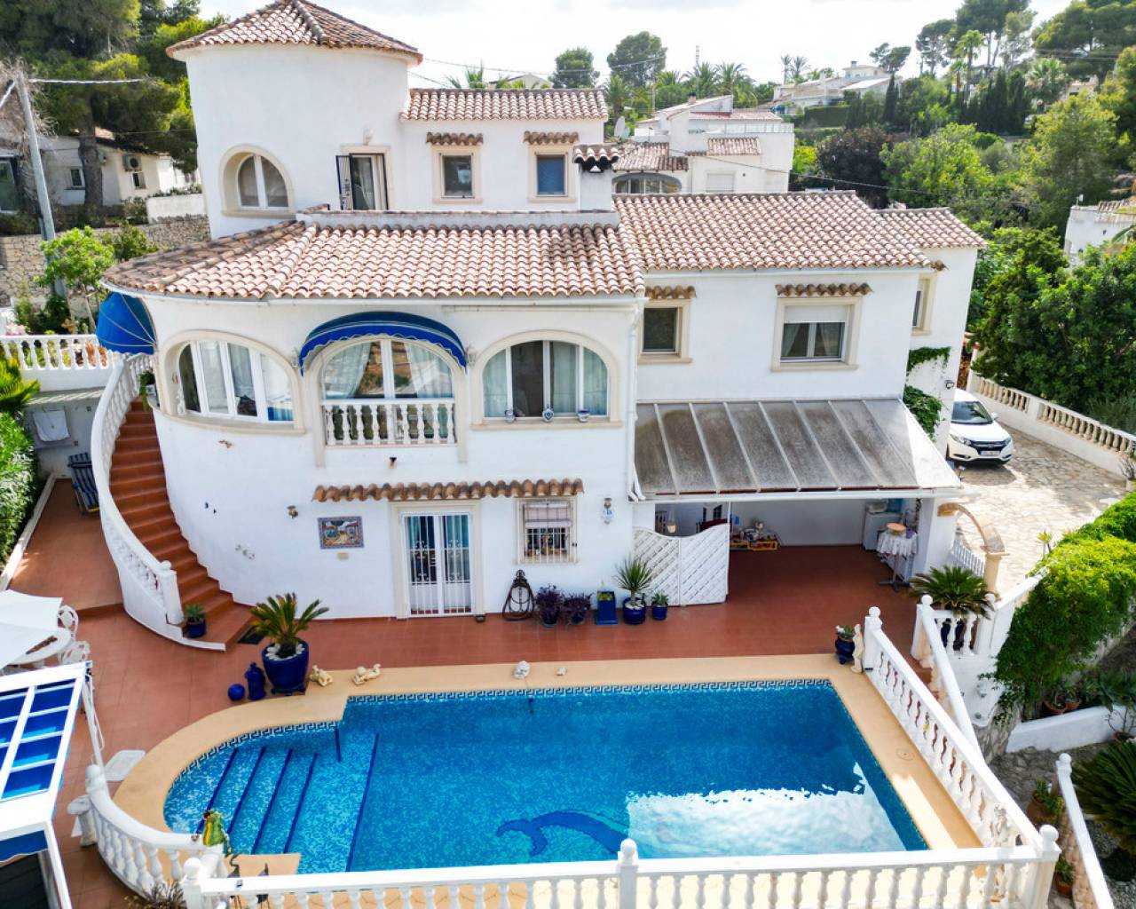 Located in one of the most sought-after locations on the Costa Blanca – along the picturesque coastal road between Calpe and Moraira – this spacious and characterful villa is just a few meters from the idyllic Baladrar bay. Here, you can combine the best of both worlds: tranquility and nature with all the comforts and amenities at your fingertips. Layout and ComfortThe property is divided into two fully independent living areas, ideal for large families, guest accommodation, or rental. The main area features: 2 spacious bedrooms3 fully equipped bathroomsA cozy living room with a fireplace and multiple seating areasA glass-covered terrace with panoramic views of the surrounding landscapeA modern, semi-open American-style kitchen with an adjoining storage roomA charming multifunctional space, perfect as a dining room or libraryFrom this space, an internal staircase leads to a upper floor, ideal as an office or extra bedroom. This area includes: A large en-suite bathroomAccess to a spacious terrace with views of the sea and hillsThe lower level is fully independent, ideal as a guest accommodation and includes: A cozy living room with an American kitchen2 bedroomsA spacious bathroomA garage with additional storage spaceThe plot offers ample space and privacy. The outdoor area has been carefully landscaped and includes: A large private swimming pool with a sun terrace, outdoor shower, and a cozy outdoor barDiverse seating areas and lounges spread across the groundsA landscaped Mediterranean garden with fruit trees, flowers, cacti, and native plantsParking space for 2 to 3 vehicles on the propertyWithin walking distance, you will find the charming Baladrar bay, known for its natural beauty and popular beach restaurant that is open year-round. Just 1 km further, there is a small shopping center with a supermarket and various boutiques. In the immediate area, you will encounter a wide selection of restaurants offering both Mediterranean and international cuisine. This property is not just a home, but a lifestyle. Whether you are looking for a permanent residence, a second home, or an investment property with rental potential – this villa offers a unique combination of location, space, charm, and comfort. Viewings by appointment. Contact us for more information or to schedule a visit.